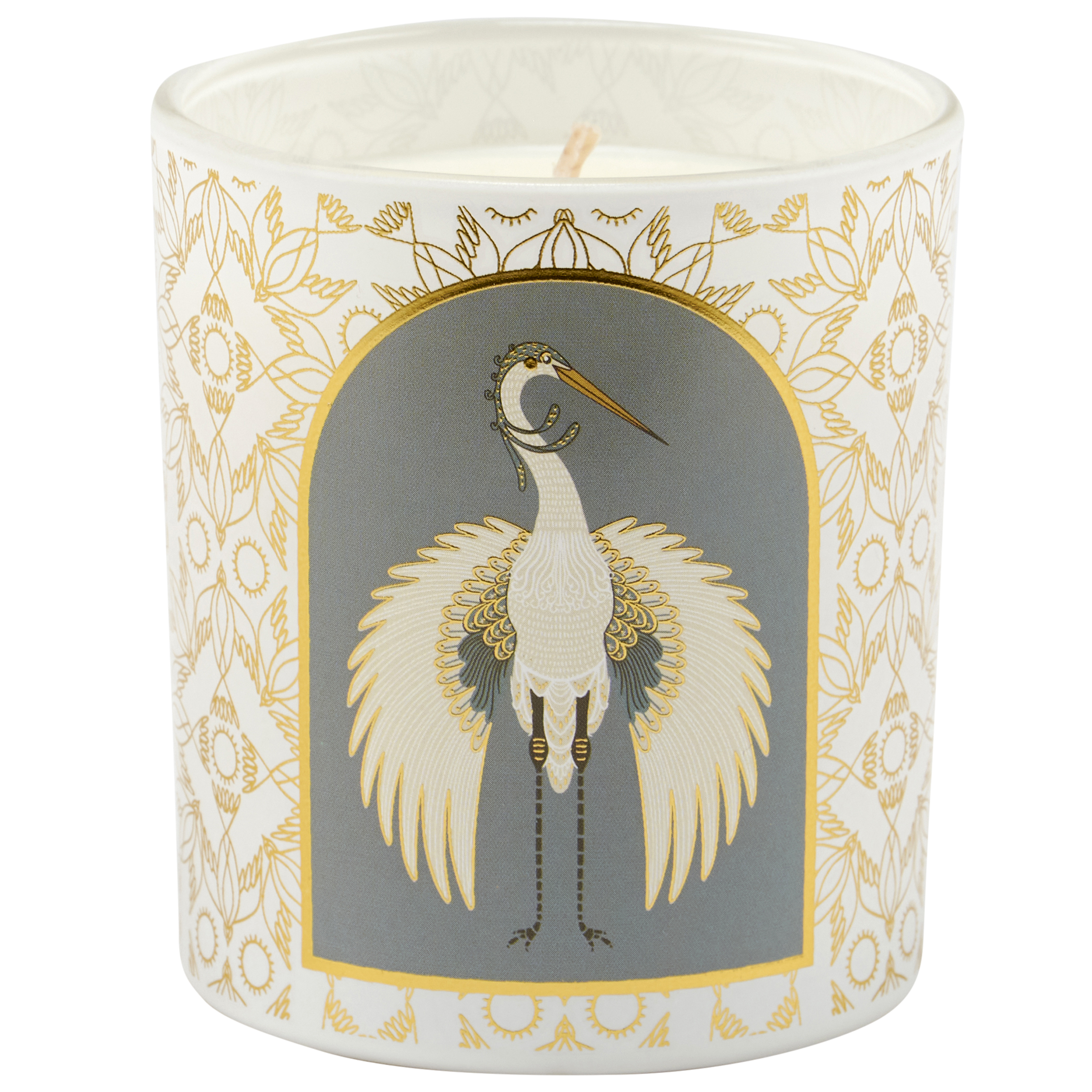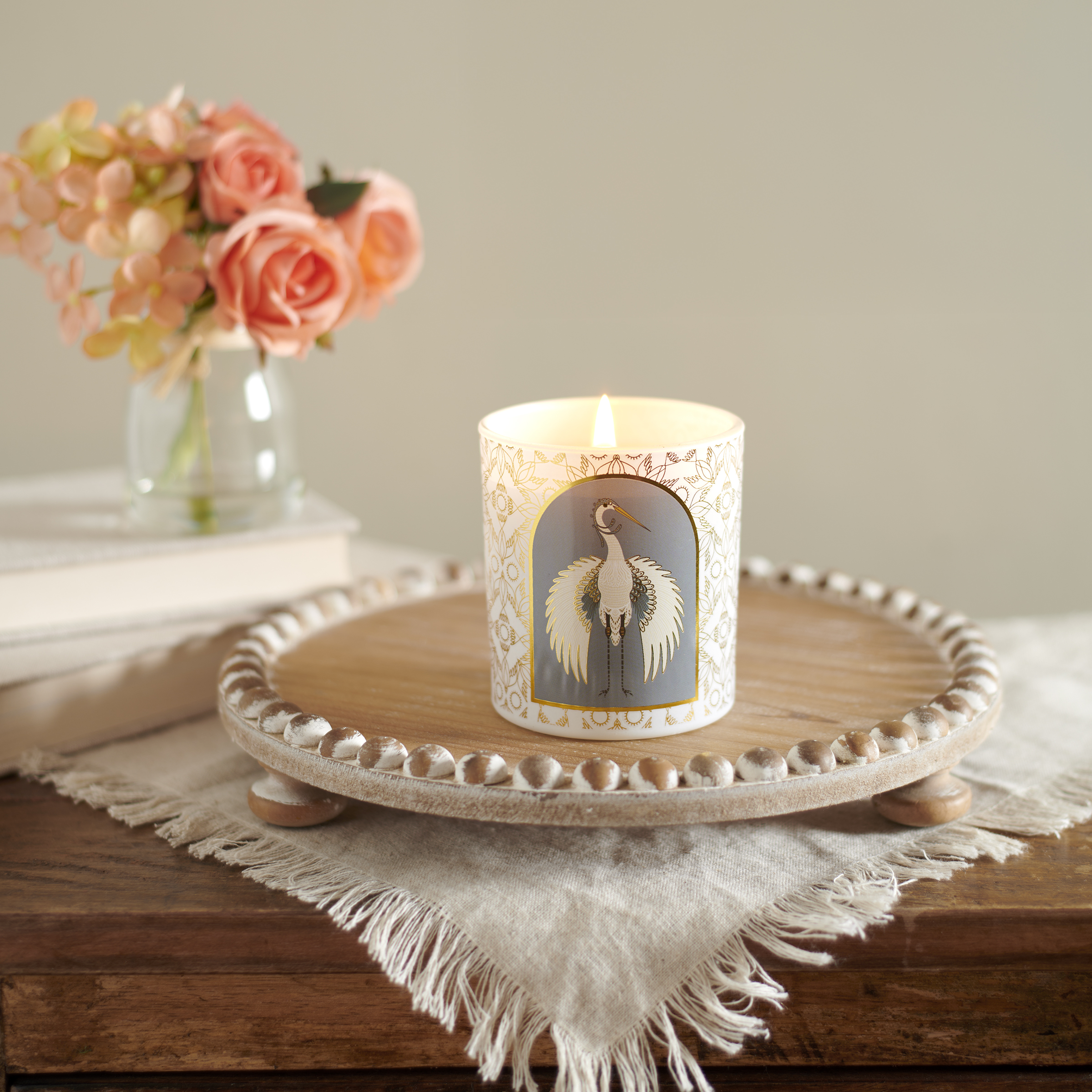 A candle from our Art Nouveau Collection displaying an art nouveau inspired crane design and full wrap-around bird pattern with metallic gold accents on frosted glass. Art nouveau design is replicated from original hand illustrated artwork. Candle features soy-based wax and cotton wick with 35 hours of burn time activating a calming Sage Mint scent. Our Nouveau Crane candle includes a dust cover and plastic lid for protection and enhanced appearance on store displays. A stylish home accent that is great for gifting.