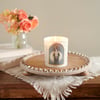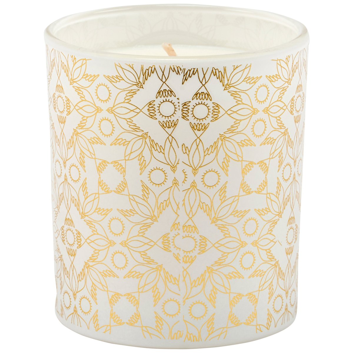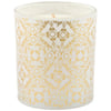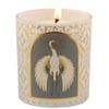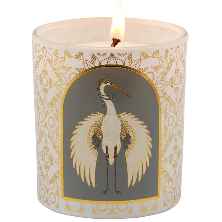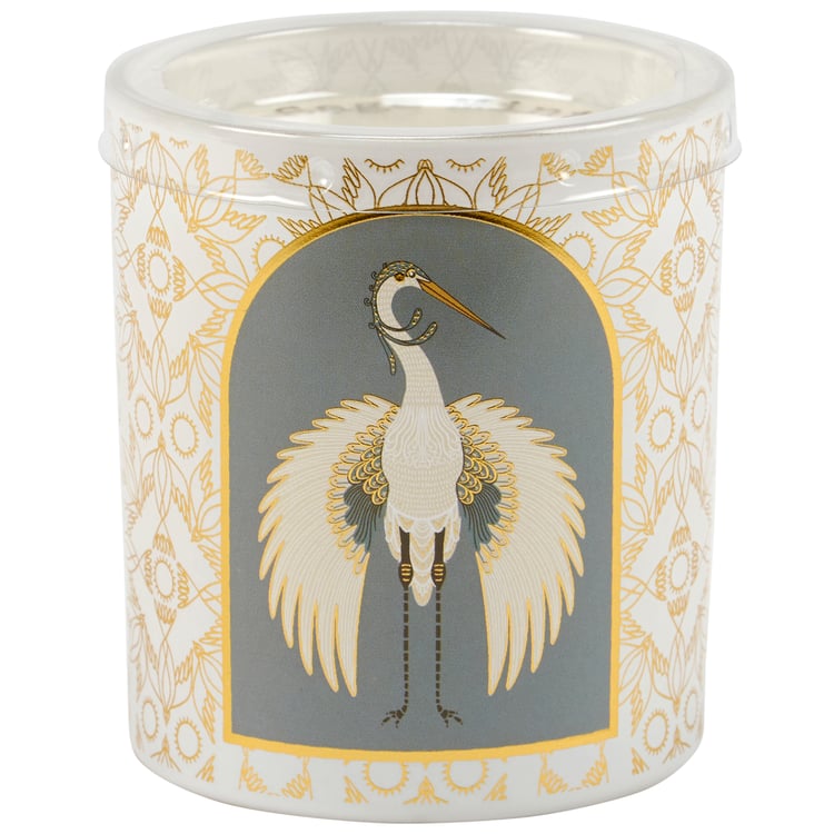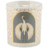 A candle from our Art Nouveau Collection displaying an art nouveau inspired crane design and full wrap-around bird pattern with metallic gold accents on frosted glass. Art nouveau design is replicated from original hand illustrated artwork. Candle features soy-based wax and cotton wick with 35 hours of burn time activating a calming Sage Mint scent. Our Nouveau Crane candle includes a dust cover and plastic lid for protection and enhanced appearance on store displays. A stylish home accent that is great for gifting.