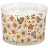 A jar candle from our Botanical Collection displaying a full wrap-around design of flowers inspired by pressed florals in an orange color palette on frosted white glass. Candle features soy-based wax and 3 fabric wicks with 30 hours of burn time activating a calming French Vanilla scent. Our Orange Flowers jar candle includes a dust cover and plastic lid for protection and polished appearance.