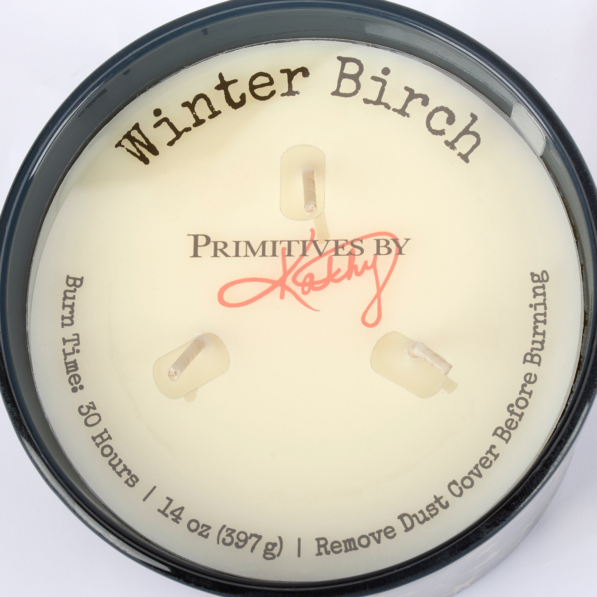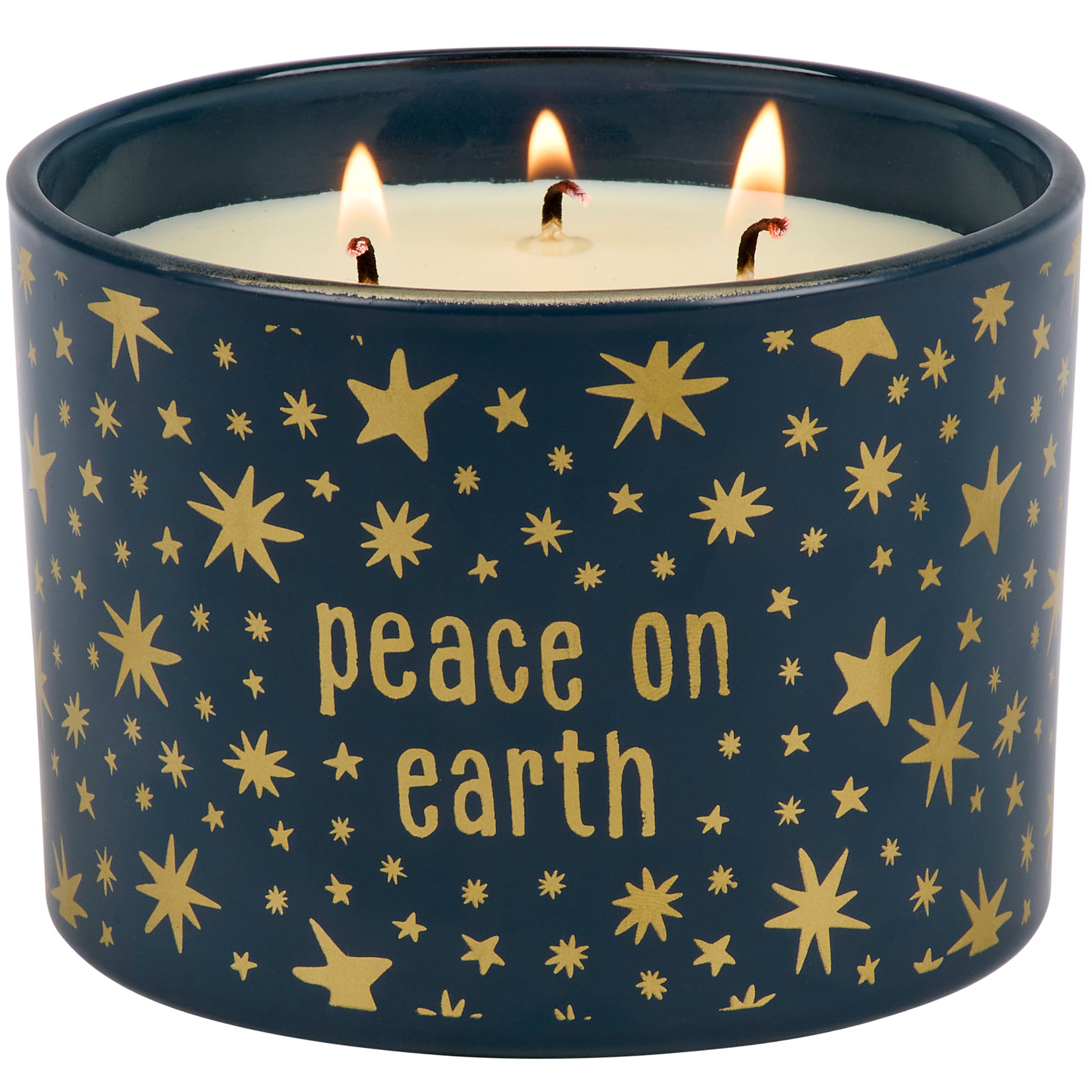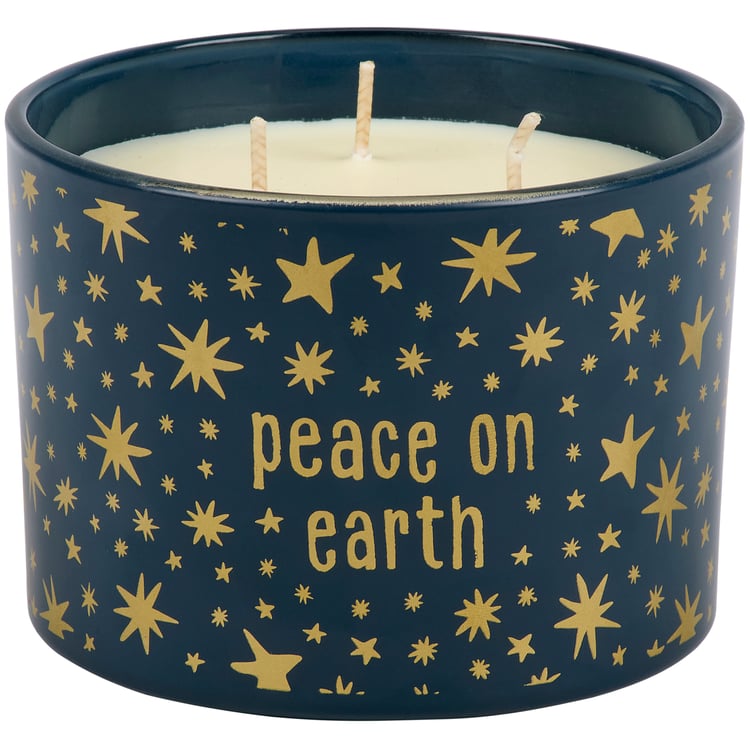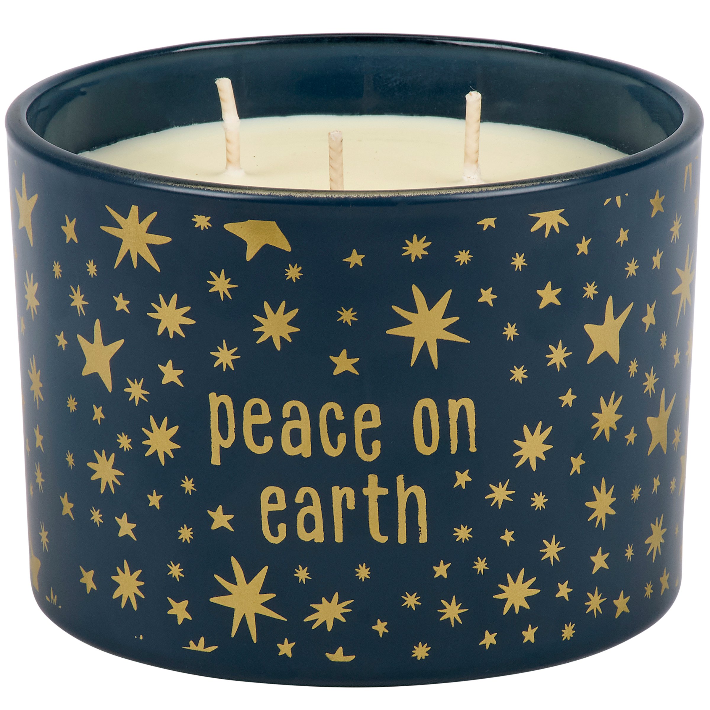 A candle from our Christmas Collection featuring a double-sided design displaying a "Peace On Earth" sentiment surrounded by stars in gold on matte dark blue glass. This Christmas candle features soy-based wax and 3 fabric wicks with 30 hours of burn time activating a festive Winter Birch scent. Our Peace On Earth candle includes a dust cover and plastic lid for protection and enhanced appearance on store displays. A vintage Christmas home accent that is great for gifting and easily adds natural lighting and seasonal style to any home or work space.