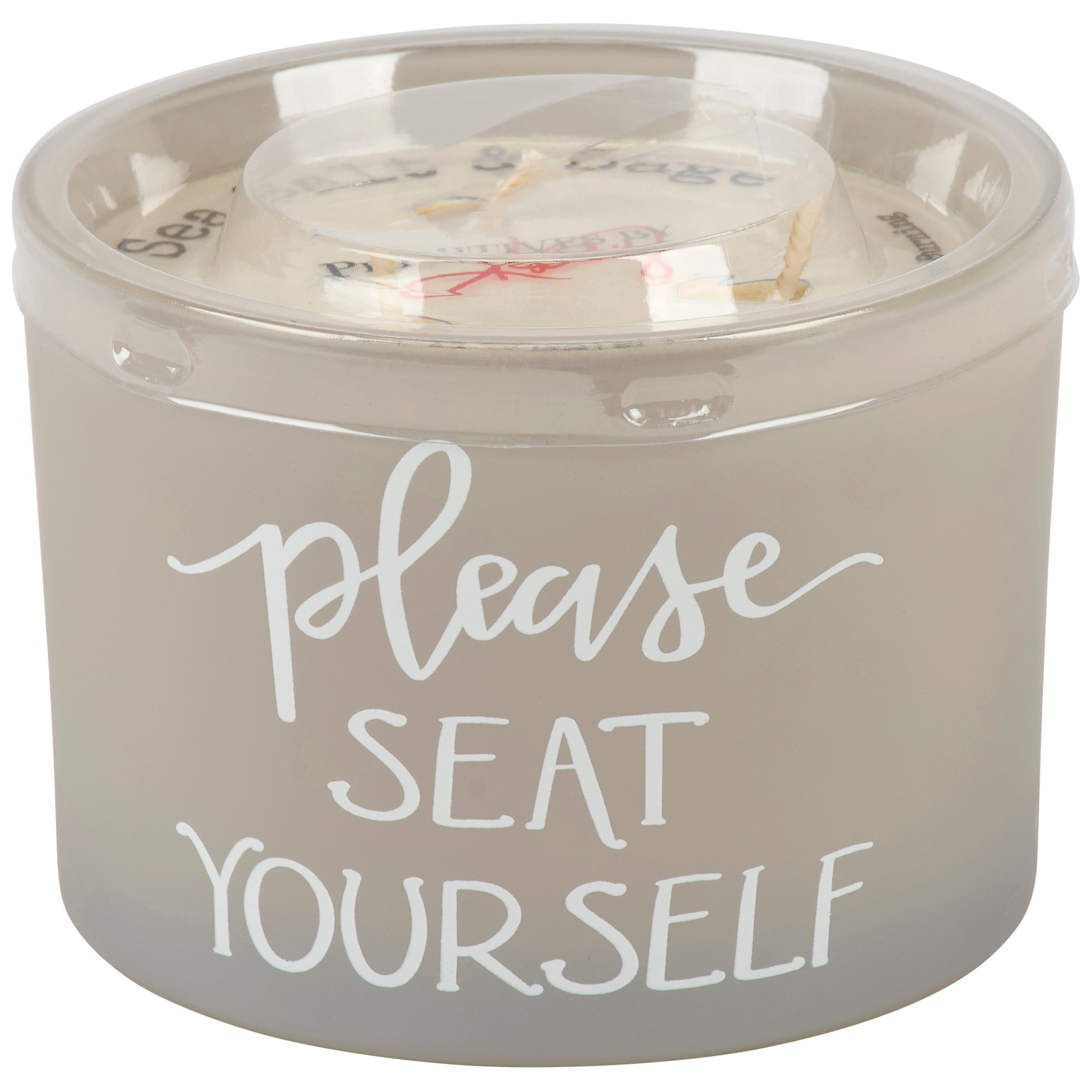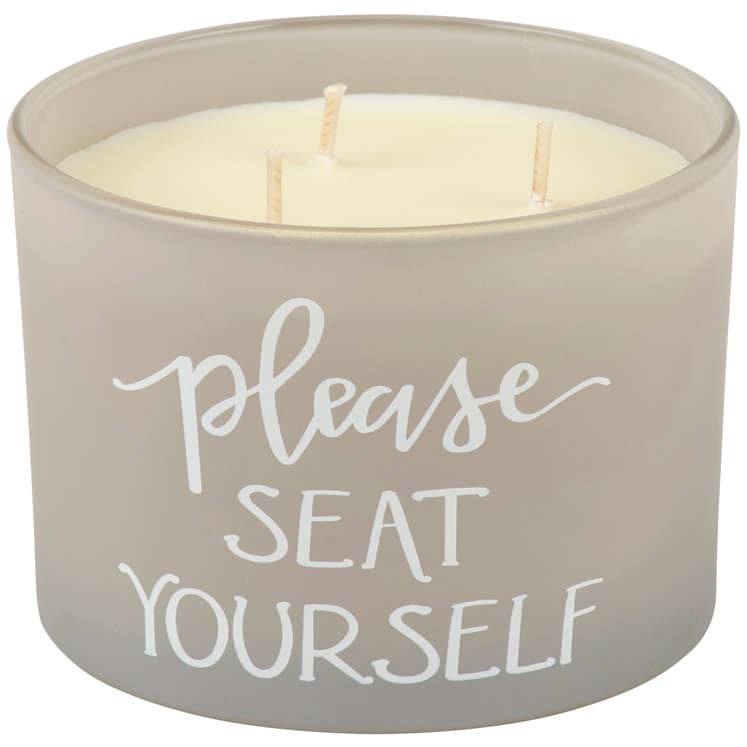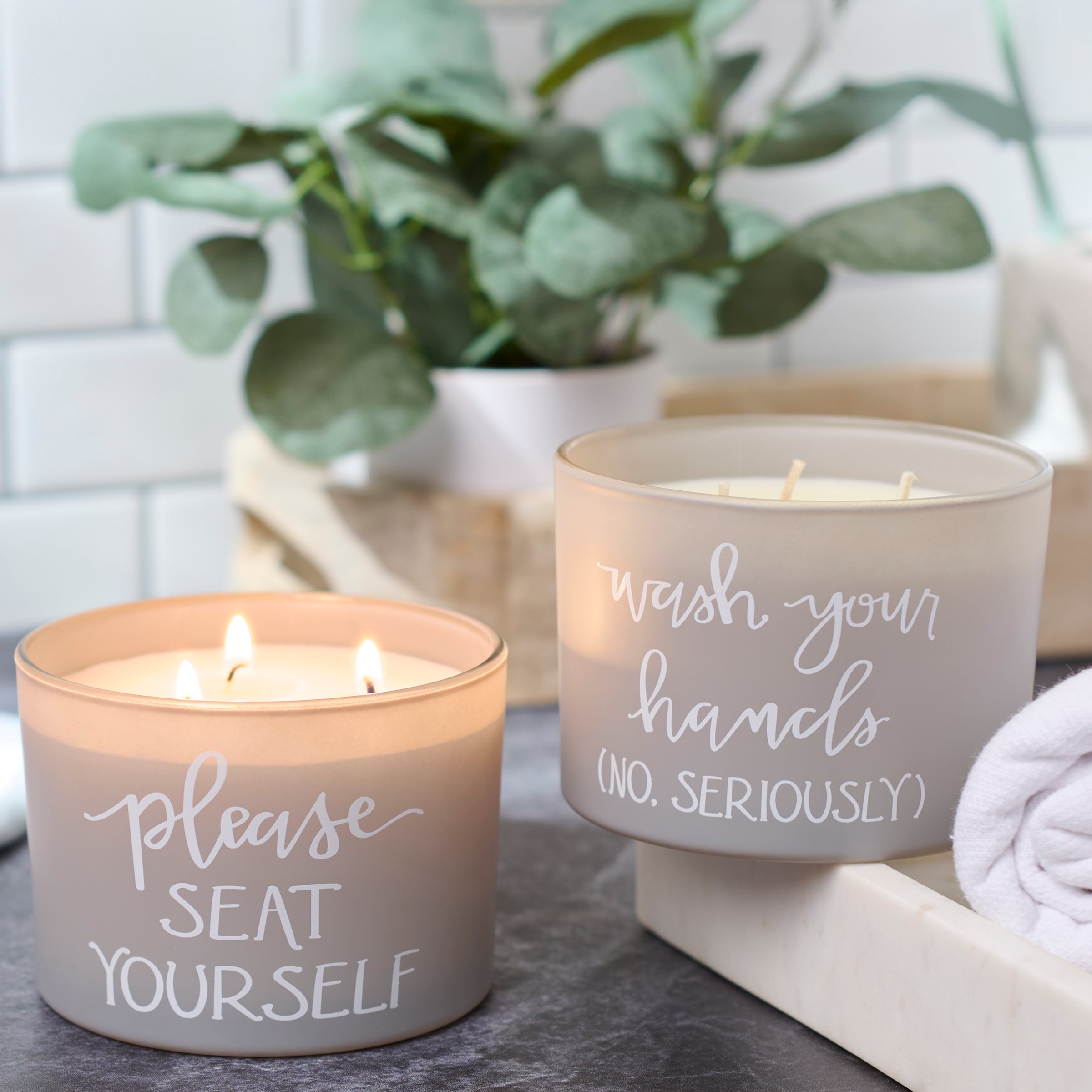 A candle from our Hand Illustrated Collection displaying a double-sided design of a funny bathroom inspired sentiment in an original hand illustrated style that reads "Please Seat Yourself." The sentiment style and neutral matte gray glass easily coordinates with a variety of bathroom decor. This funny bathroom candle features soy-based wax and 3 cotton wicks with 30 hours of burn time activating an invigorating Sea Salt & Sage scent. Our Please Seat Yourself candle includes a dust cover and plastic lid for protection and enhanced appearance on store displays. A fun gift perfect for adding personality to any bathroom.