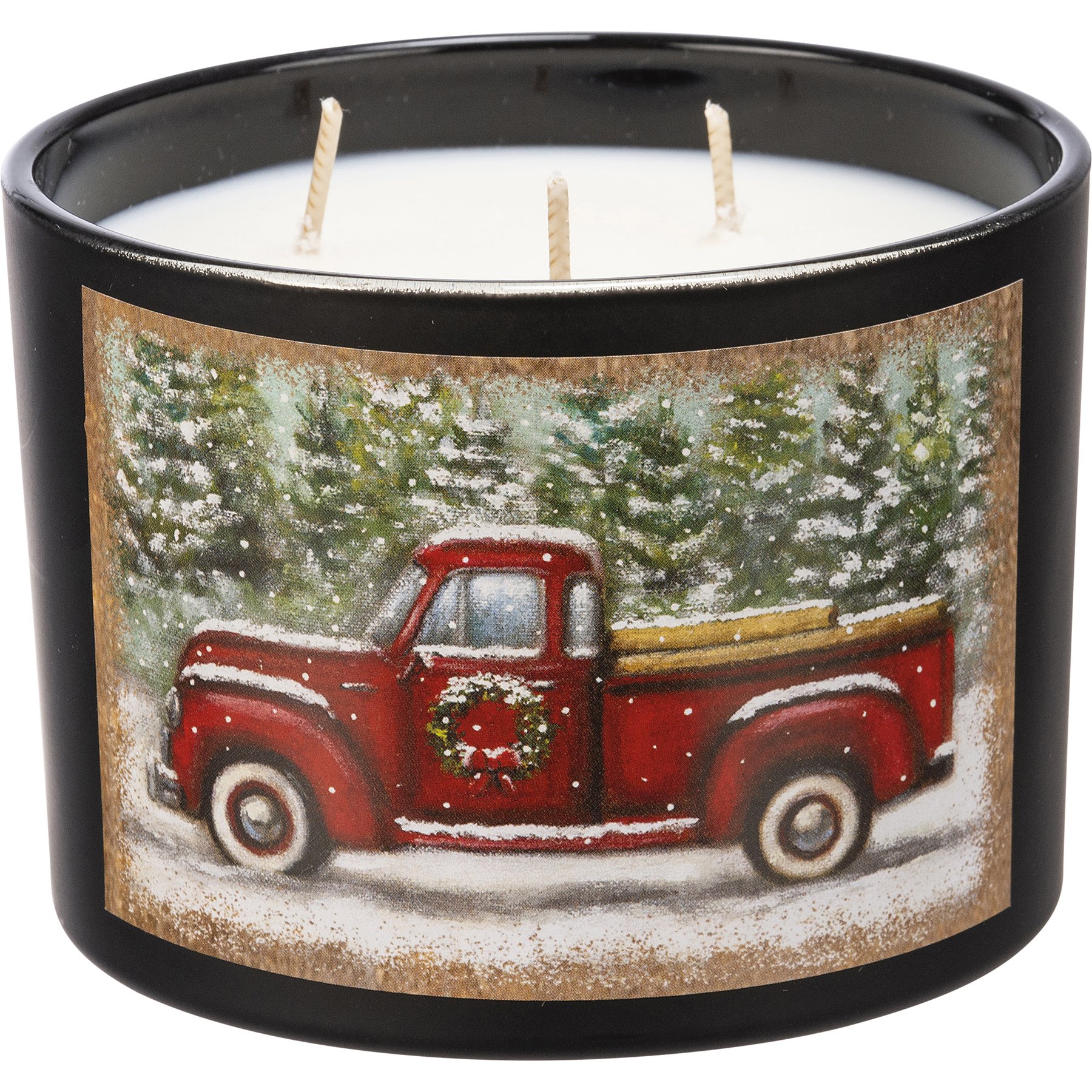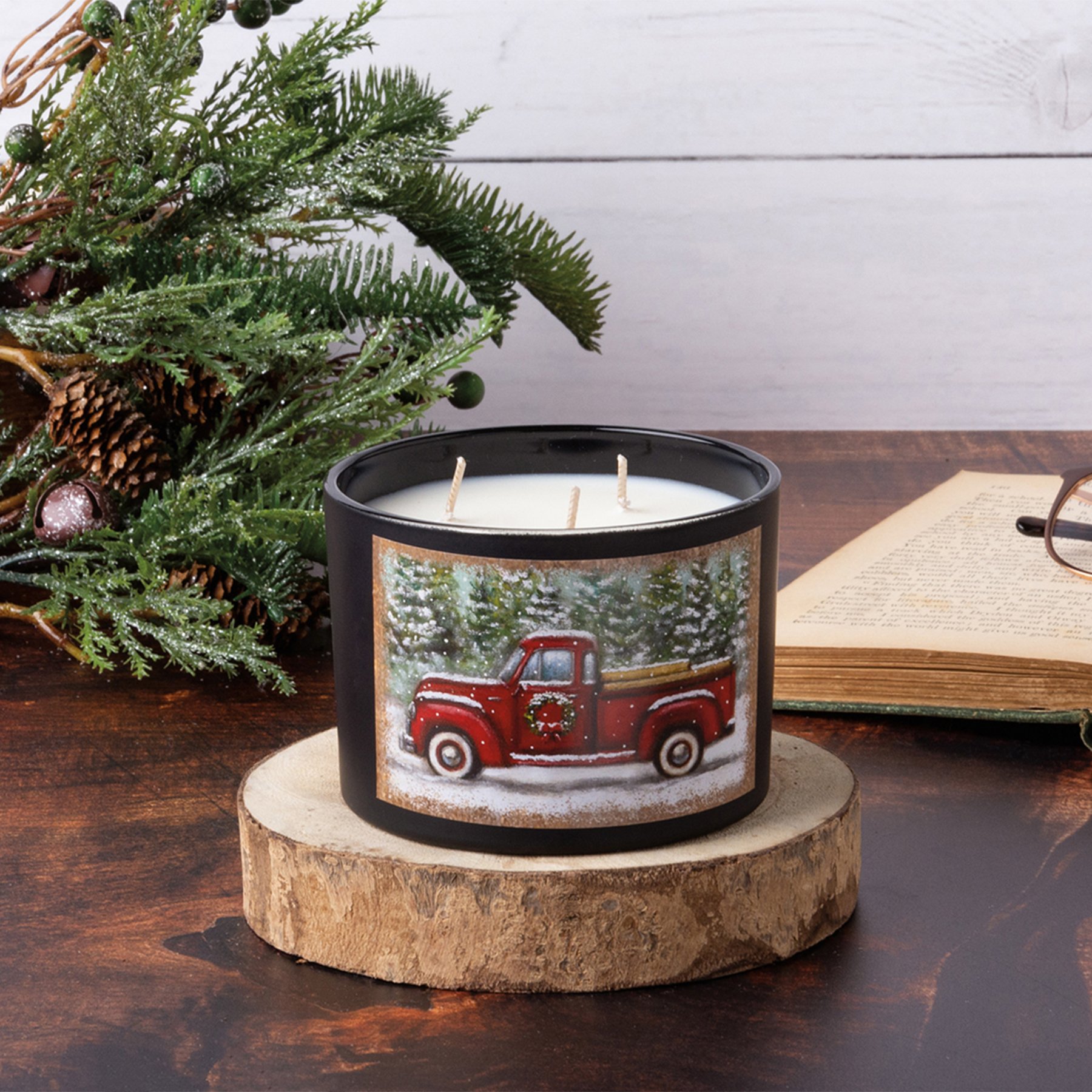 A matte black glass vessel holds this soy-based wax candle from our Christmas Collection which features a festive spruce scent and double-sided holiday red truck design. Design is replicated from original artwork painted onto burlap canvas, giving the art a unique depth and texture. Our Red Truck candle contains three cotton wicks for a total of 30 hours of burn time. Includes a plastic wax cover for protection and a polished look.
