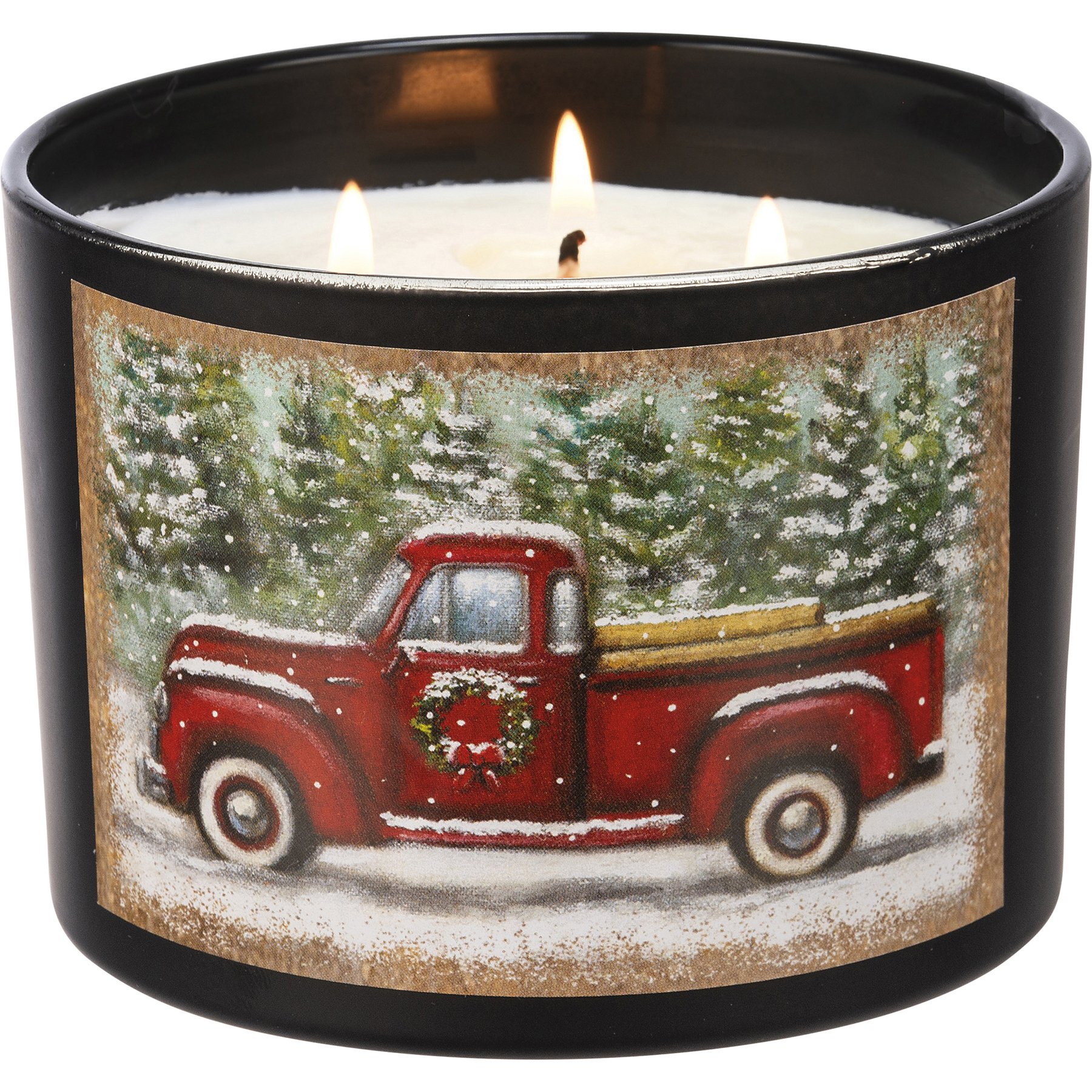 A matte black glass vessel holds this soy-based wax candle from our Christmas Collection which features a festive spruce scent and double-sided holiday red truck design. Design is replicated from original artwork painted onto burlap canvas, giving the art a unique depth and texture. Our Red Truck candle contains three cotton wicks for a total of 30 hours of burn time. Includes a plastic wax cover for protection and a polished look.