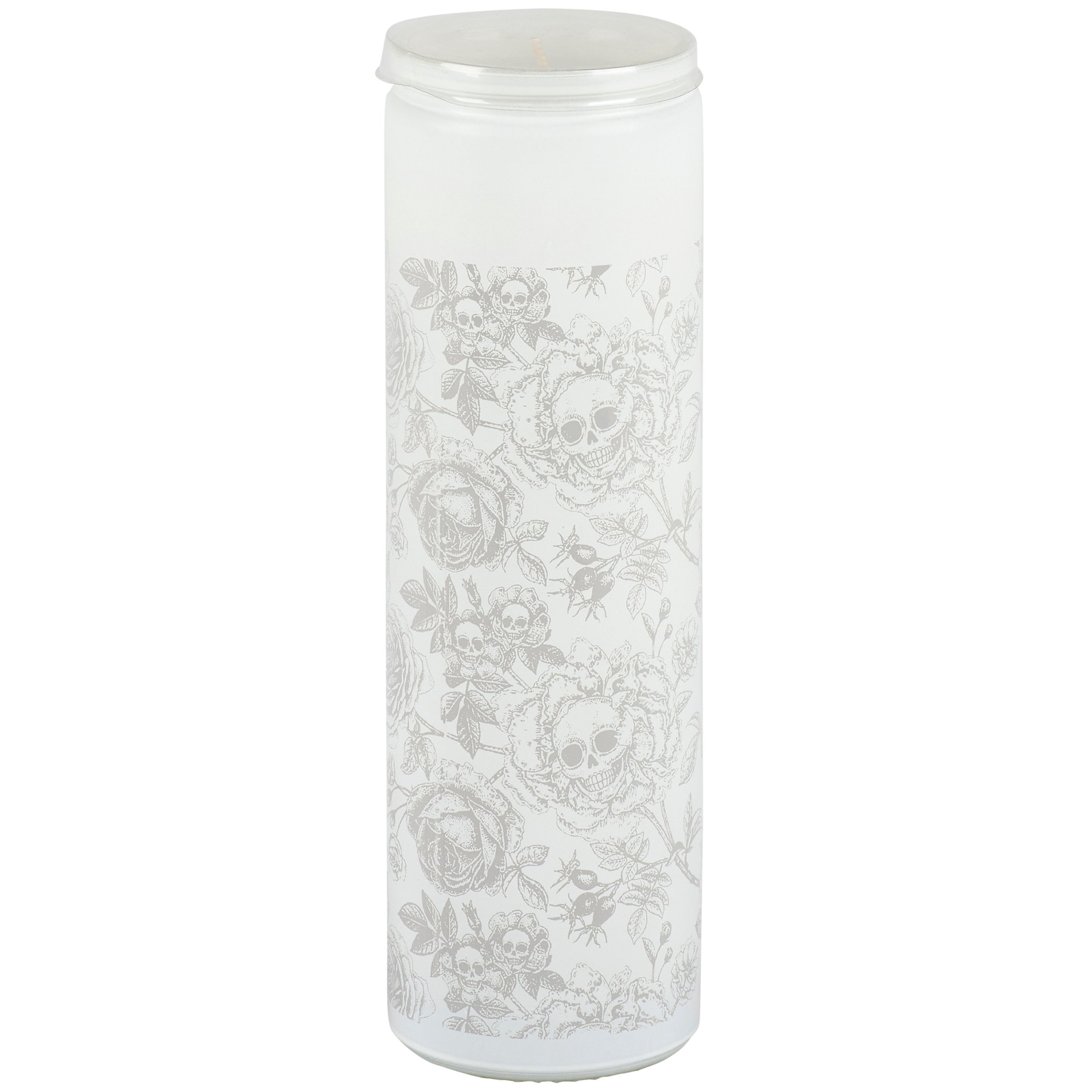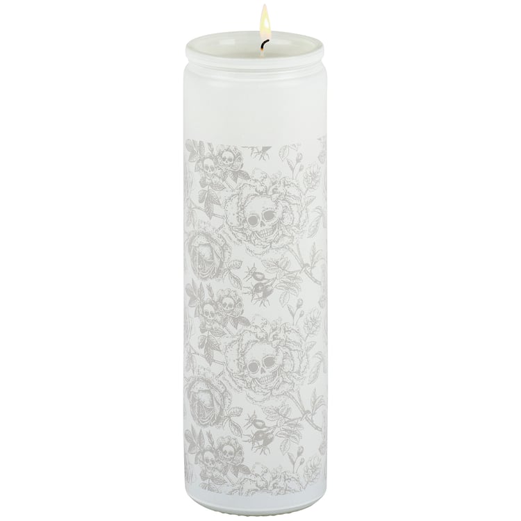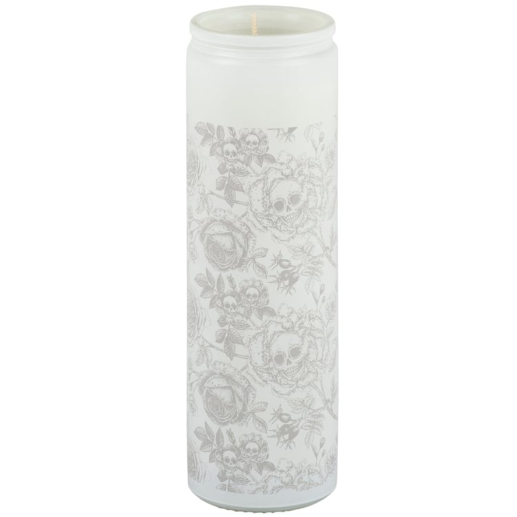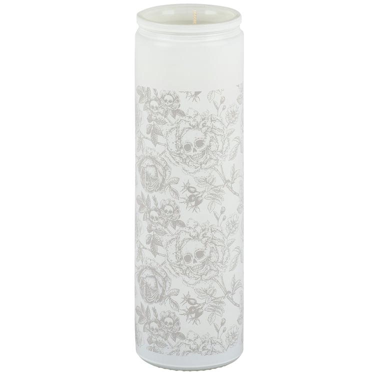 A candle from our Haunted White Collection displaying a full wrap-around design of skulls and roses on a tall opaque white glass jar. Rose skull design is in a spooky monochrome hand illustrated style. Seasonal candle features soy-based wax and a cotton wick with 80 hours of burn time activating a Rose scent. Our Rose Skull Flower candle includes a dust cover and plastic lid for protection and enhanced appearance on store displays. A moody Halloween home accent perfect for adding natural lighting to any living space.