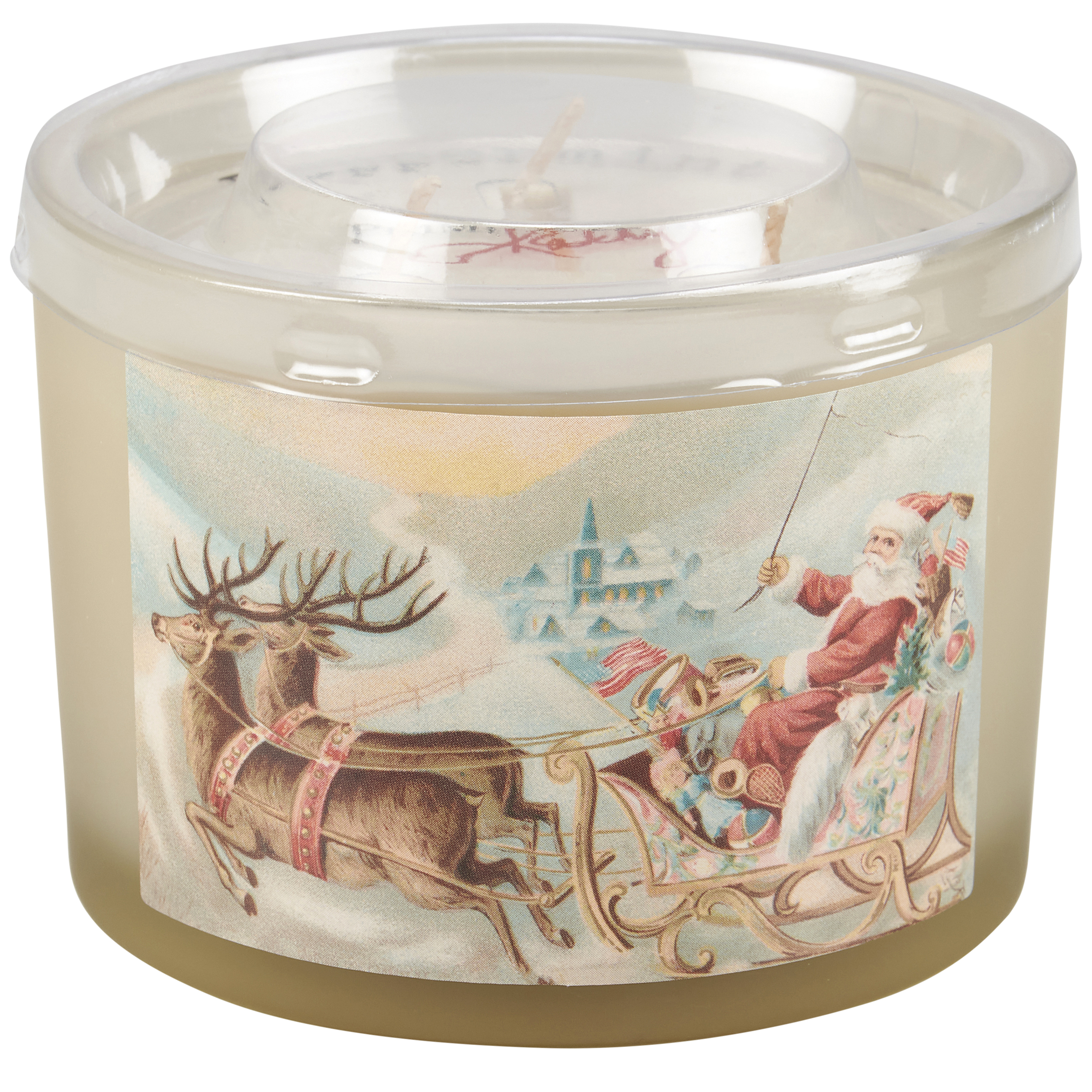 A jar candle from our Christmas Collection displaying a double-sided design of Santa and his sleigh in a vintage art style on frosted white glass. Seasonal candle features soy-based wax and 3 fabric wicks with 30 hours of burn time activating a holiday Peppermint scent. Our Santa Sleigh jar candle includes a dust cover and plastic lid for protection and polished appearance. A Christmas-themed home accent that is great for gifting.