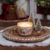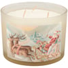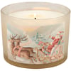A jar candle from our Christmas Collection displaying a double-sided design of Santa and his sleigh in a vintage art style on frosted white glass. Seasonal candle features soy-based wax and 3 fabric wicks with 30 hours of burn time activating a holiday Peppermint scent. Our Santa Sleigh jar candle includes a dust cover and plastic lid for protection and polished appearance. A Christmas-themed home accent that is great for gifting.
