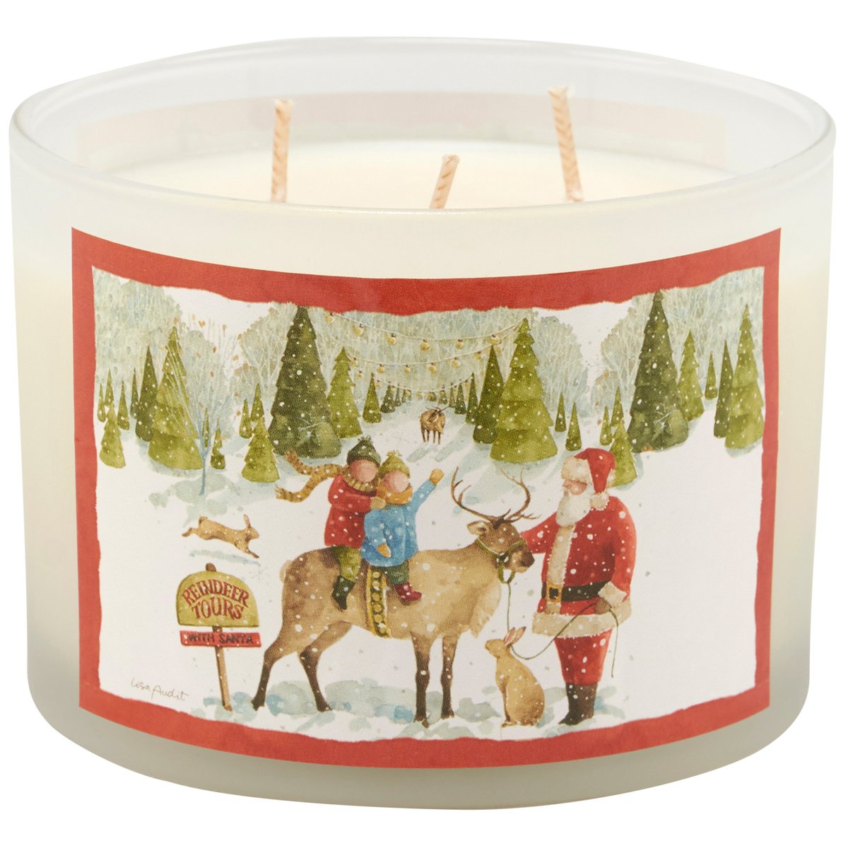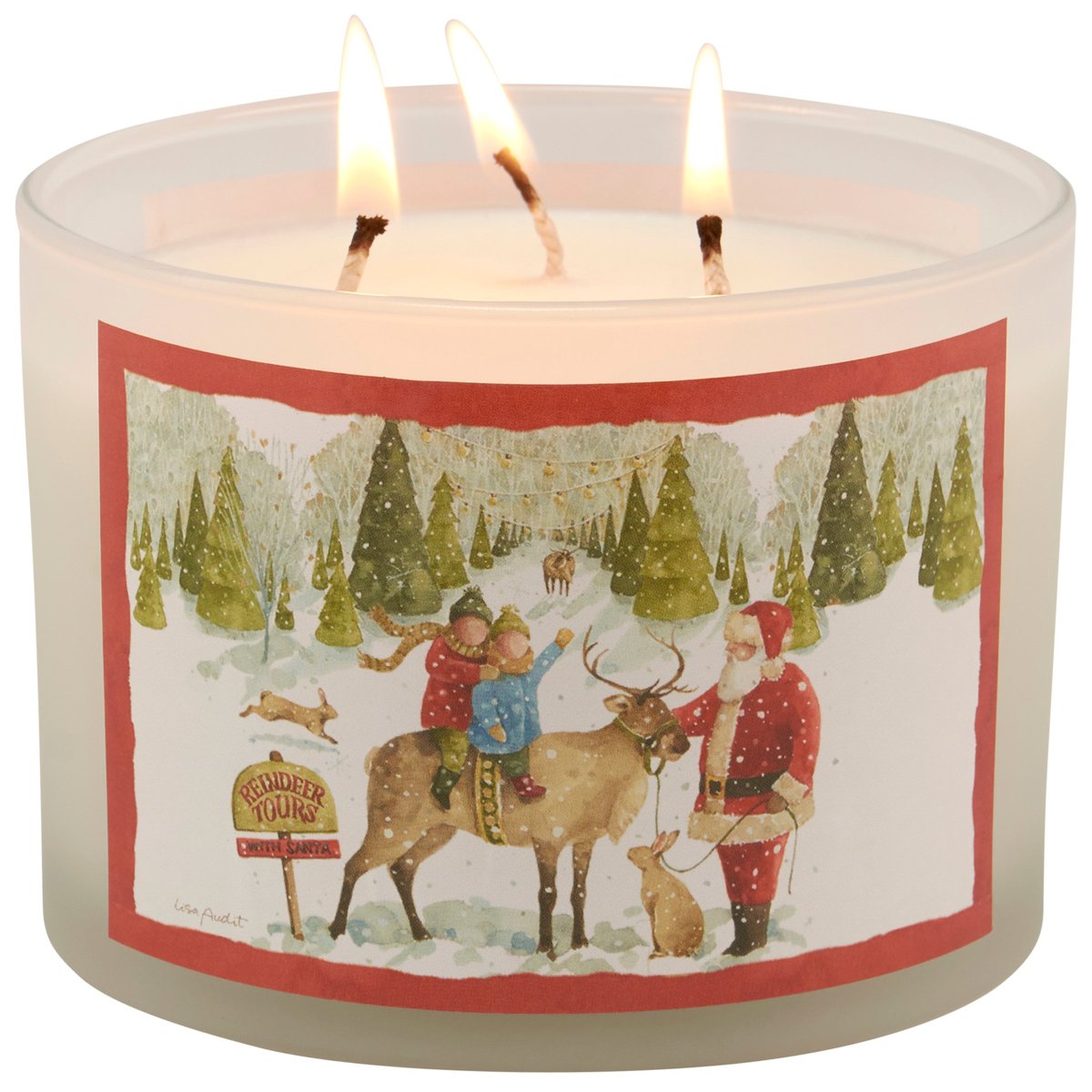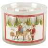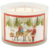 A candle from our Christmas Collection displaying a double-sided design of Santa and children riding a reindeer at a tree farm next to a sign that reads "Reindeer Tours With Santa" on frosted glass. Christmas design is replicated from original art hand painted in a delicate watercolor style. Seasonal candle features soy-based wax and 3 fabric wicks with 30 hours of burn time activating a Festive Spice scent. Our Santa's Tree Farm candle includes a dust cover and plastic lid for protection and enhanced appearance on store displays. A seasonal home accent that coordinates well with rustic home decor.