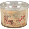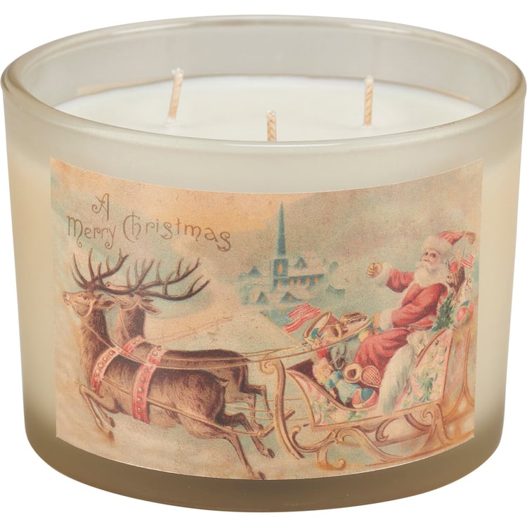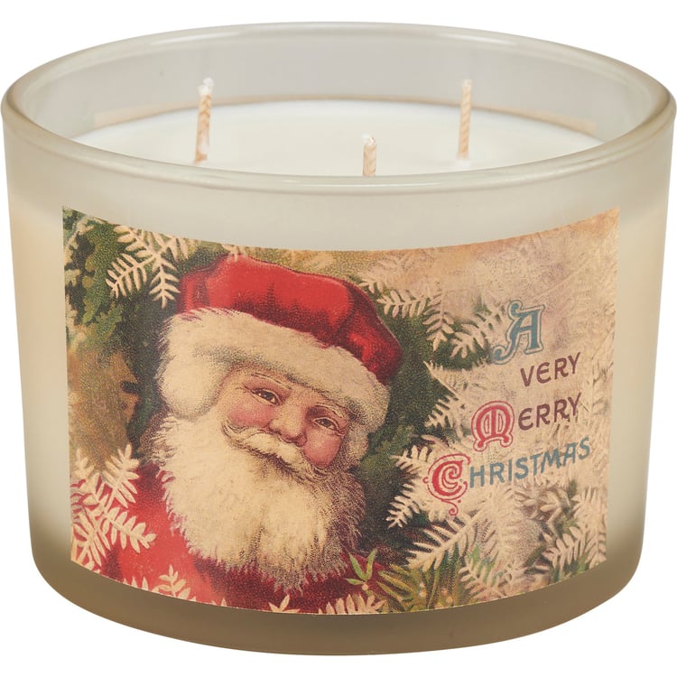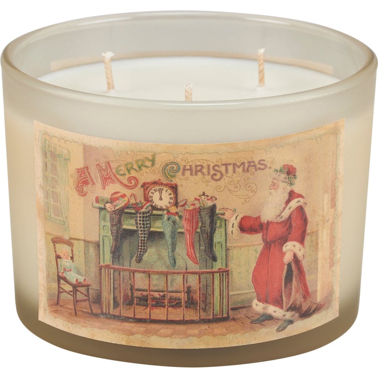 A set of four jar candles from our Christmas Collection displaying individual double-sided designs on a frosted glass jar. Each design features vintage scenes of Santa with various holiday sentiments. Candles feature soy-based wax and 3 fabric wicks with 30 hours of burn time activating a refreshing Evergreen or Peppermint scent. Two of each scent are included. Our Vintage Santas jar candle set includes dust covers and plastic lids for protection and polished appearance. A charming seasonal home accent set great for gifting.