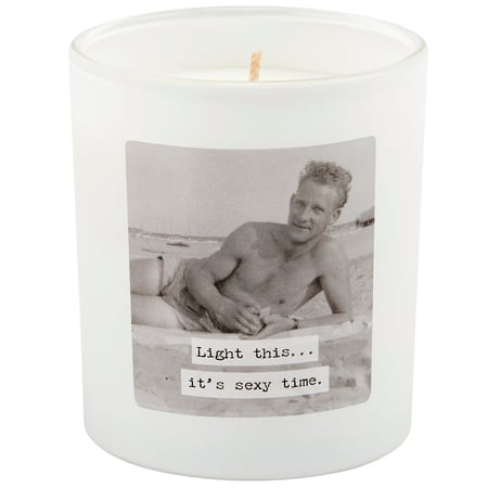 A candle from our Trash Talk By Annie Collection displaying a double-sided design of a vintage black and white photograph on frosted white glass complemented with a humorous sentiment that reads "Light This... It's Sexy Time." Candle features soy-based wax and a cotton wick with 35 hours of burn time activating a relaxing Vetiver scent. Our Sexy Time candle includes a dust cover and plastic lid for protection and polished appearance. A hilarious home accent that is great for everyday gifting.