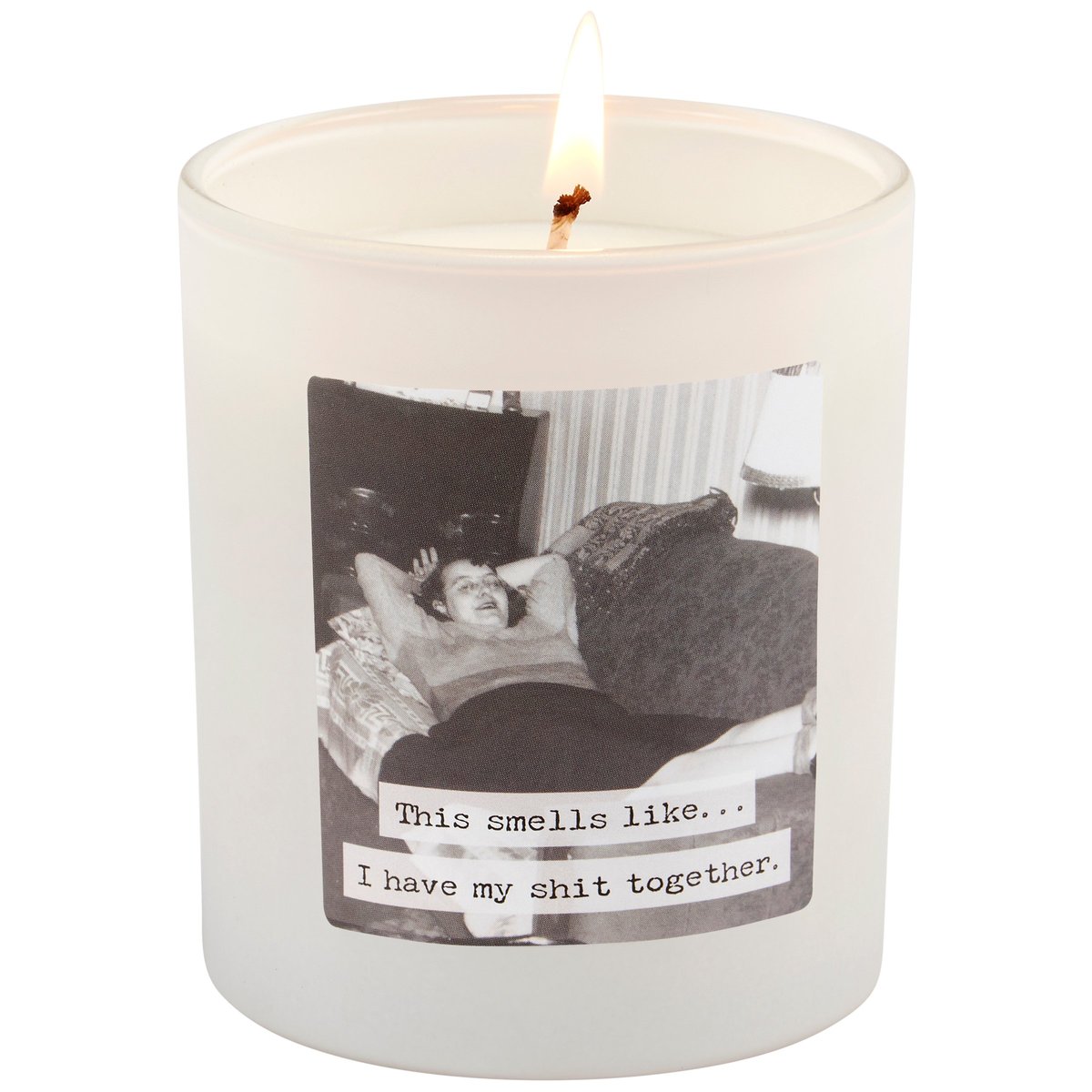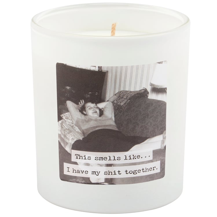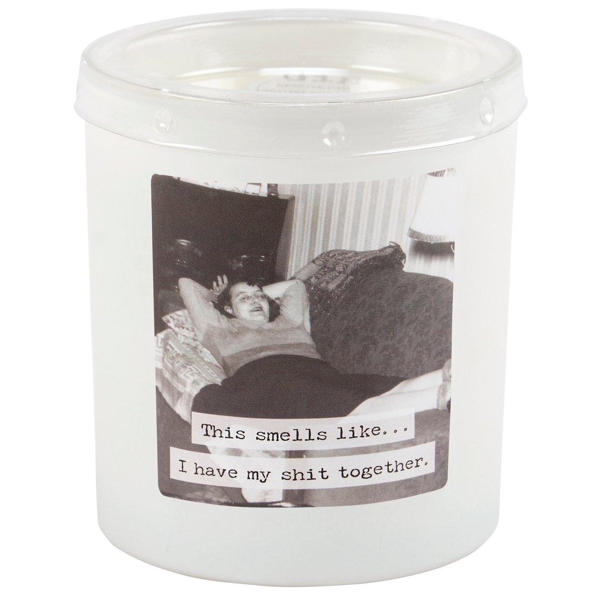 A jar candle from our Trash Talk By Annie Collection displaying a double-sided design of a vintage black and white photograph on frosted white glass complemented with a humorous sentiment that reads "This Smells Like... I Have My Shit Together." Candle features soy-based wax and cotton wick with 35 hours of burn time activating a calming Sea Salt & Sage scent. Our Smells Like jar candle includes a dust cover and plastic lid for protection and polished appearance. A hilarious home accent that is great for everyday gifting.