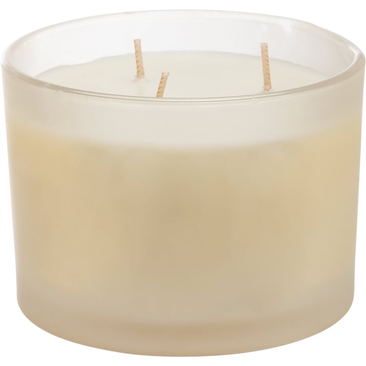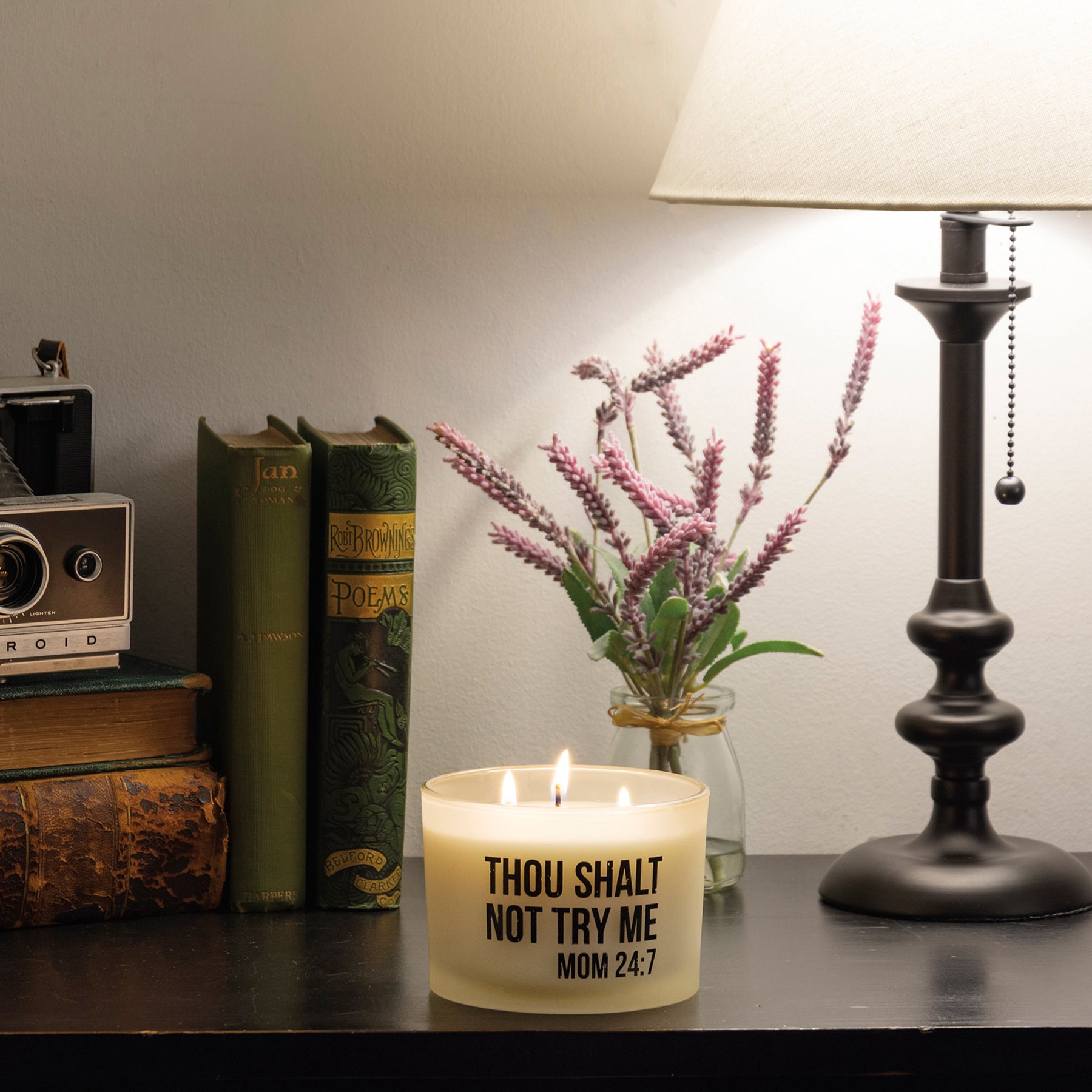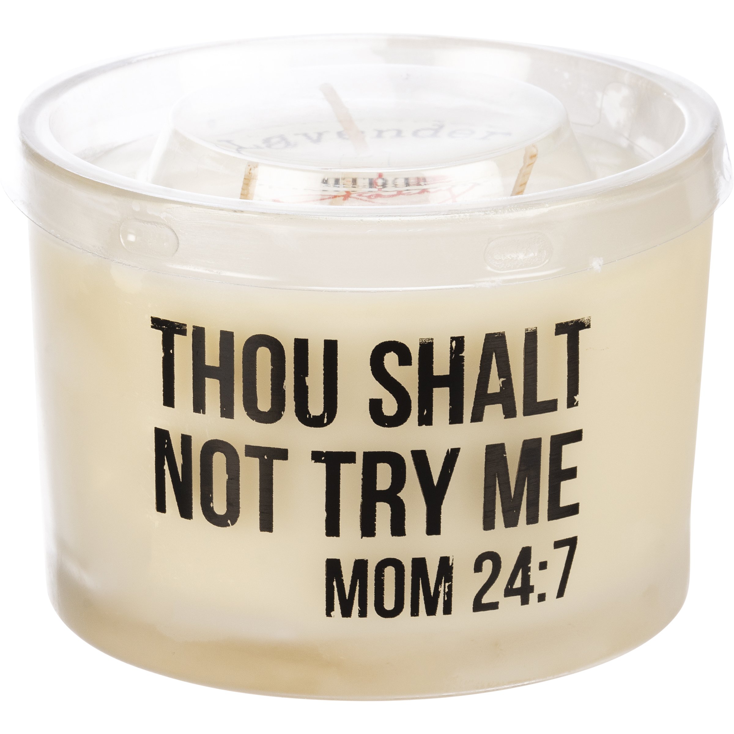 A frosted glass vessel holds this soy-based wax candle from our Box Sign Style Collection featuring a refreshing Lavender scent. Box sign style art features "Thou Shalt Not Try Me Mom 24:7" sentiment. This Thou Shalt Not candle is 14 oz. and contains three fabric wicks for a total of 30 hours of burn time. Includes a plastic wax cover for protection and a polished look.