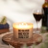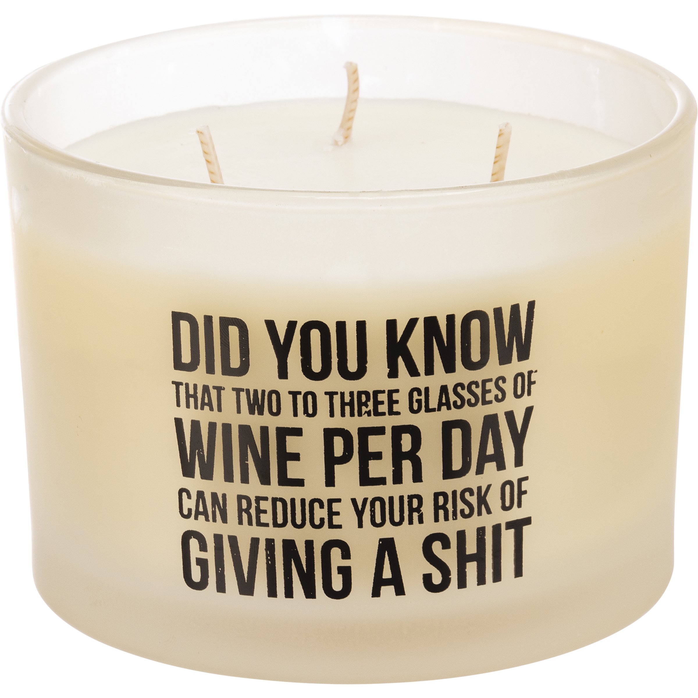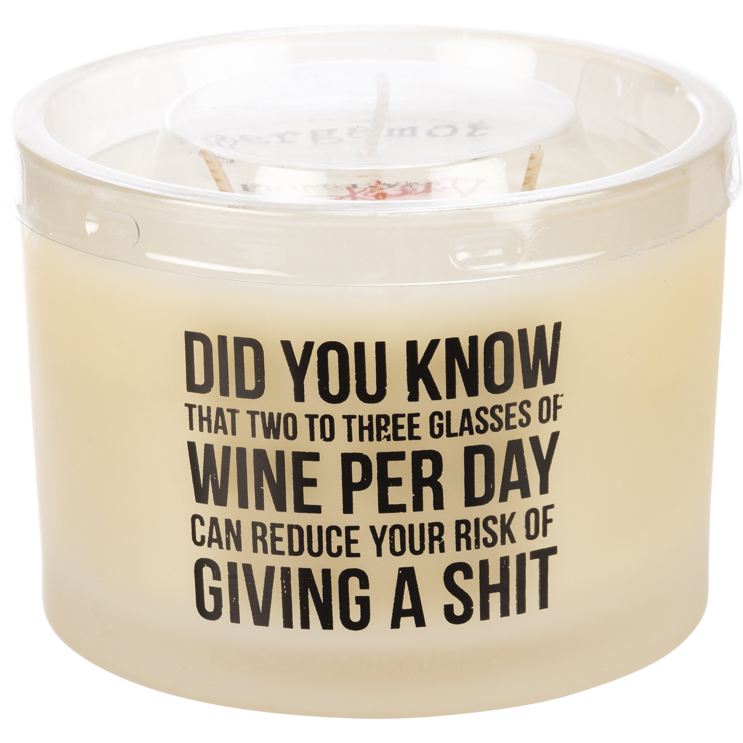 A frosted glass vessel holds this soy-based wax candle from our Box Sign Style Collection featuring a refreshing Bergamot scent. Box sign style art features "Did You Know That Two To Three Glasses Of Wine Per Day Can Reduce Your Risk Of Giving A Shit" sentiment. This Wine Per Day candle is 14 oz. and contains three fabric wicks for a total of 30 hours of burn time. Includes a plastic wax cover for protection and a polished look.