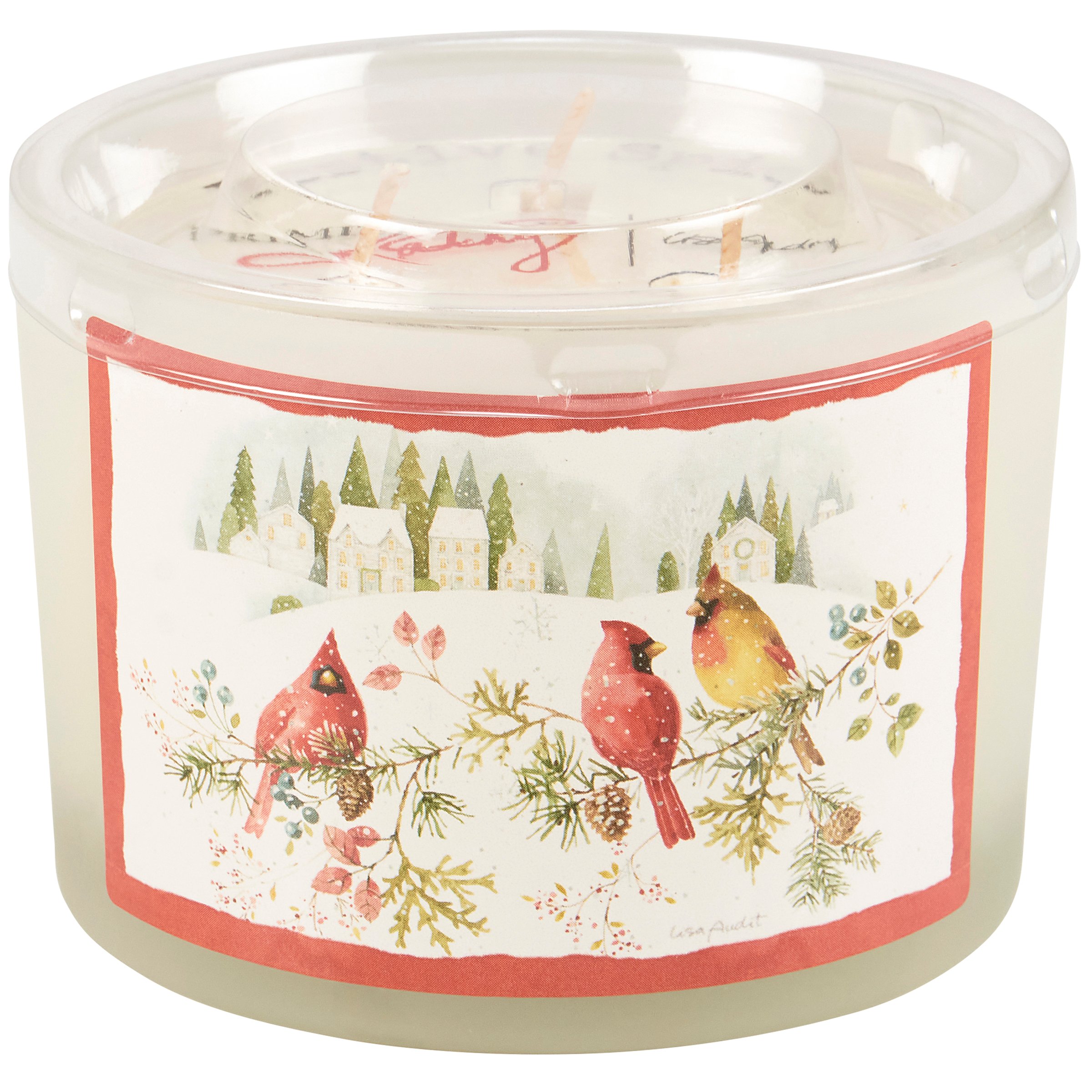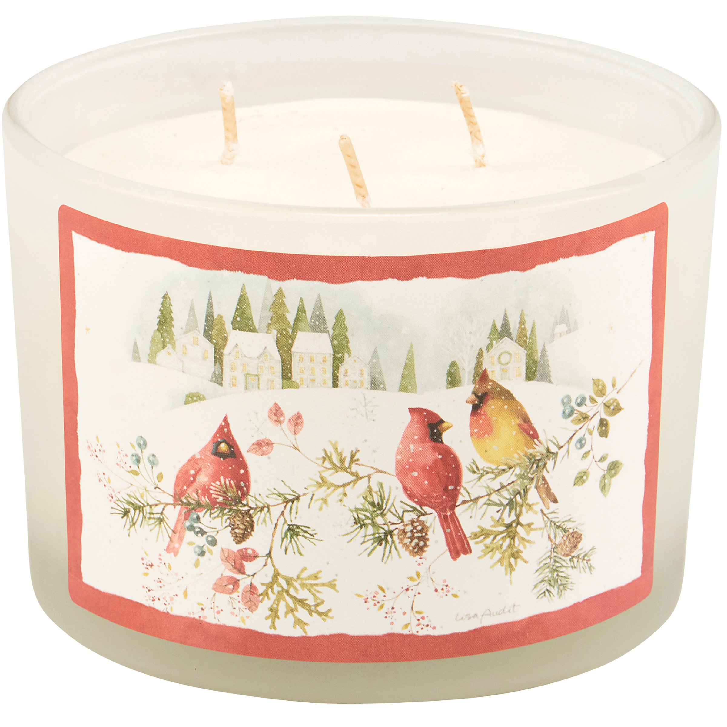 A jar candle from our Christmas Collection displaying a double-sided design of cardinals in a winter scene on frosted white glass. Design is replicated from original artwork hand painted in a delicate watercolor style. Seasonal candle features soy-based wax and 3 fabric wicks with 30 hours of burn time activating a Festive Spice scent. Our Winter Cardinal jar candle includes a dust cover and plastic lid for protection and polished appearance. A winter-themed home accent that is great for gifting.