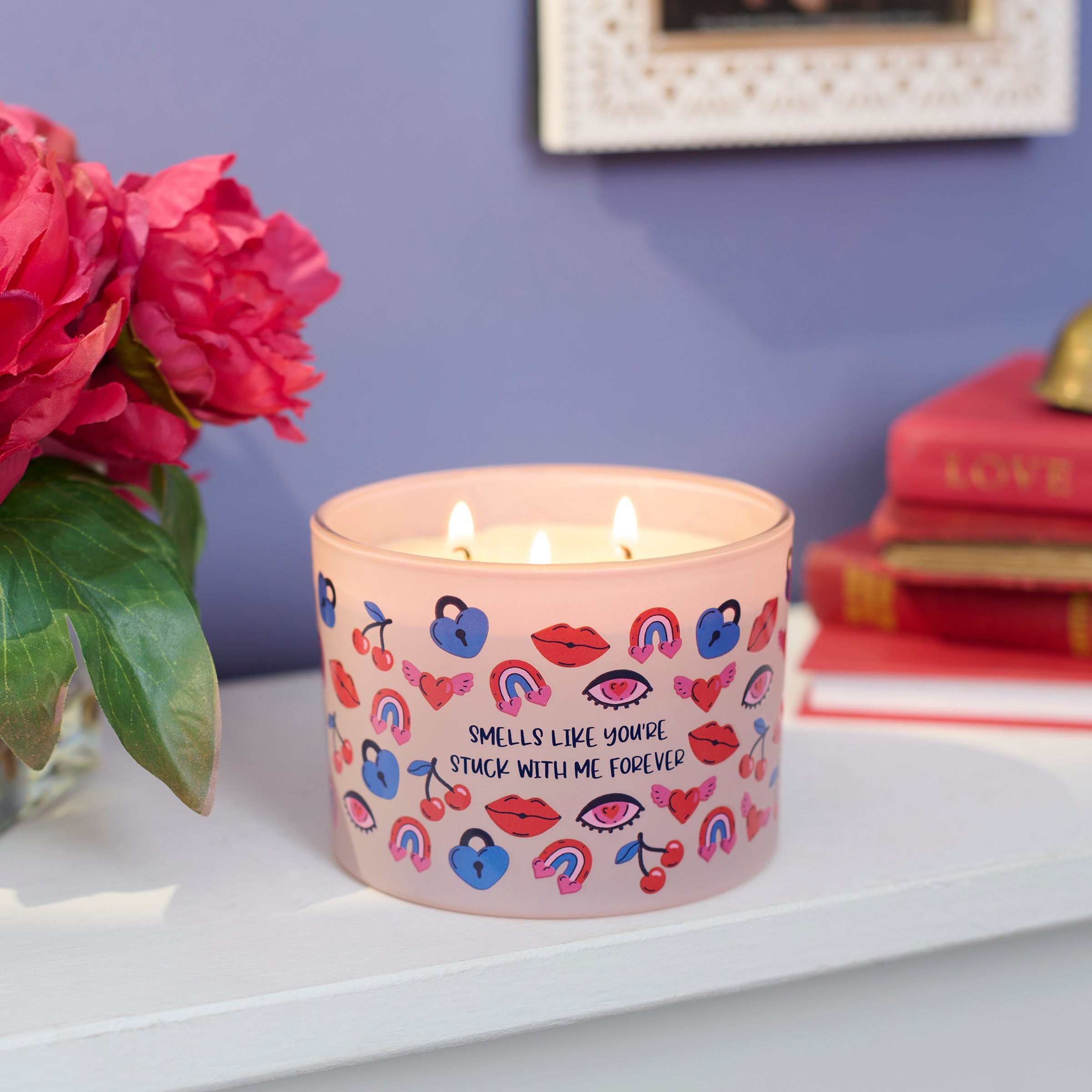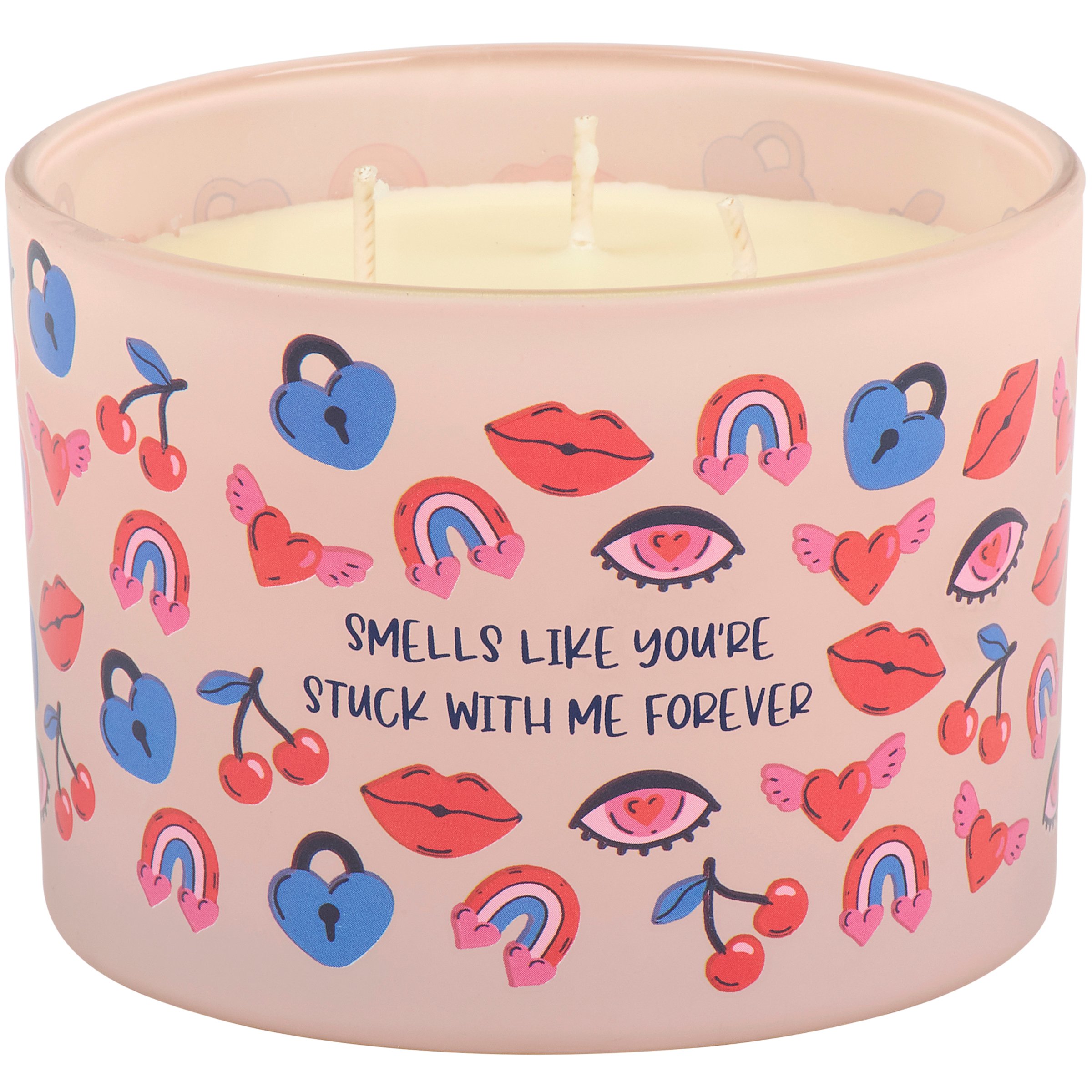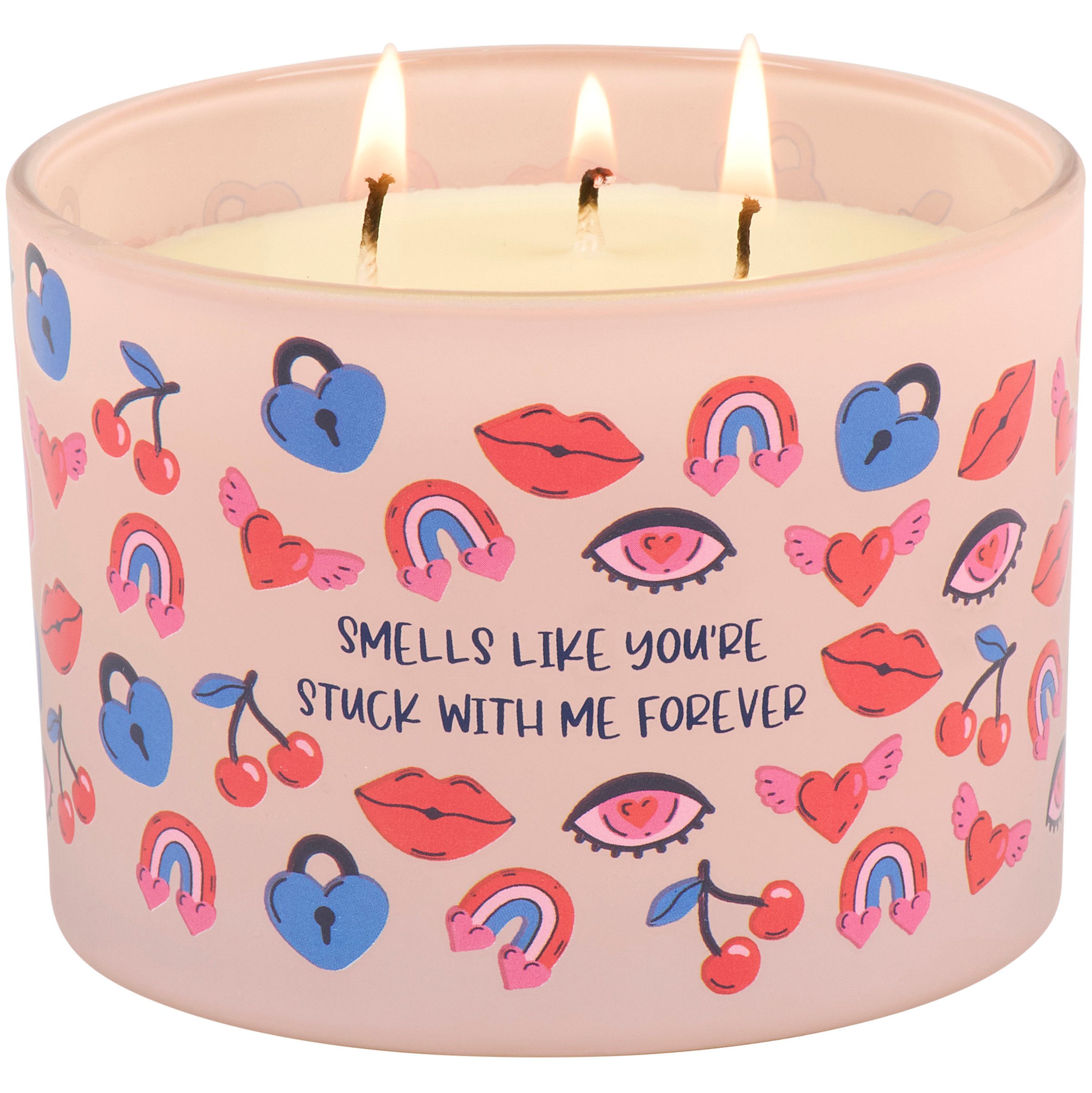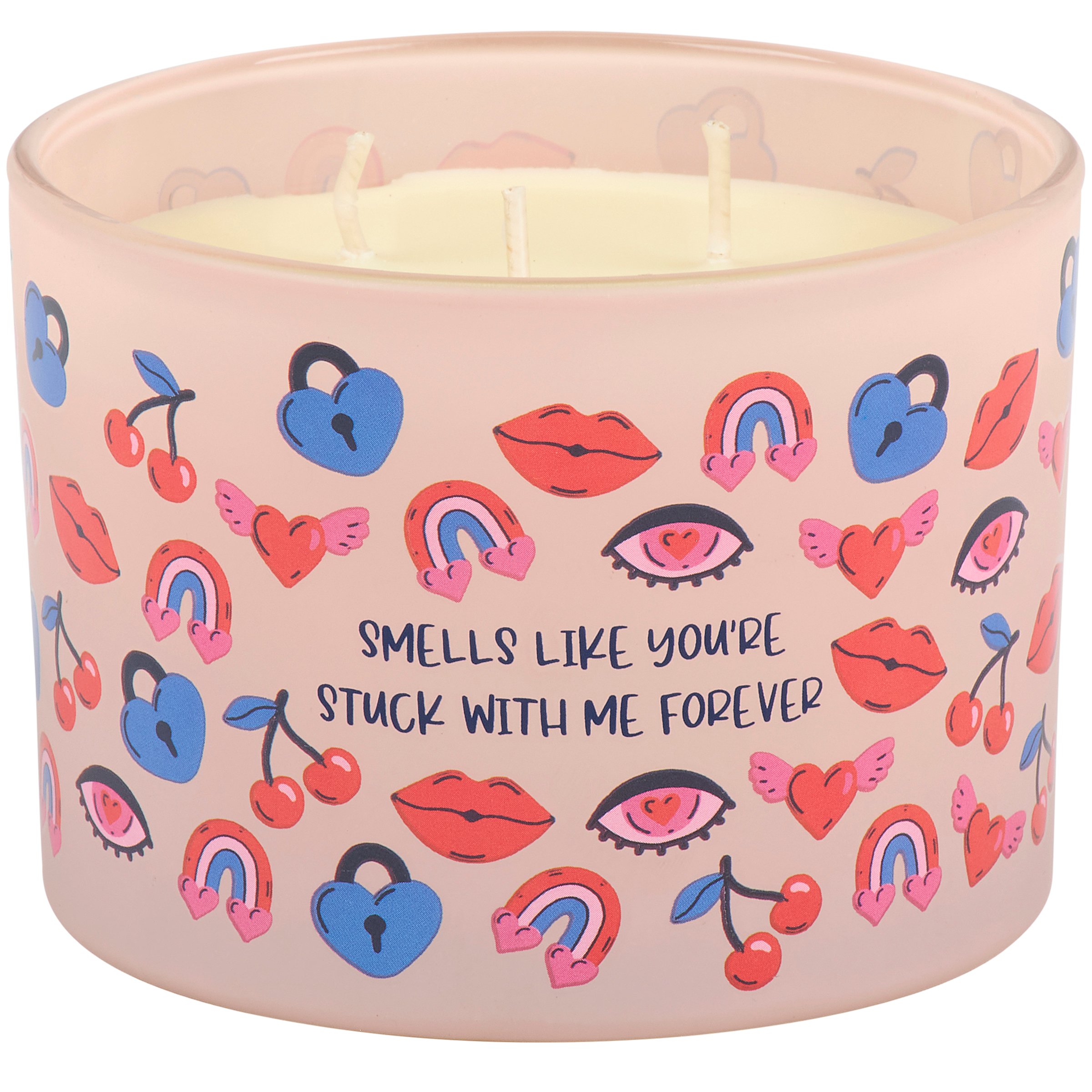 A candle from our Valentine's Day Collection featuring a full wrap-around design displaying a toss pattern of fun love themed icons on light pink frosted glass with a sassy love inspired sentiment that reads "Smells Like You're Stuck With Me Forever." This sassy candle features soy-based wax and 3 fabric wicks with 30 hours of burn time activating a fun Sparkling Wine scent. Our You're Stuck With Me Forever candle includes a dust cover and plastic lid for protection and enhanced appearance on store displays. A sassy home accent that is great for gifting to both friends and partners on Valentine's Day or as stylish love-themed decor in everyday moments.
