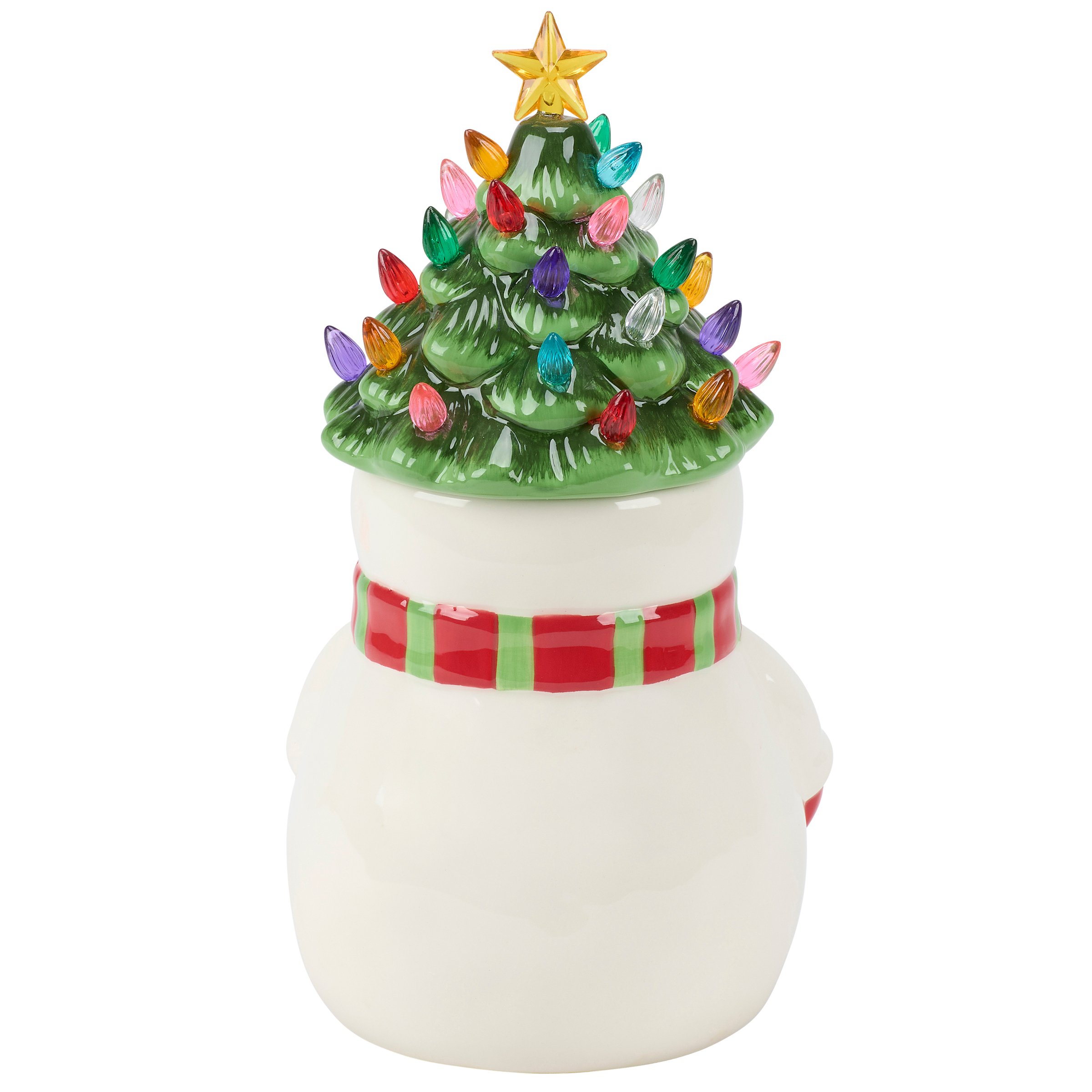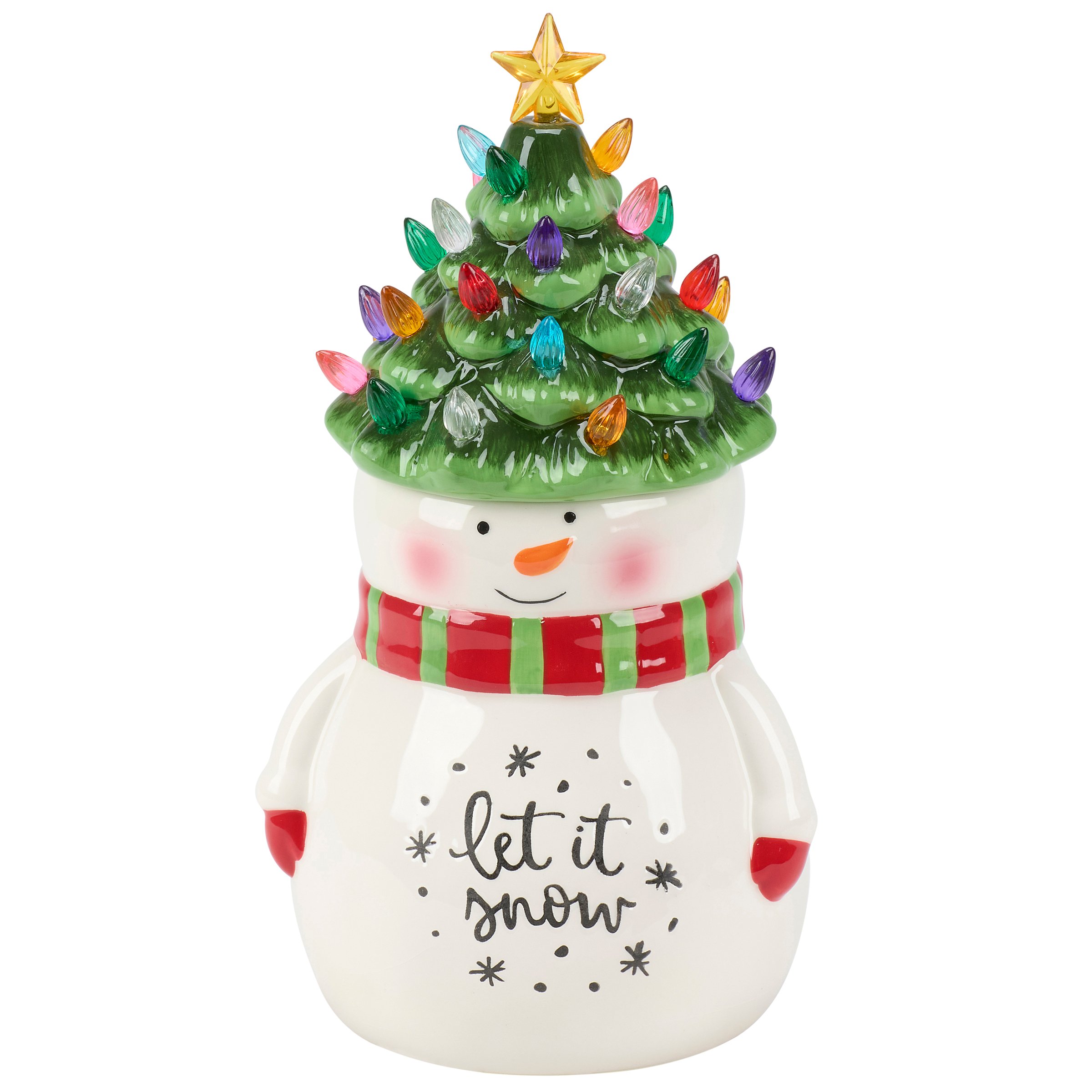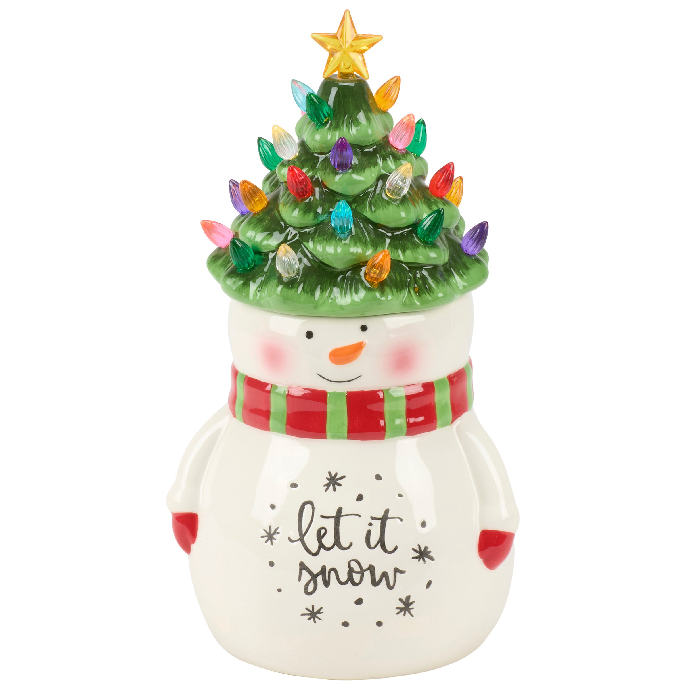 A ceramic canister from our Christmas Collection displaying a retro inspired happy snowman design with a "Let It Snow" sentiment on the front as well as a lighted Christmas tree for the lid powered by 2 LR44 batteries. Seasonal canister design features colorful glaze finish with sculpted details throughout. Our Snowman Tree lighted canister is a fun snowman themed kitchen accessory perfect for storing holiday treats.