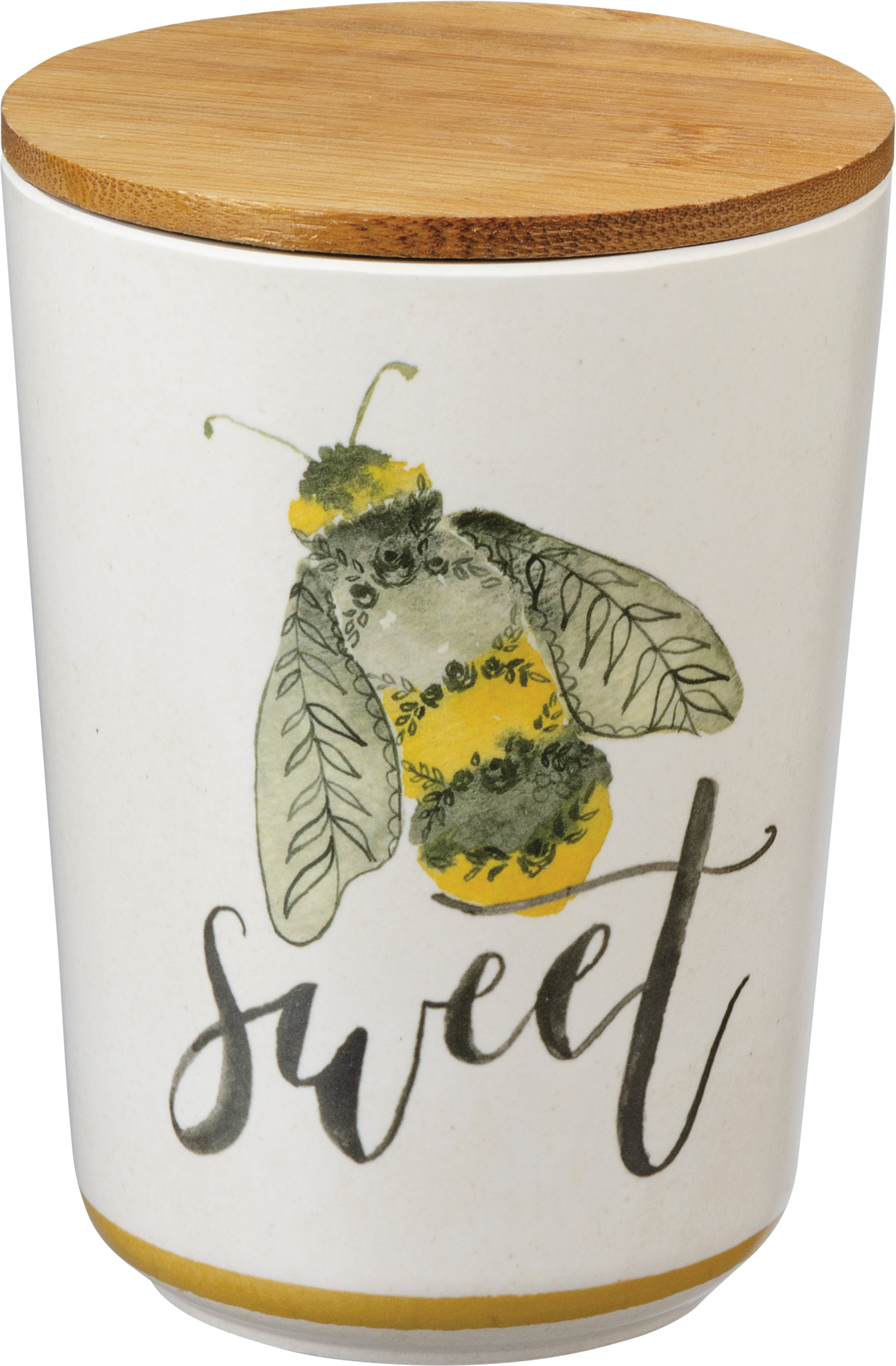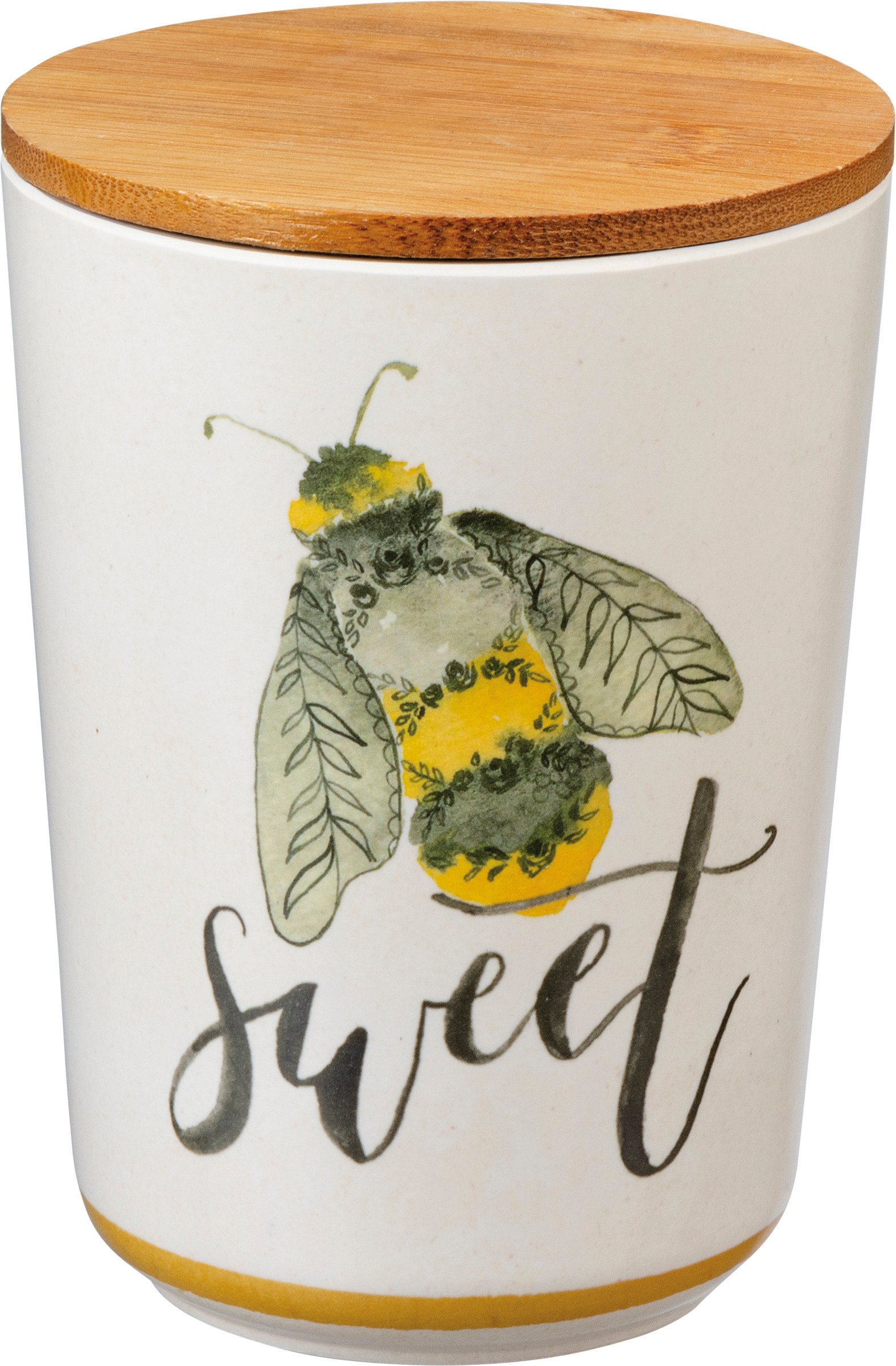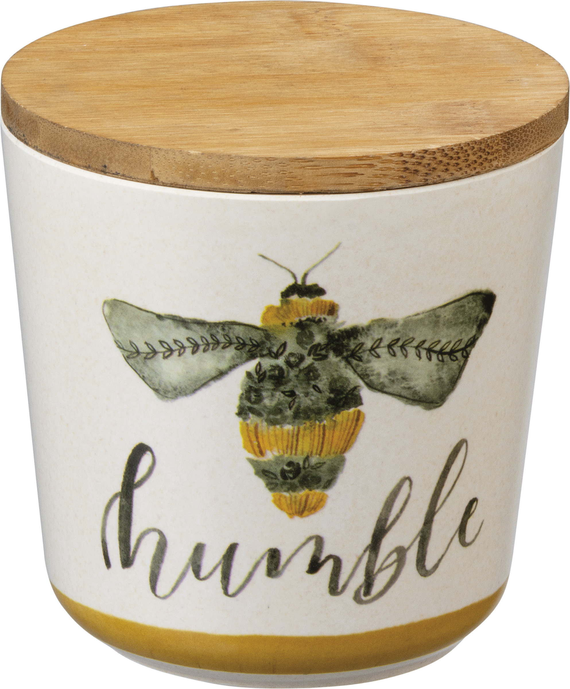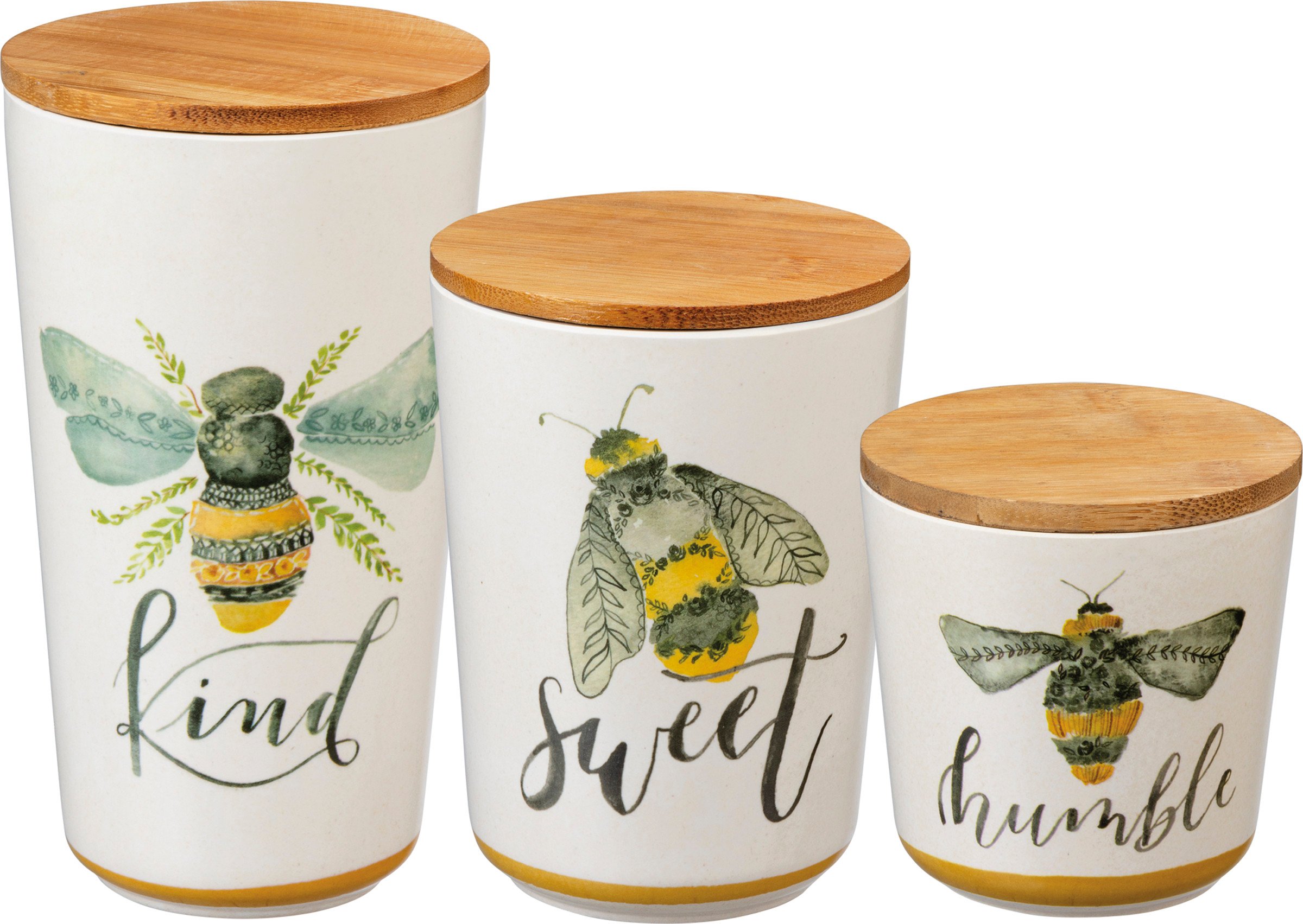 Perfect for spring, a set of three watercolor artwork canisters featuring wrap-around bumblebee designs, and varying "Humble," "Sweet," and "Kind" sentiments in a vibrant yellow and green palette. Complements well with coordinating pieces in collection for a cohesive table display. Hand wash recommended or top rack in dishwasher; not microwave safe. Made with bamboo fiber, melamine, and corn powder. BPA-free.