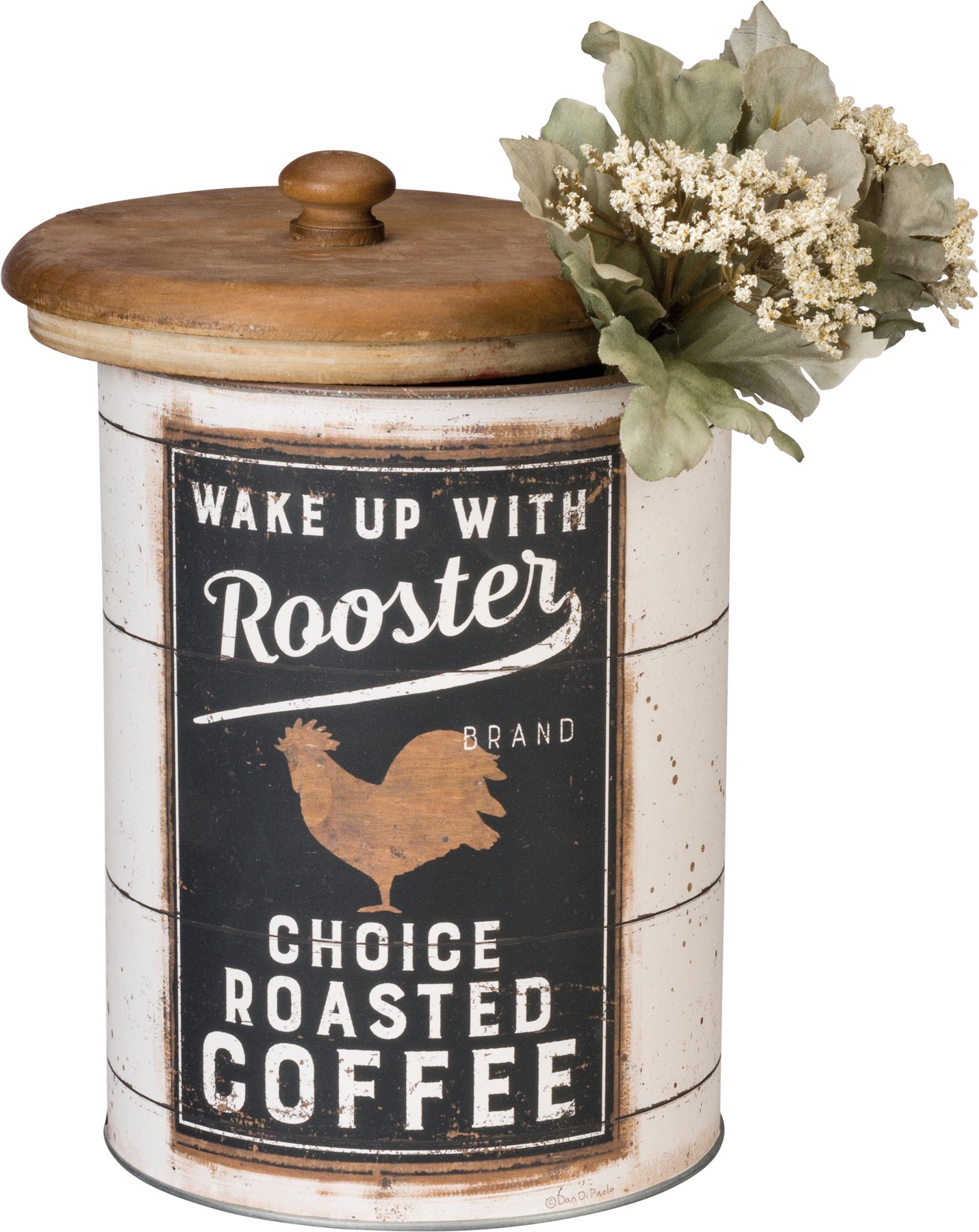A set of three metal farmhouse canisters from our Farmhouse Collection with wooden lids for kitchen organization. Small canister lends double-sided "Sugar / Plantation Pure Cane Sugar" sentiments, medium canister lends double-sided "Coffee / Wake Up With Rooster - Choice Roasted Coffee" sentiments, and large canister lends double-sided "Flour / Farm Boy Biscuit Flour - Self-Rising Made From Choice Wheat" sentiments. The Farmhouse canister set complements well with coordinating design pieces for rustic kitchen decor. Not airtight for food storage; recommended to line canister with sealable bag to maintain freshness.
