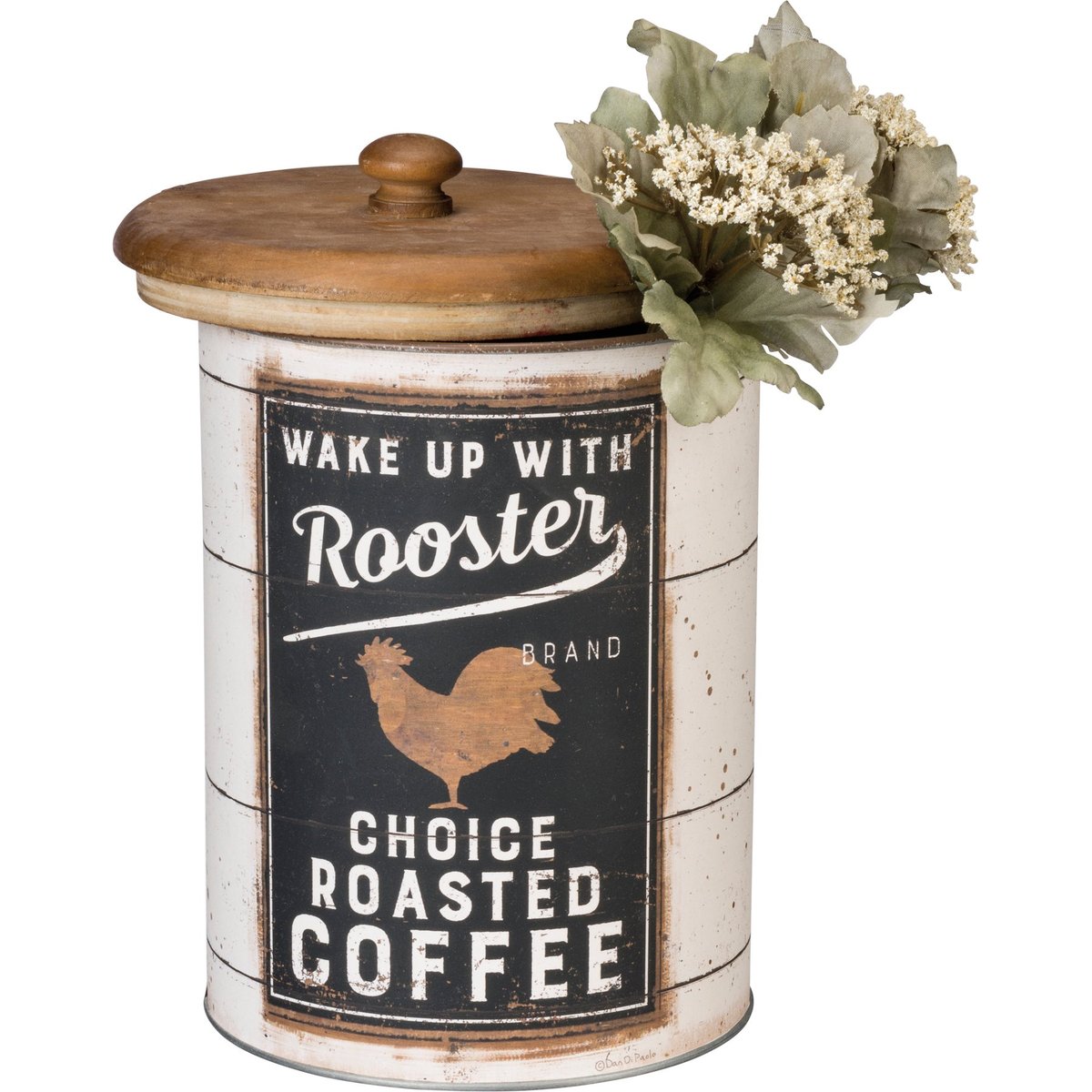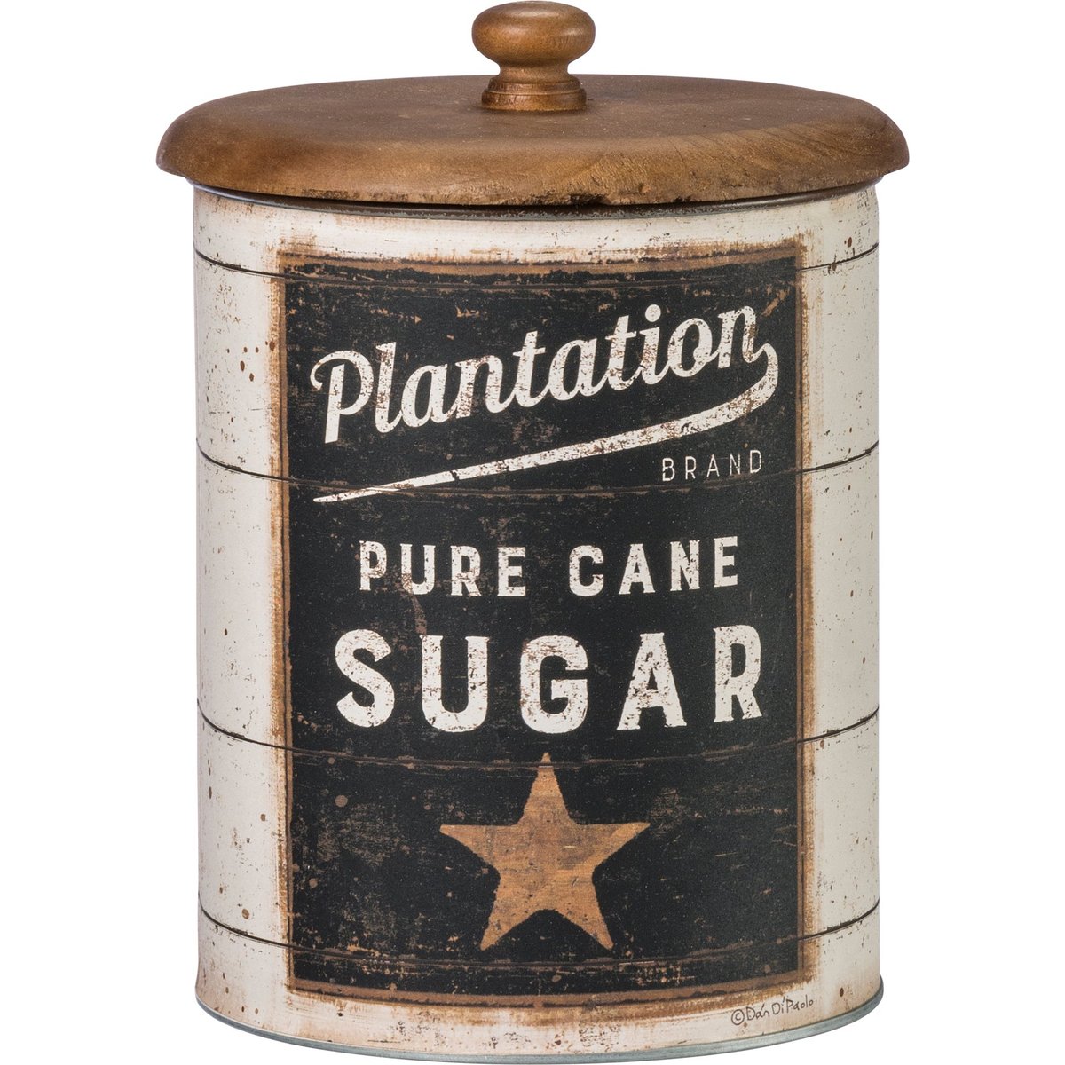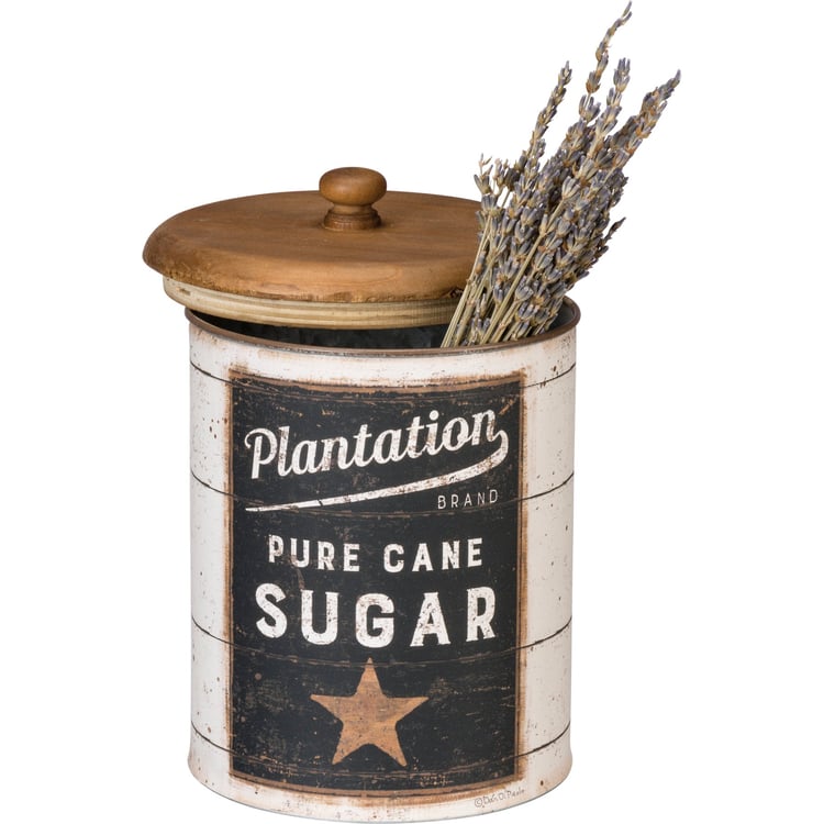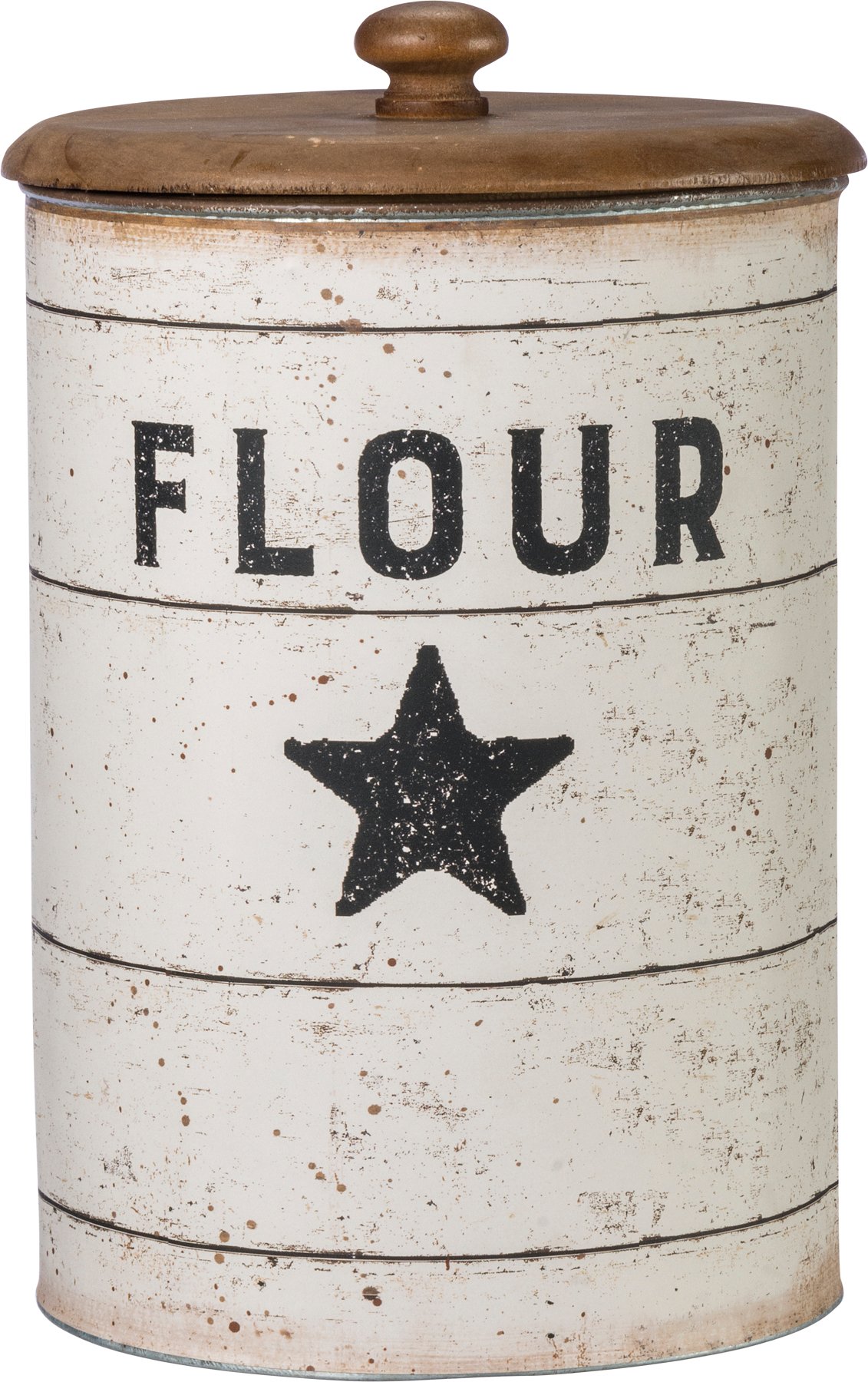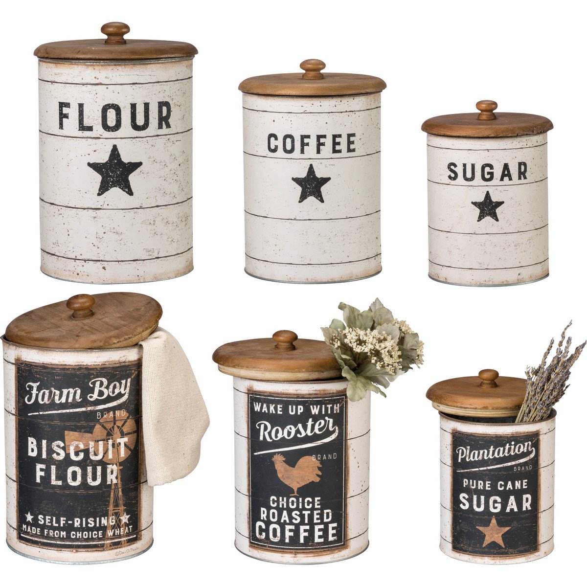 A set of three metal farmhouse canisters from our Farmhouse Collection with wooden lids for kitchen organization. Small canister lends double-sided "Sugar / Plantation Pure Cane Sugar" sentiments, medium canister lends double-sided "Coffee / Wake Up With Rooster - Choice Roasted Coffee" sentiments, and large canister lends double-sided "Flour / Farm Boy Biscuit Flour - Self-Rising Made From Choice Wheat" sentiments. The Farmhouse canister set complements well with coordinating design pieces for rustic kitchen decor. Not airtight for food storage; recommended to line canister with sealable bag to maintain freshness.