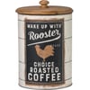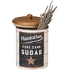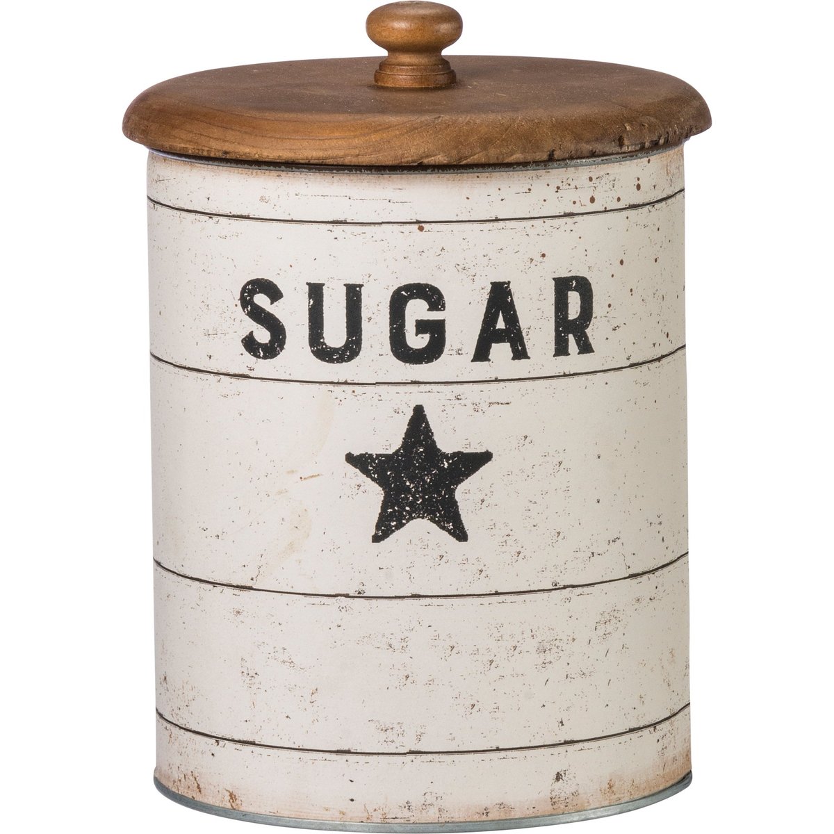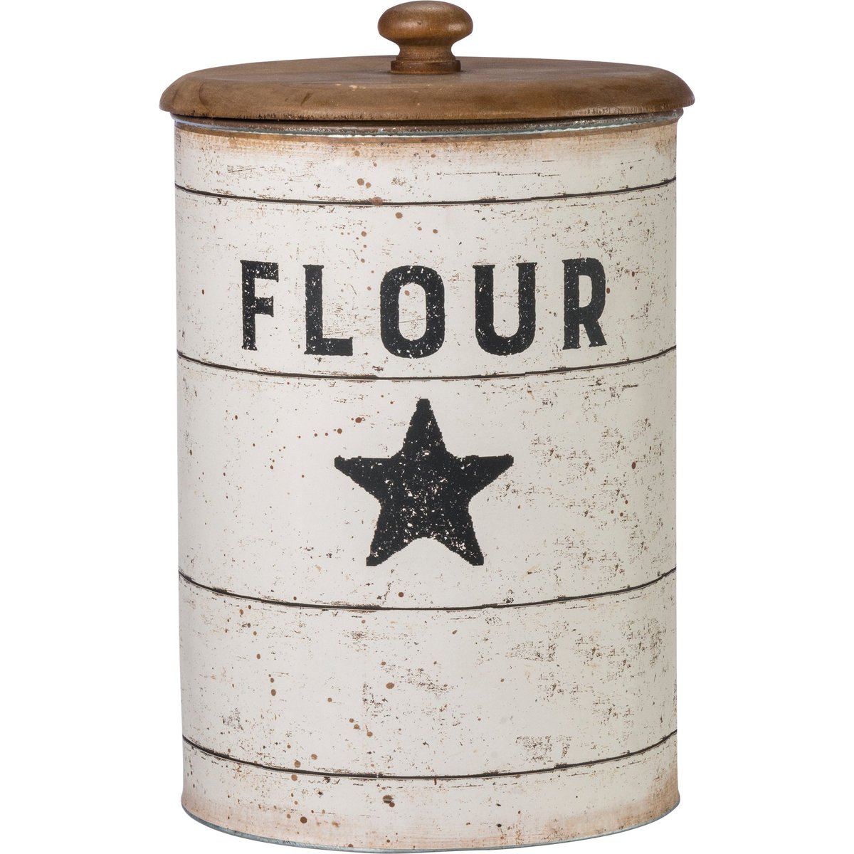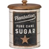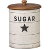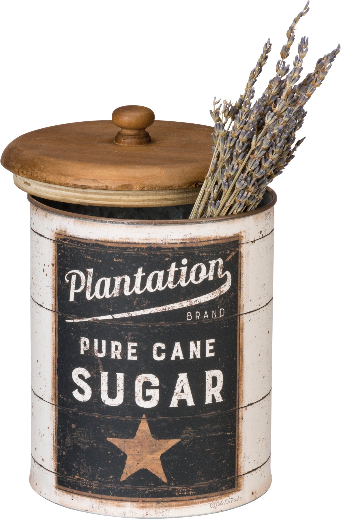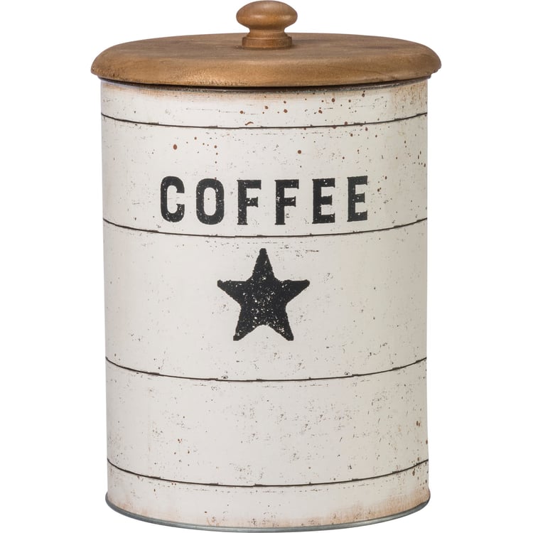 A set of three metal farmhouse canisters from our Farmhouse Collection with wooden lids for kitchen organization. Small canister lends double-sided "Sugar / Plantation Pure Cane Sugar" sentiments, medium canister lends double-sided "Coffee / Wake Up With Rooster - Choice Roasted Coffee" sentiments, and large canister lends double-sided "Flour / Farm Boy Biscuit Flour - Self-Rising Made From Choice Wheat" sentiments. The Farmhouse canister set complements well with coordinating design pieces for rustic kitchen decor. Not airtight for food storage; recommended to line canister with sealable bag to maintain freshness.