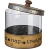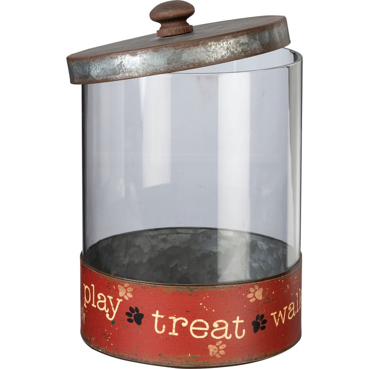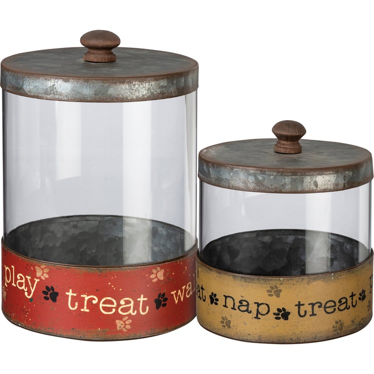 A set of two glass canisters with rustic galvanized metal bases and lids with wooden handles. Large canister features "Play Treat Walk" sentiment. Small canister features "Treat Nap Treat" sentiment. Both canisters features paw print designs and distressed details. Glass piece can be removed for easy cleaning.