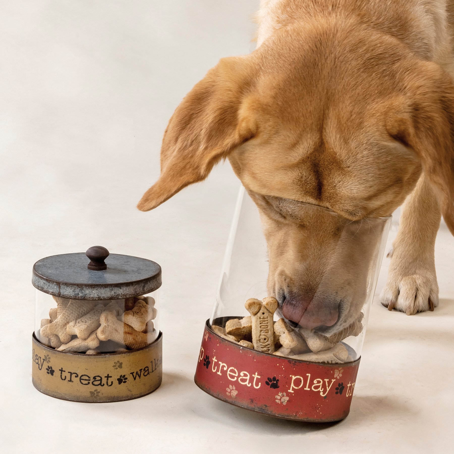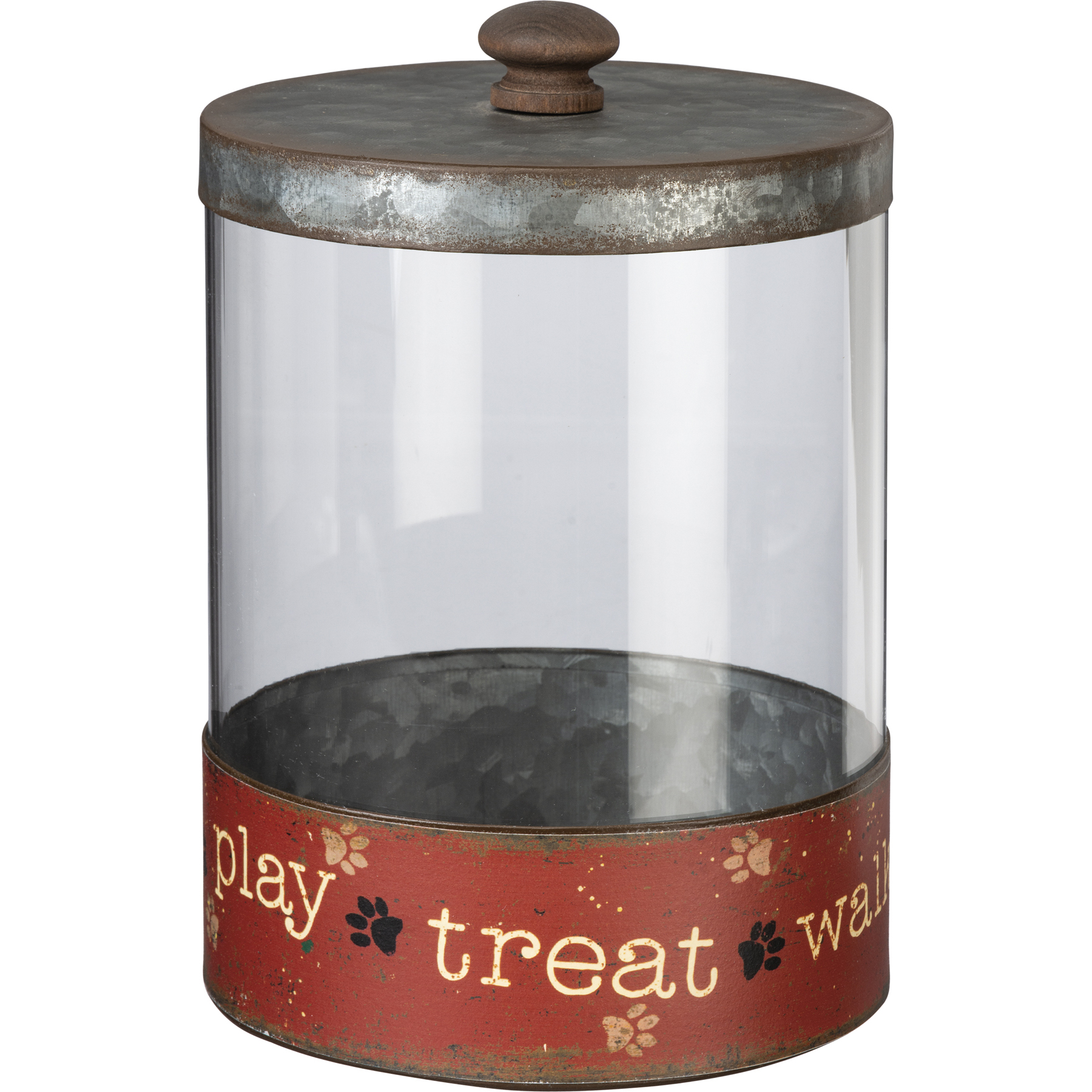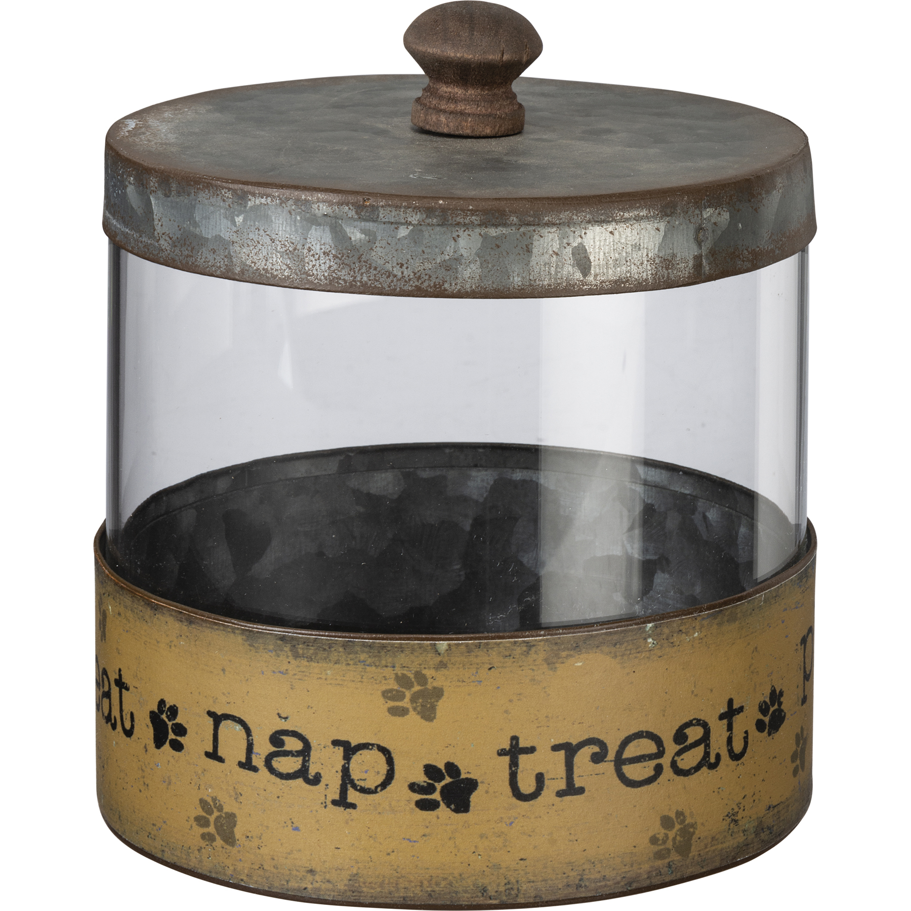 A set of two glass canisters with rustic galvanized metal bases and lids with wooden handles. Large canister features "Play Treat Walk" sentiment. Small canister features "Treat Nap Treat" sentiment. Both canisters features paw print designs and distressed details. Glass piece can be removed for easy cleaning.