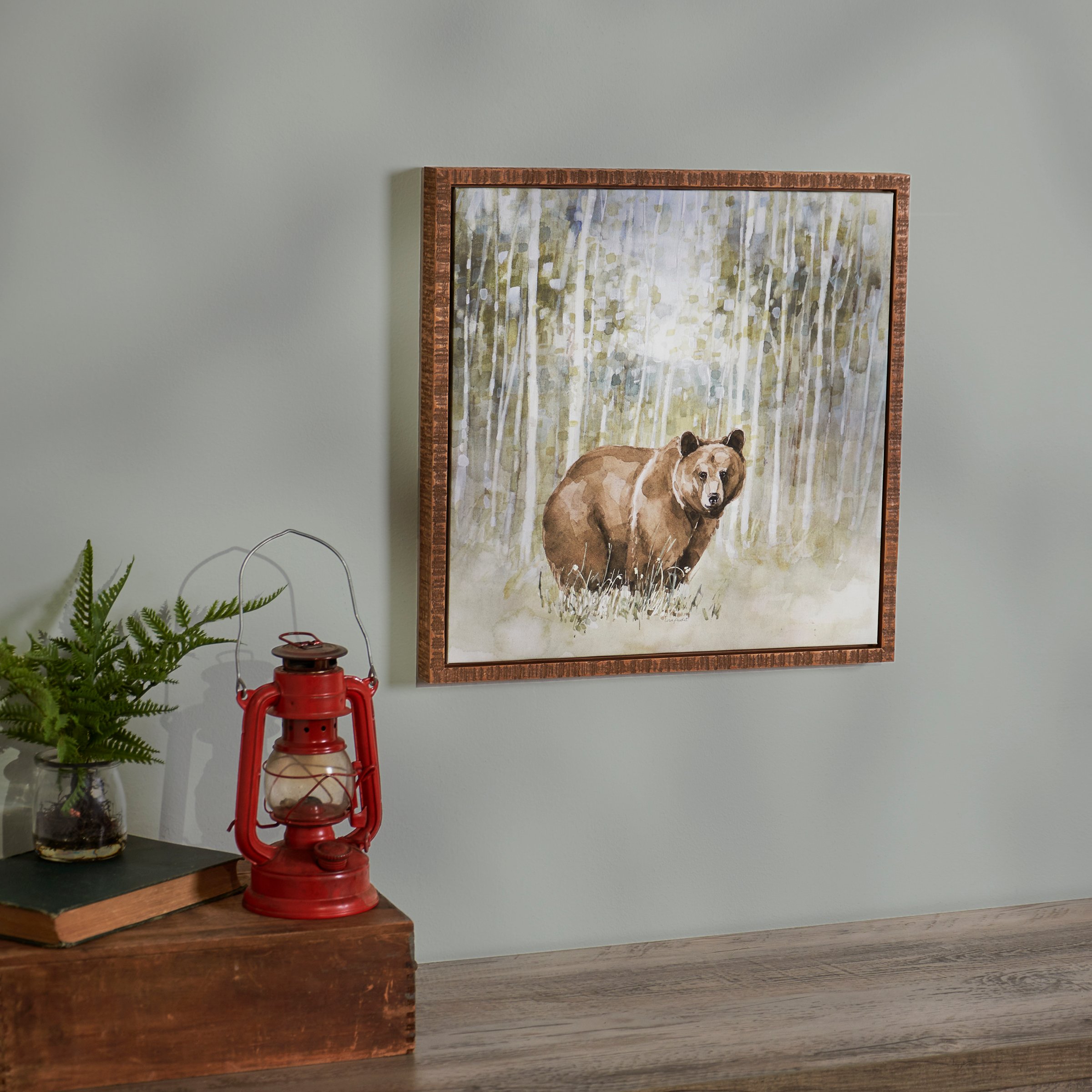A canvas wall décor piece from our Lake & Cabin Collection displaying a scene of a bear surrounded by trees in a forest inspired color palette. Design is replicated from original art hand painted in a delicate watercolor style. Frame features natural wood and a floating canvas technique to appear suspended within the frame for a dimensional effect. Our Bear wall décor is easy to hang via attached sawtooth hangers. A rustic wilderness-themed home accent perfect for everyday display.