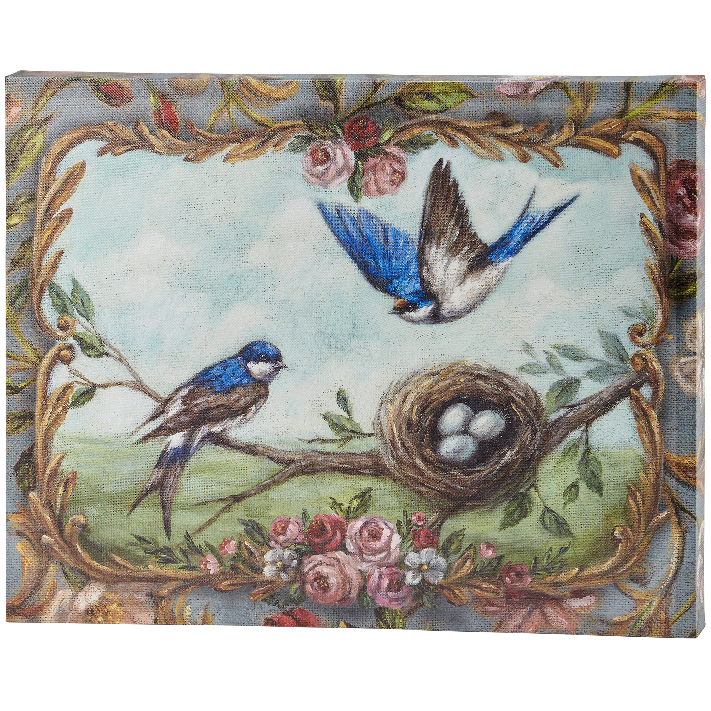 A canvas wall art piece from our Art Nouveau Collection displaying a charming scene of blue swallows with a floral border inspired by art nouveau. Blue swallow design is replicated from original artwork painted onto burlap canvas, giving the art a unique depth and texture. Our Blue Swallow canvas wall art is easy to hang via attached sawtooth hanger. A charming nature-themed home accent perfect for everyday display.