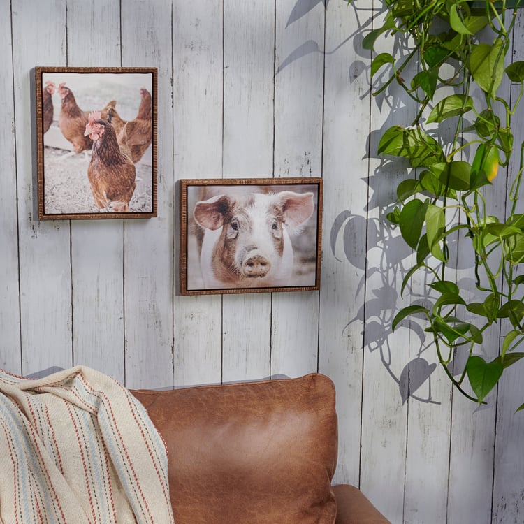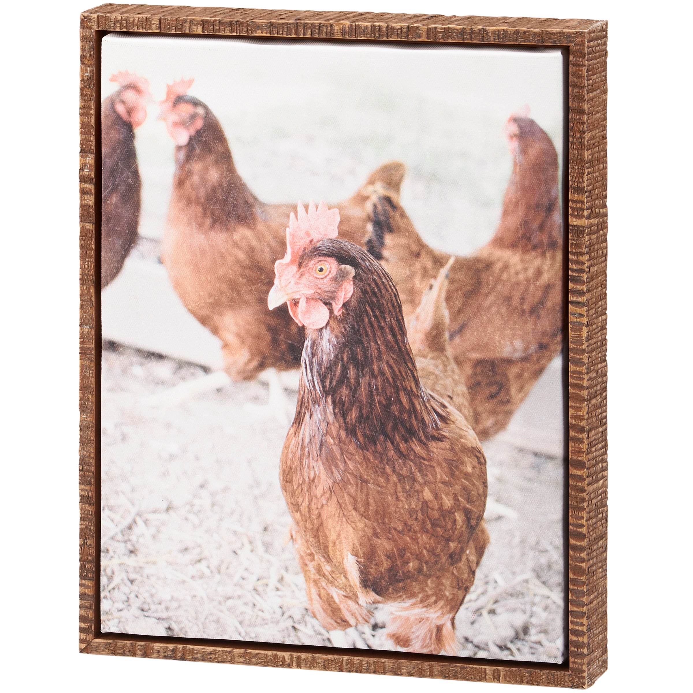 A canvas wall art piece from our Homestead Collection displaying beautiful lifestyle photography of farm chickens with distressed details for an aged appearance. Design is replicated from original photography for added interest. Frame features natural wood and a floating canvas technique to appear suspended within the frame for a dimensional effect. Our Chickens canvas wall art is easy to hang via attached sawtooth hanger. A rustic home accent perfect for everyday display.