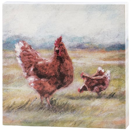 A canvas wall art piece from our Farmhouse Collection displaying a charming scene of farm chickens in a field. Chickens design is replicated from original artwork painted onto burlap canvas, giving the art a unique depth and texture. Our Chickens canvas wall art is easy to hang via attached sawtooth hanger. A rustic farm-themed home accent perfect for everyday display.