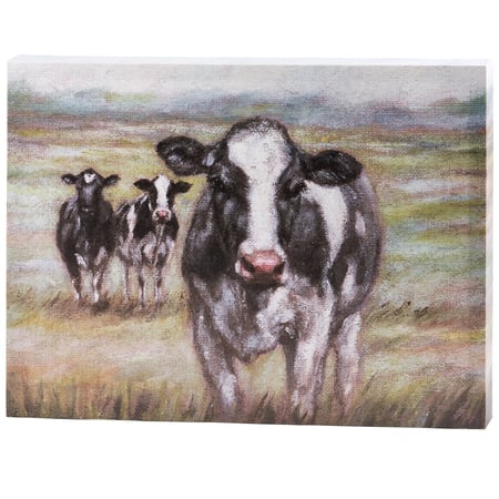 A canvas wall décor piece from our Farmhouse Collection displaying a charming scene of dairy cows in a field. Cows design is replicated from original artwork painted onto burlap canvas, giving the art a unique depth and texture. Our Dairy Cows canvas wall art is easy to hang via attached sawtooth hanger. A rustic farm-themed home accent perfect for everyday display.