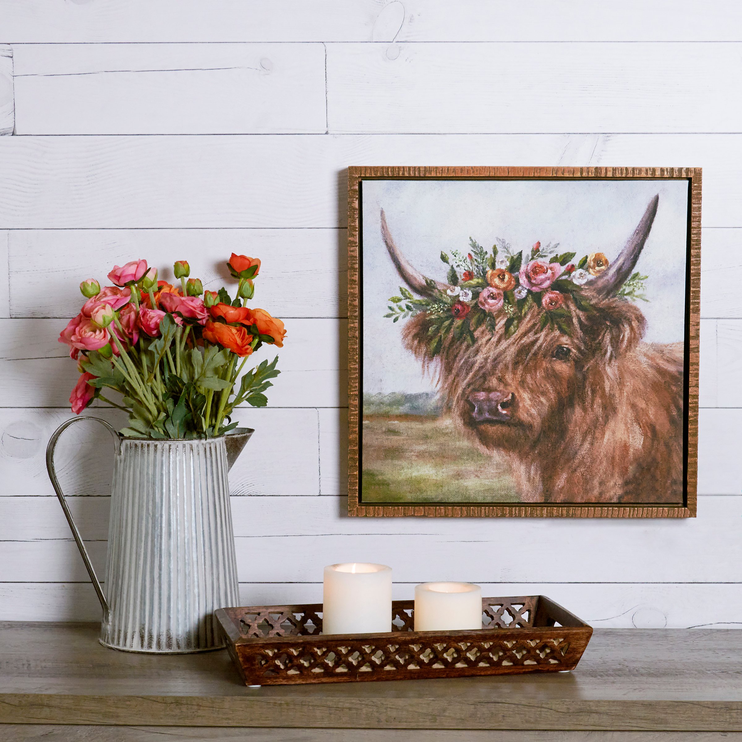 A canvas wall décor piece from our Easter & Spring Collection displaying a comforting scene of a highland cow wearing a crown of vibrant spring florals. Design is replicated from original artwork painted onto burlap canvas, giving the art a unique depth and texture. Frame features natural wood and a floating canvas technique to appear suspended within the frame for a dimensional effect. Our Floral Highland wall décor is easy to hang via attached sawtooth hangers. A rustic spring-themed home accent perfect for seasonal display.