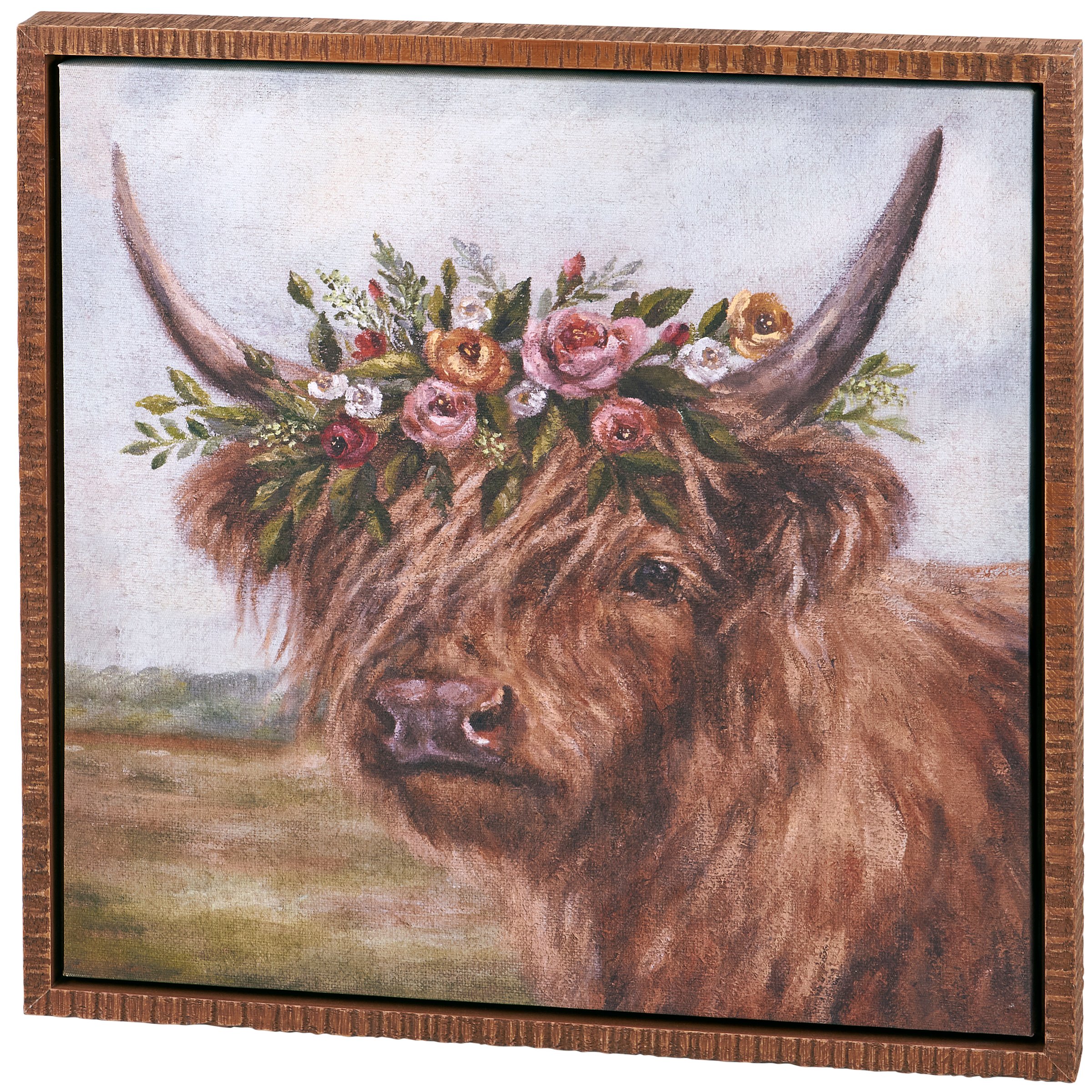A canvas wall décor piece from our Easter & Spring Collection displaying a comforting scene of a highland cow wearing a crown of vibrant spring florals. Design is replicated from original artwork painted onto burlap canvas, giving the art a unique depth and texture. Frame features natural wood and a floating canvas technique to appear suspended within the frame for a dimensional effect. Our Floral Highland wall décor is easy to hang via attached sawtooth hangers. A rustic spring-themed home accent perfect for seasonal display.