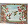 A canvas wall art piece from our Art Nouveau Collection displaying a charming scene of hummingbirds with a floral border inspired by art nouveau. Hummingbird design is replicated from original artwork painted onto burlap canvas, giving the art a unique depth and texture. Our Hummingbird canvas wall art is easy to hang via attached sawtooth hanger. A charming nature-themed home accent perfect for everyday display.