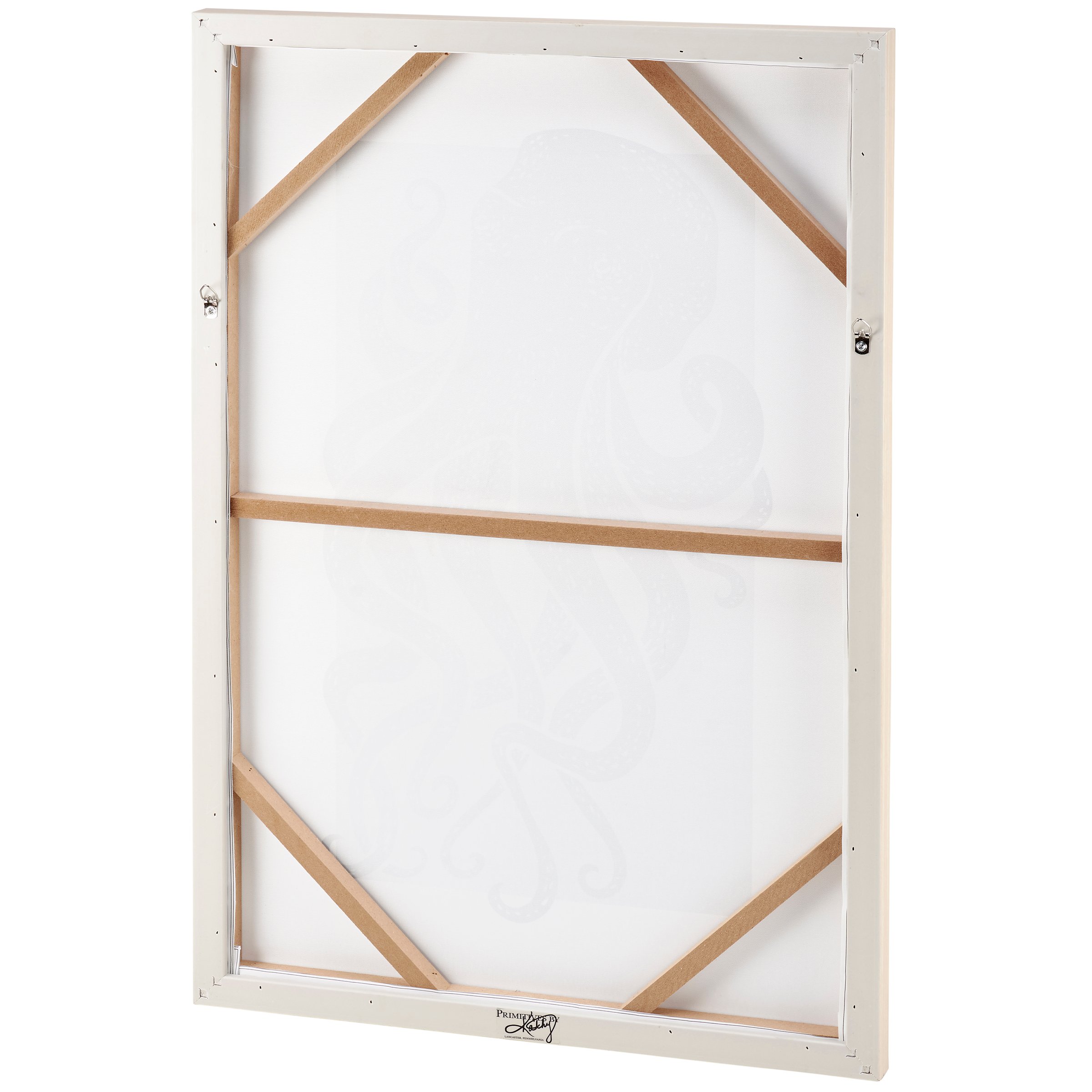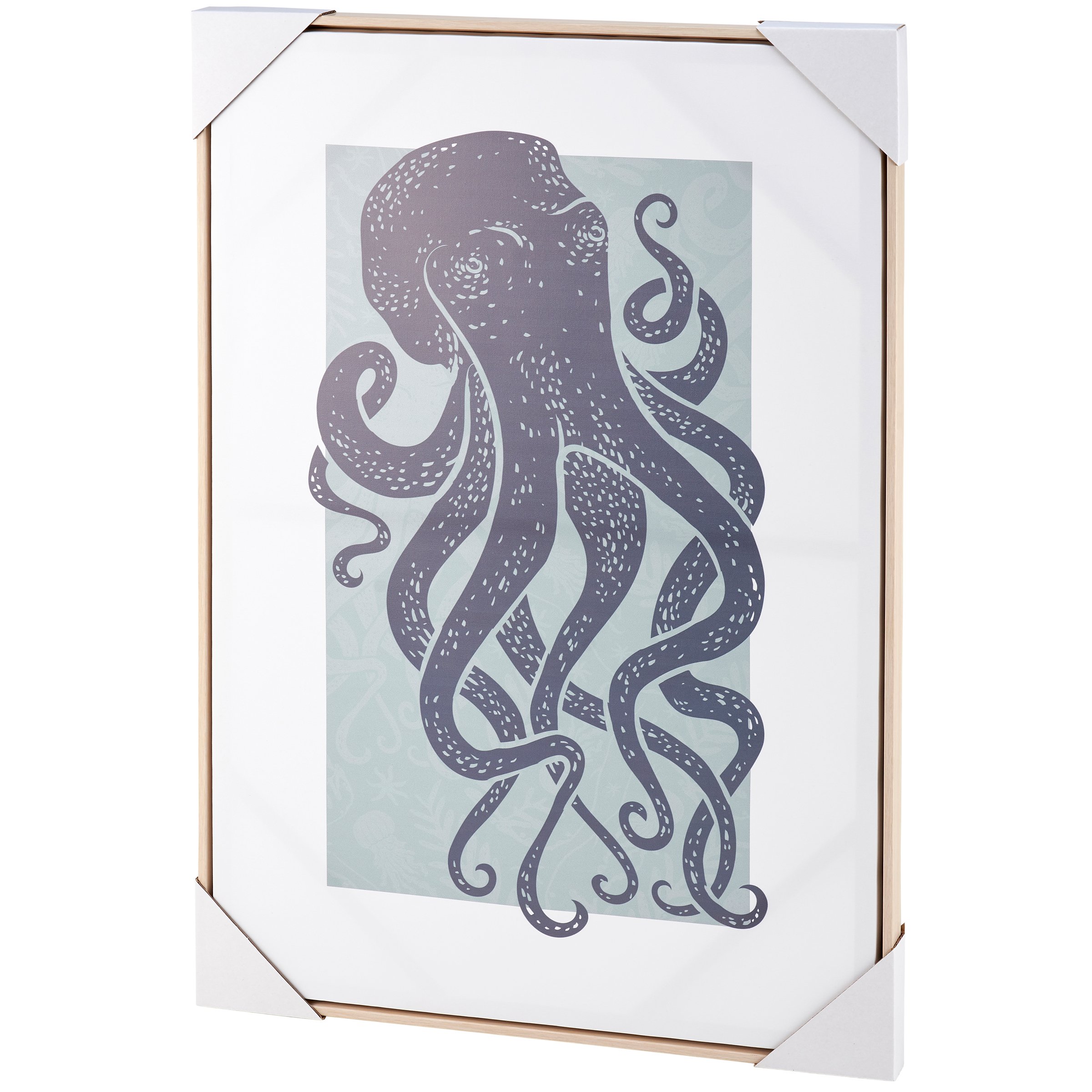 A canvas wall décor piece from our Beach Collection displaying an octopus in a block print style with deep nautical color palette. Frame features light natural wood and a floating canvas technique to appear suspended within the frame for a dimensional effect. Our Octopus wall décor is easy to hang via included hangers on back of frame. Wall décor measures 20 inches by 30 inches making it a perfect option for a beach-themed statement piece.