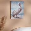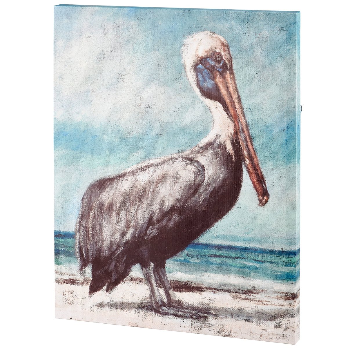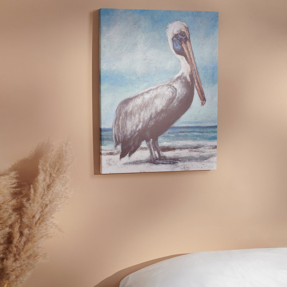 A canvas wall art piece from our Beach Collection displaying a calming scene of a pelican on a beach. Pelican design is replicated from original artwork painted onto burlap canvas, giving the art a unique depth and texture. Our Pelican canvas wall art is easy to hang via attached hangers on the back. A rustic beach-themed home accent perfect for everyday display.