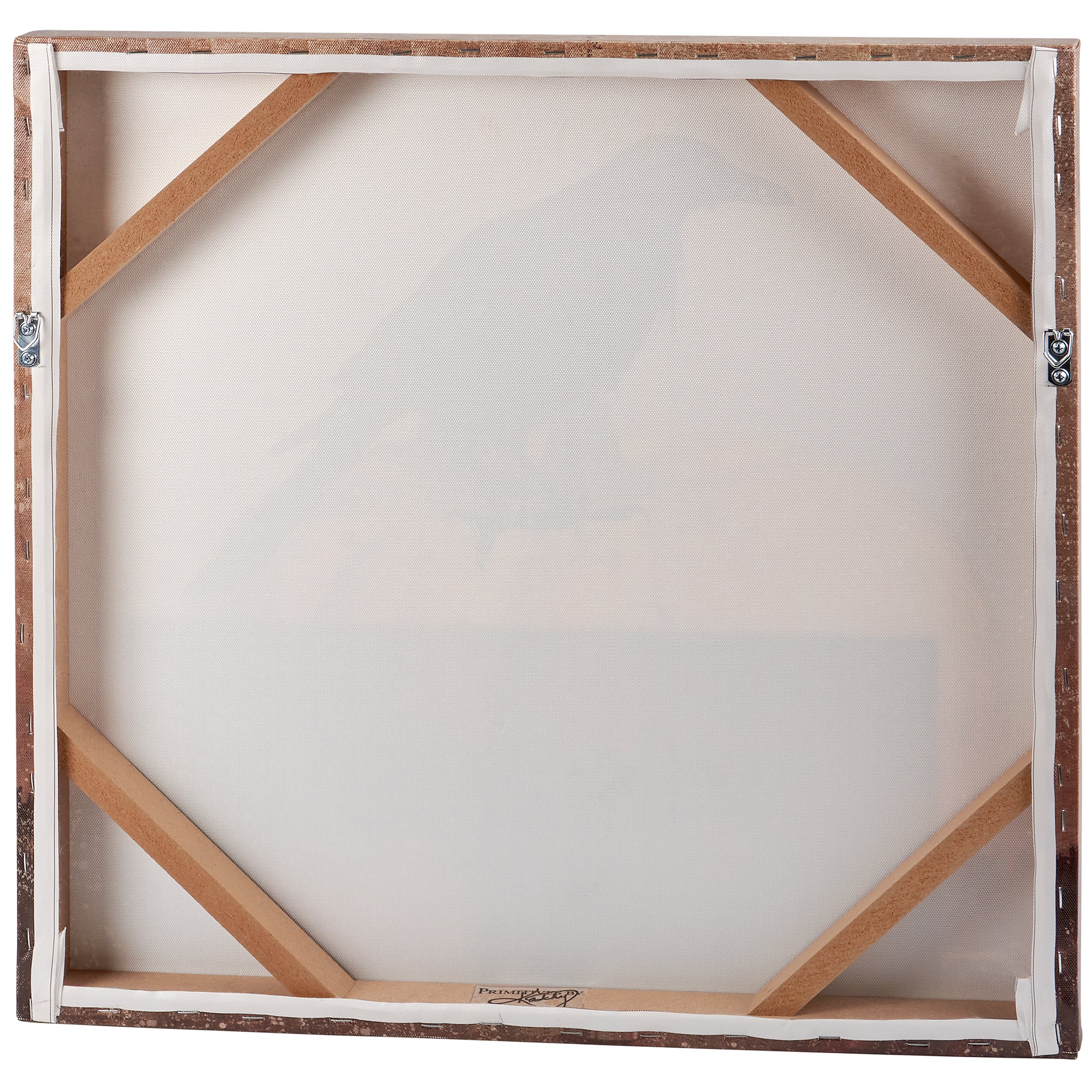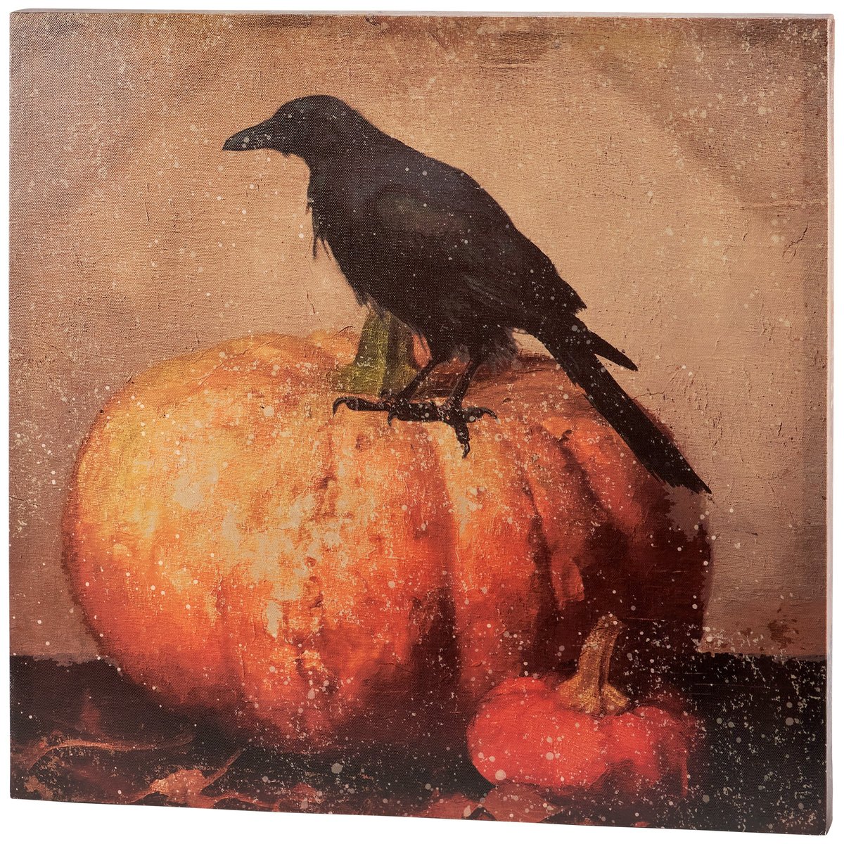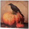 A canvas wall art piece from our Halloween Collection displaying a rustic still life scene of a raven on a large pumpkin with distressed details. Our Raven canvas wall art is easy to hang via attached hangers on the back. A rustic fall-themed home accent perfect for seasonal display.