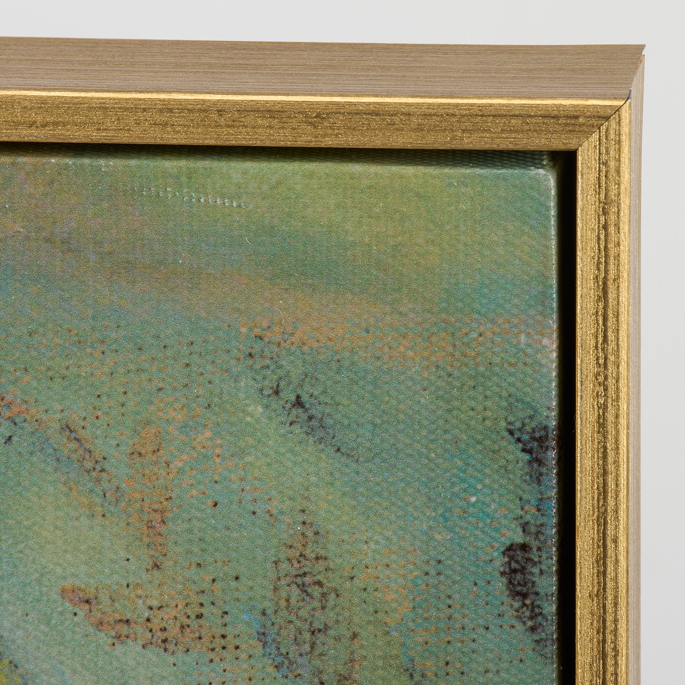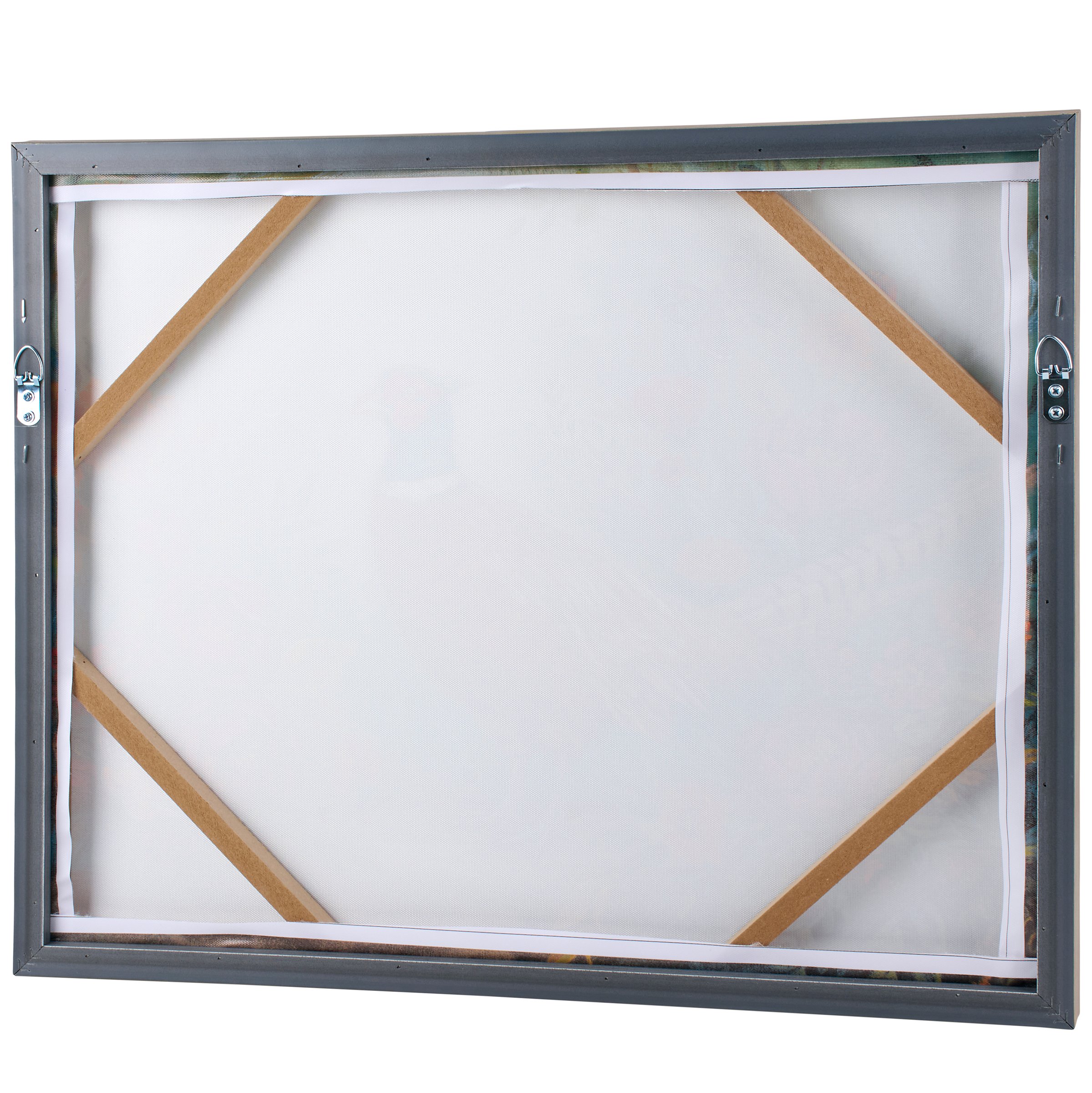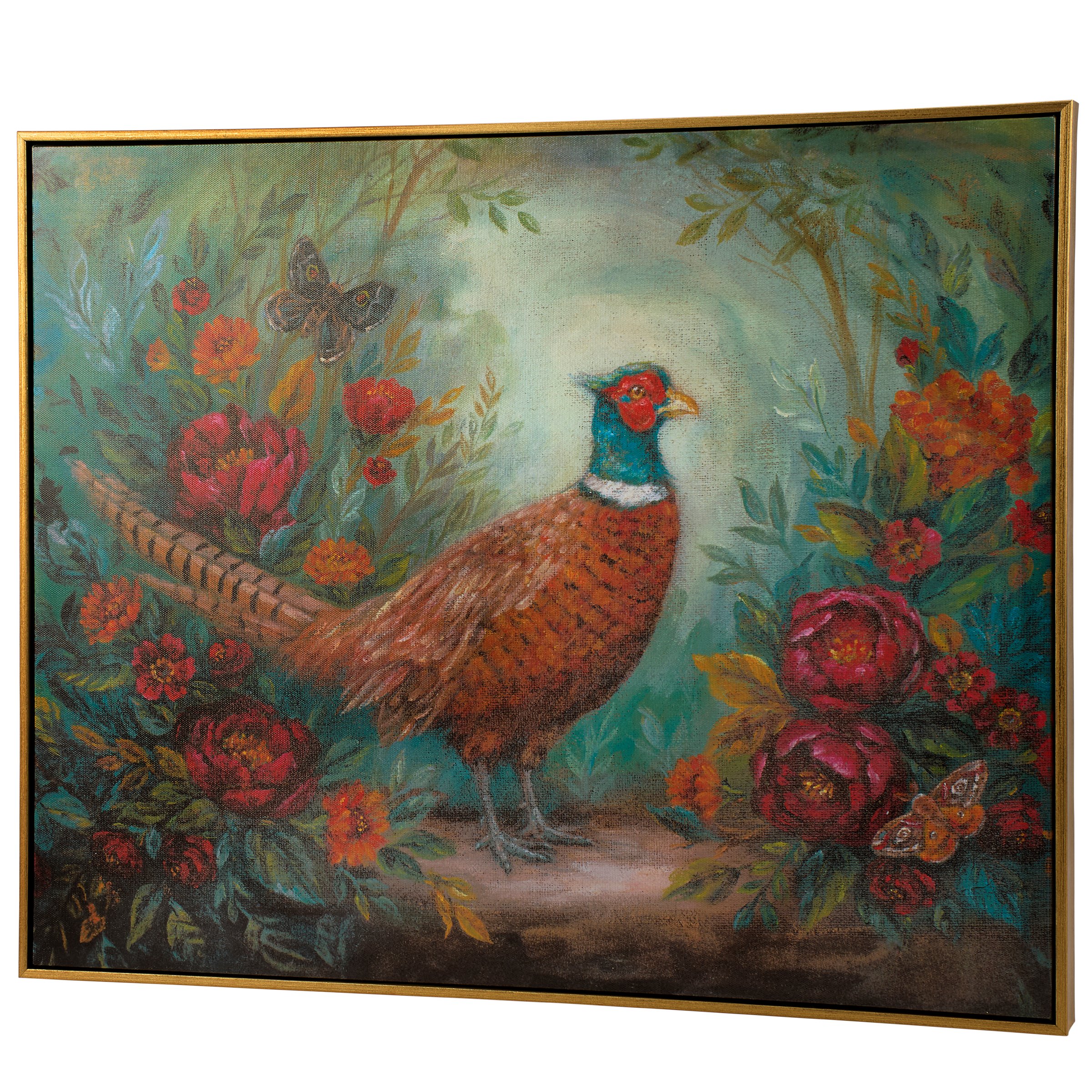 A canvas wall art piece from our Fall & Harvest Collection displaying a charming scene of a ring-neck pheasant surrounded by fall florals in a jewel tone color palette. Fall pheasant design is replicated from original artwork painted onto burlap canvas, giving the art a unique depth and texture. Wall art frame features a complementing metallic gold finish and a floating canvas technique to appear suspended within the frame for a dimensional effect. Our Ring-Neck Pheasant canvas wall art is ready to hang for display via attached hangers on the back. A jewel tone fall home accent perfect for seasonal display.