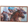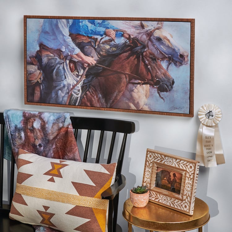 A statement piece from our Western Collection displaying a vivid scene of riders on horses. Design is replicated from original hand painted art for added texture. Frame features natural wood and a floating canvas technique to appear suspended within the frame for a dimensional effect. Our Western Riders canvas wall art is easy to hang via attached sawtooth hangers. A western-themed home accent perfect for everyday display.