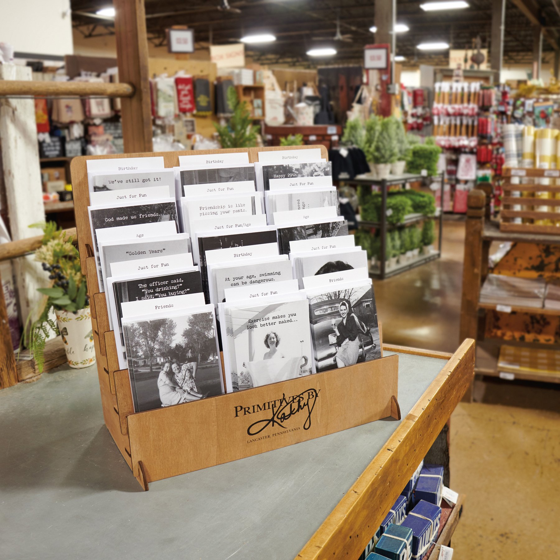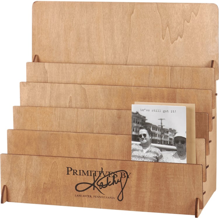 A natural wood card display perfect for our collection of Everyday or Trash Talk Greeting Cards. Easily showcase greeting cards in one of our card displays that highlights up to 15 different designs and approximately 90 cards in total. For convenience, greeting card options include a reorder card for display. Our Greeting Cards card display comes packaged flat in polybag with instructions included; assembly required. We are certain that our cards will catch your customers' eyes, and they will be just as excited to discover them as they will be giving them to someone special. Receive a free Card Display with the purchase of a greeting card Quick Pick Kit!