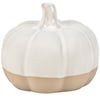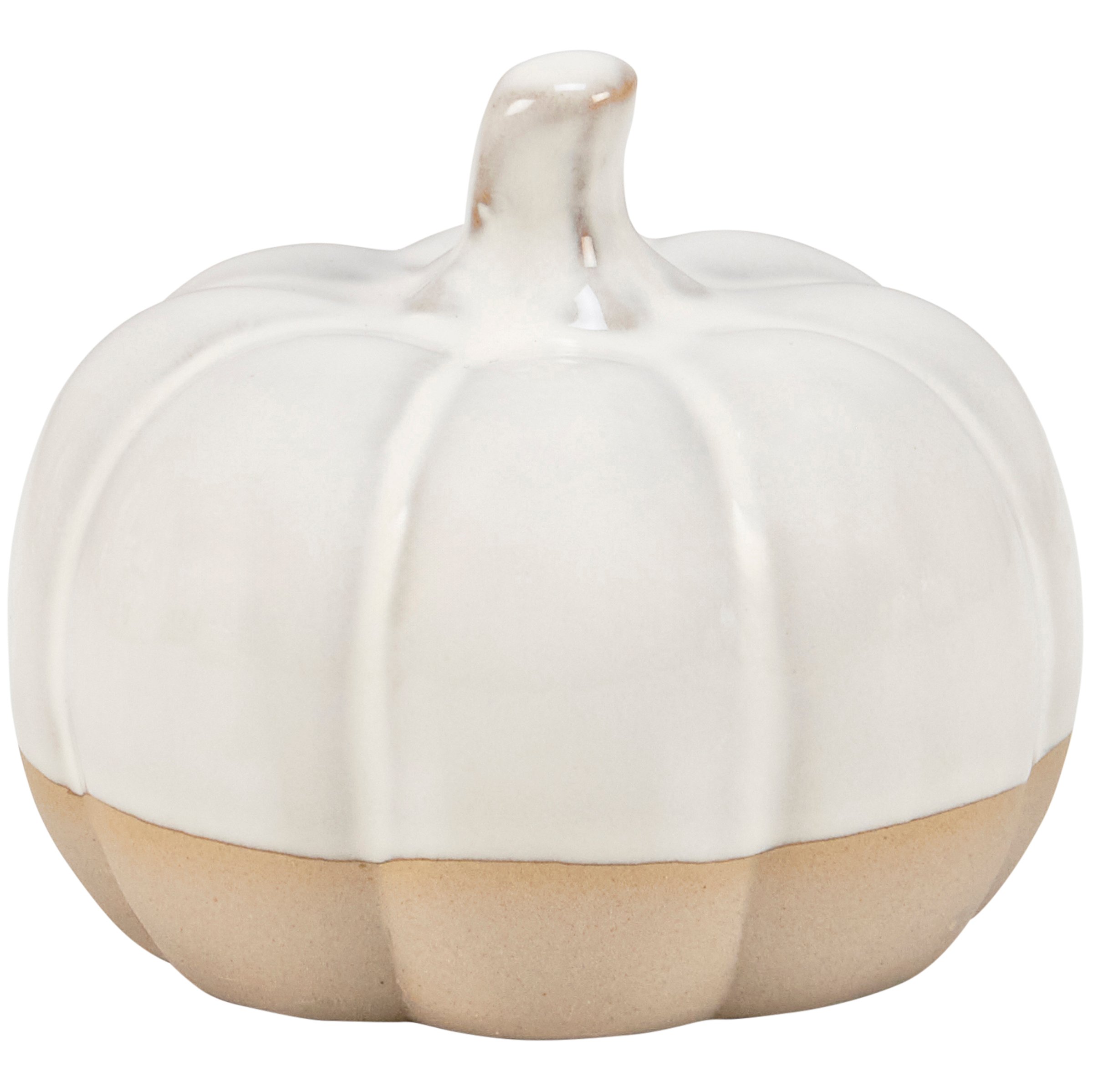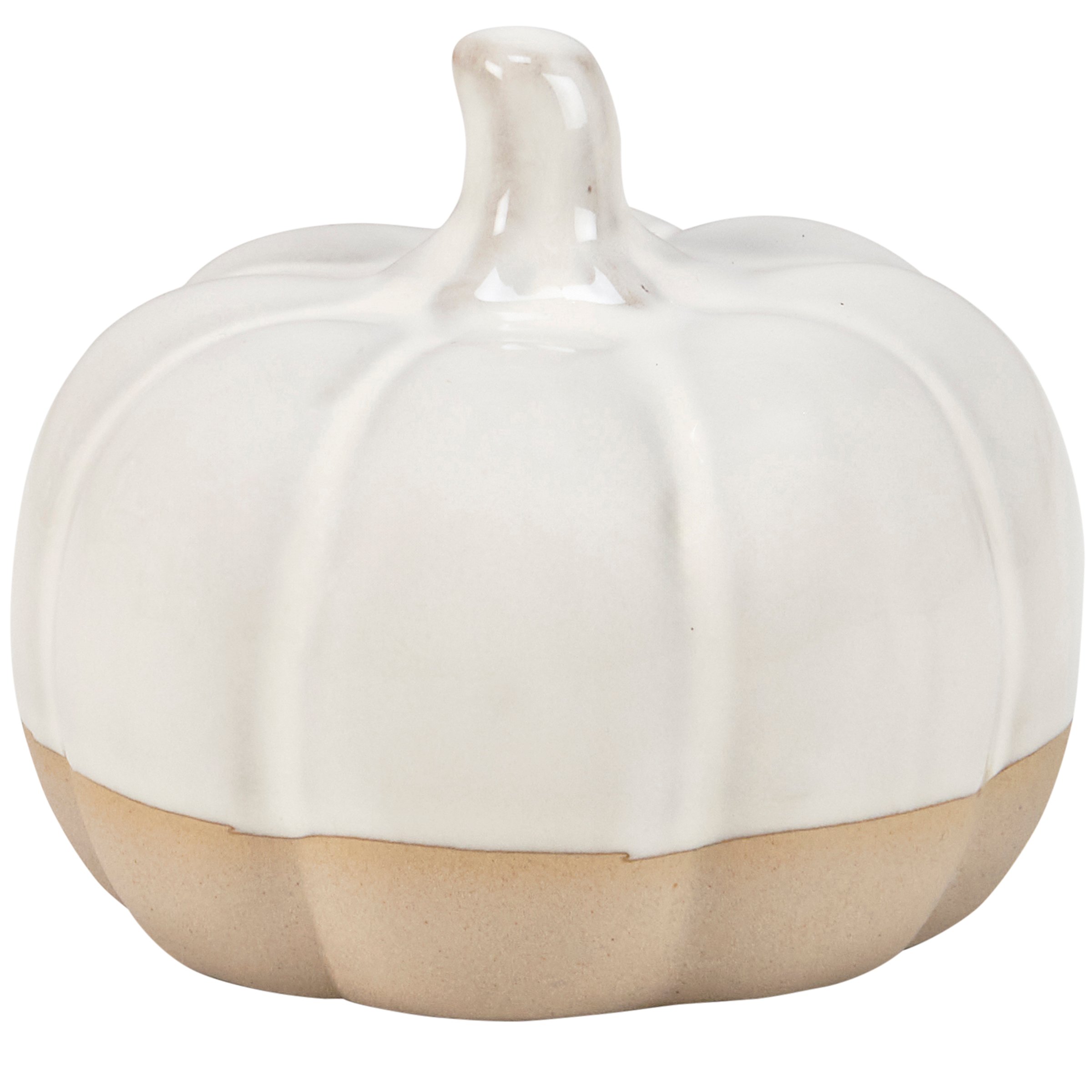 A small decorative pumpkin from our Fall & Harvest Collection displaying a cream glaze finish down to a bare ceramic base. Our small Glazed ceramic pumpkin is ideal for as a seasonal home accent and complements well with décor in the collection to create a cohesive display. A rustic fall-themed home accent with a variety of display options.