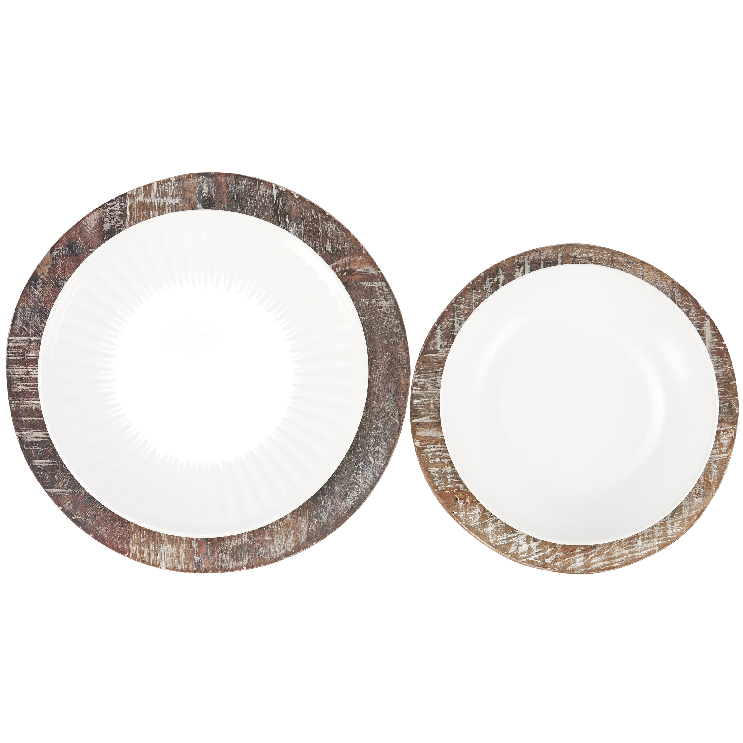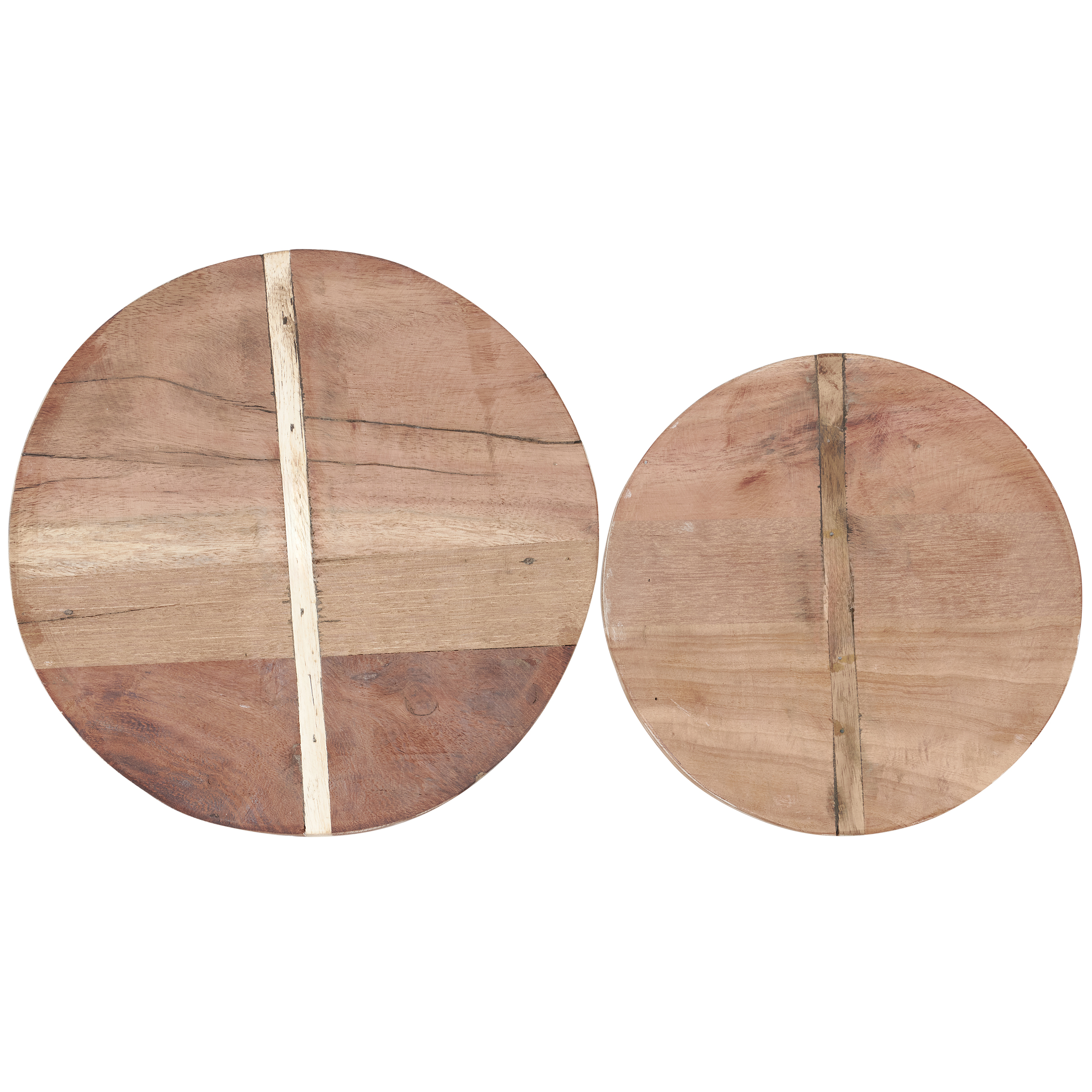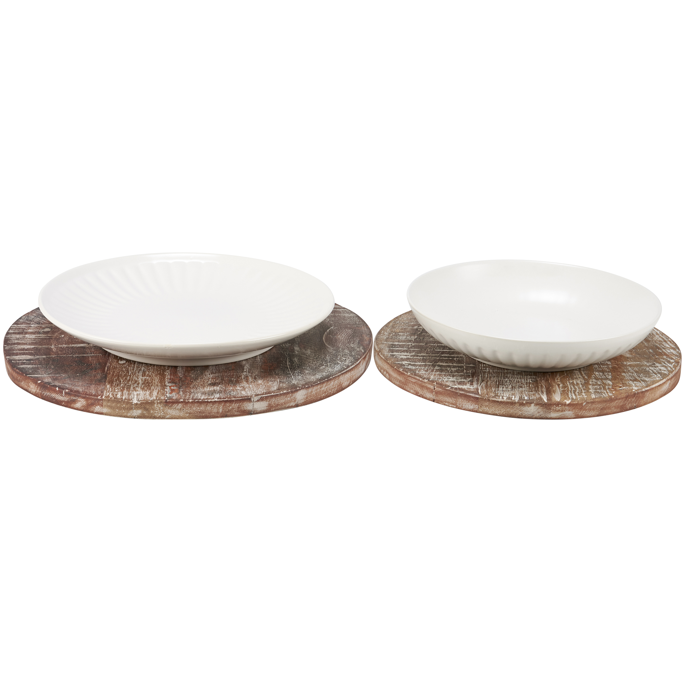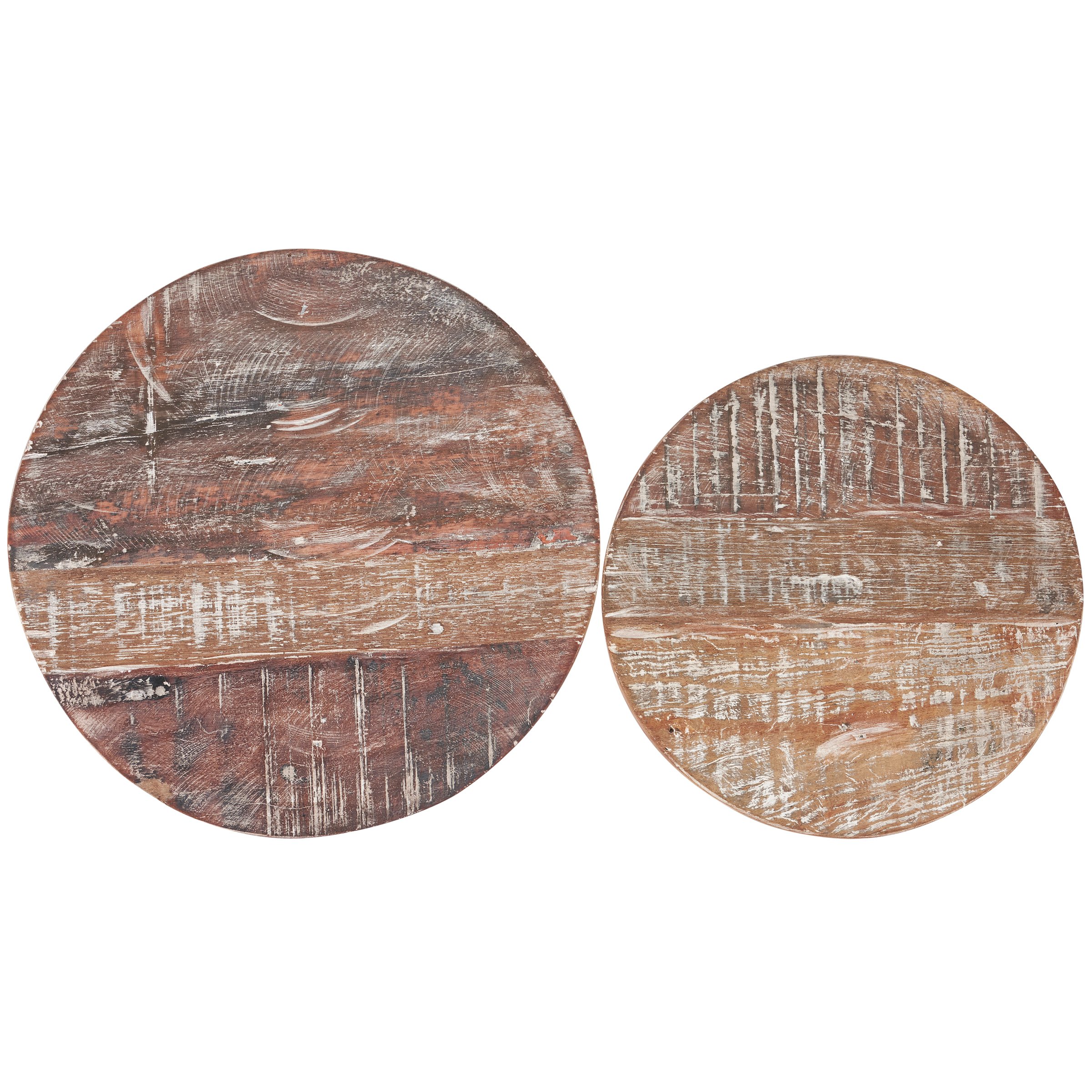 A set of wooden charger plates from our Beach Collection displaying a simple, driftwood inspired design. Charger plates feature distressed details and a wash of white paint for added texture. Due to the finishing techniques, each item may have subtle variations in shape, distressing, and finish. Our Wood Round charger set includes a 12 inch and 10 inch charger plate perfect for enhancing table settings and tableware as part of a themed tablescape. Wipe with dry cloth to clean. A set of rustic tableware that coordinates with a variety of styles.