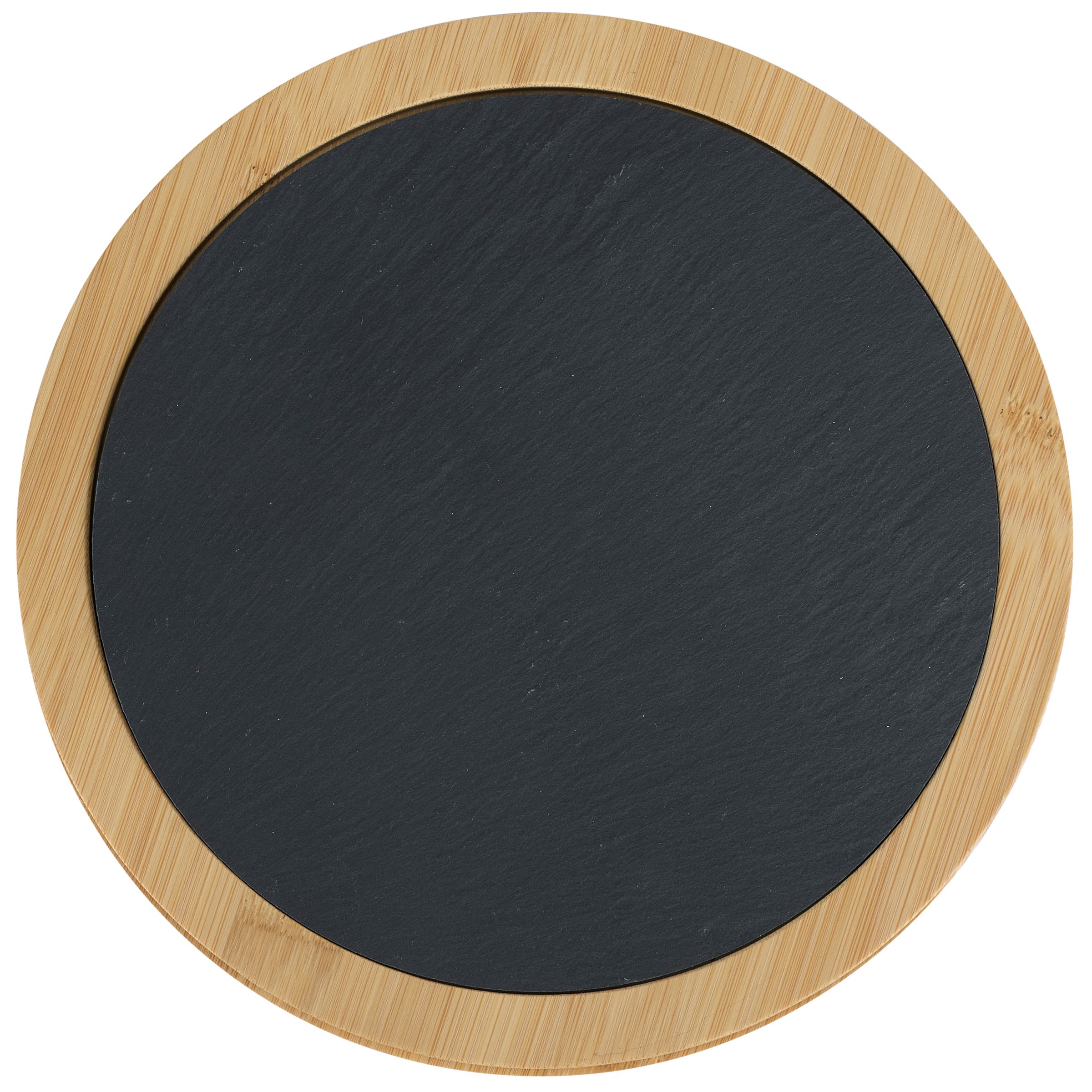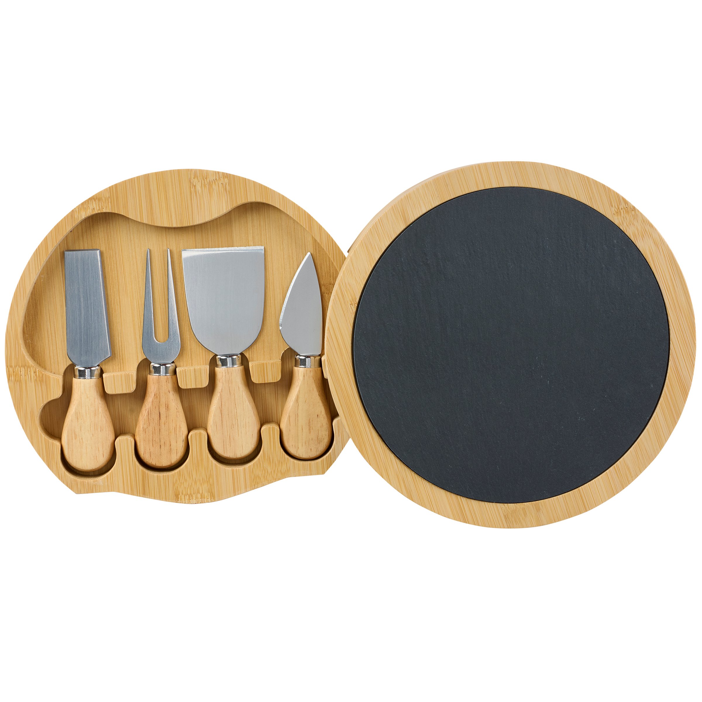 A cheese knife set featuring a slate cutting board that nests inside of a bamboo tray that swivels open to reveal space inside for holding the included 4 utensils. Cheese knife set includes a flat cheese knife, narrow plane knife, parmesan knife, and cheese fork that neatly rests inside the bamboo tray via a swivel opening for an efficiently compact design. Slate cutting board can be removed to be placed on its own or to easily clean. Bamboo tray and slate cutting board is hand wash only and includes care instructions on the back. Our Swivel Top cheese knife set is perfect for everyday kitchen use and coordinates with a variety of home decor styles.