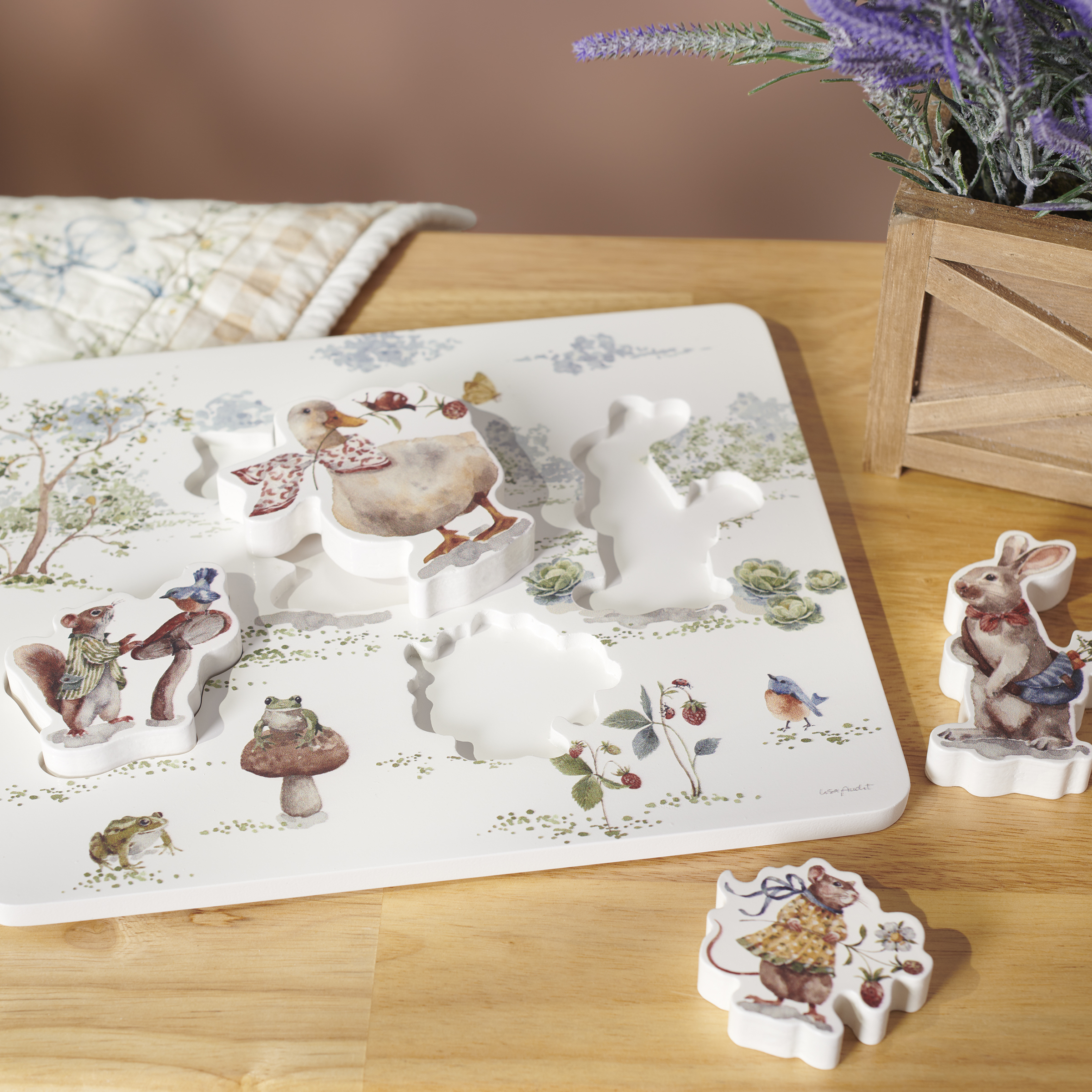 A fun wooden puzzle set from our Baby & Kids Collection displaying a charming garden animal design inspired by child's storybook illustrations. Garden design is replicated from original art hand painted in a delicate watercolor style. Kids puzzle includes 4 wooden puzzle pieces displaying unique shapes for each garden animal that easily place into their slots on the wooden puzzle board displaying a coordinating garden scene. Our Garden Friends chunky puzzle is perfect for play with children 18 months or older and looks nice on the shelf as children's room décor when not in use. Puzzle comes packaged in shrink wrap with product information displayed on the front making it great for gifting. A fun garden-themed gift for baby showers or everyday moments.