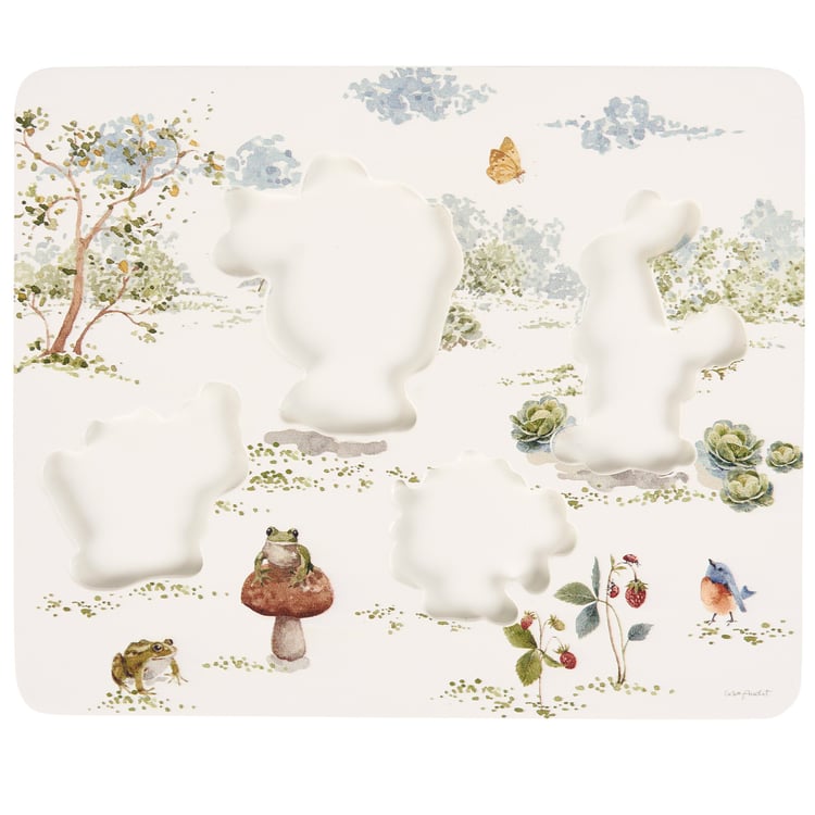 A fun wooden puzzle set from our Baby & Kids Collection displaying a charming garden animal design inspired by child's storybook illustrations. Garden design is replicated from original art hand painted in a delicate watercolor style. Kids puzzle includes 4 wooden puzzle pieces displaying unique shapes for each garden animal that easily place into their slots on the wooden puzzle board displaying a coordinating garden scene. Our Garden Friends chunky puzzle is perfect for play with children 18 months or older and looks nice on the shelf as children's room décor when not in use. Puzzle comes packaged in shrink wrap with product information displayed on the front making it great for gifting. A fun garden-themed gift for baby showers or everyday moments.