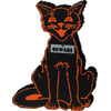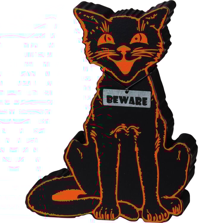 A vintage-inspired wooden chunky sitter from our Halloween Collection featuring a black and orange sitting cat design. The Beware Cat sitter has a metal plate with cut-out "Beware" sentiment.