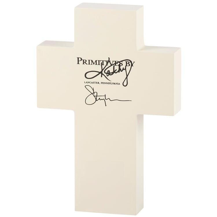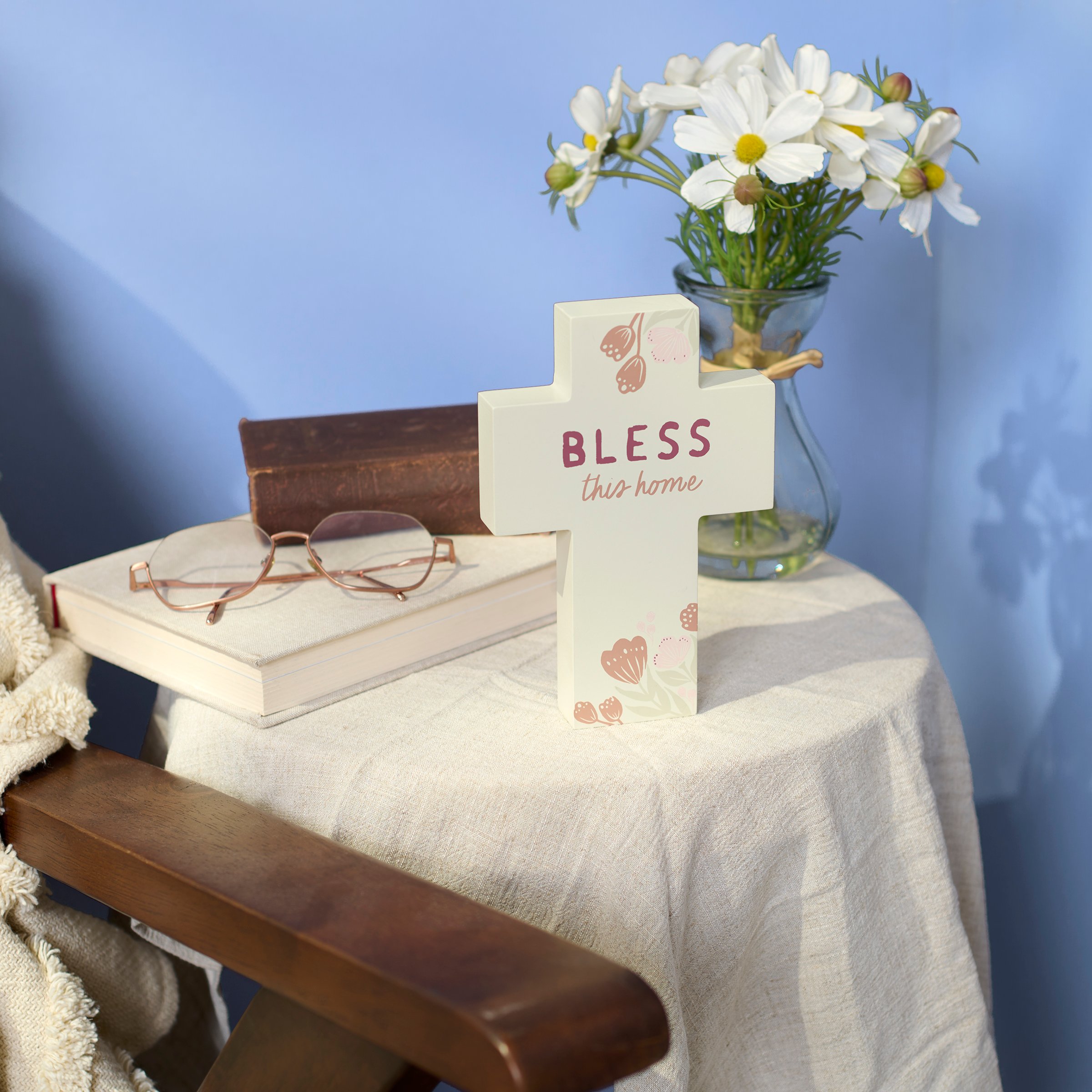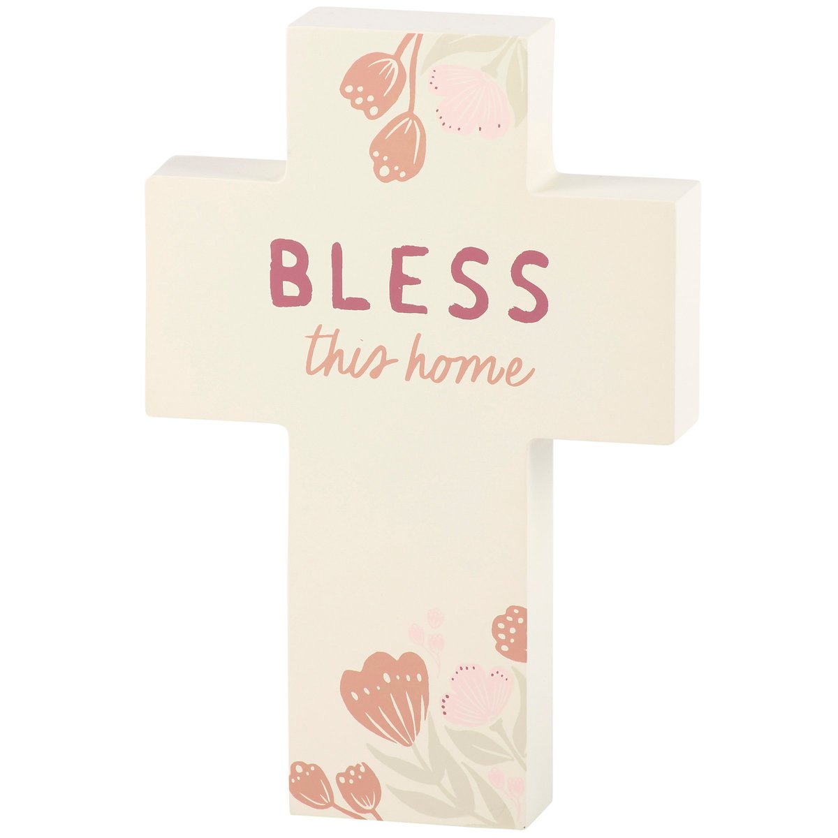 A wooden sitter from our Faith Collection cut in the shape of a cross displaying calming hand illustrated designs of flowers with an inspirational sentiment that reads "Bless This Home." Inspirational sitter features coordinating cream color on the sides and back. Our Bless This Home chunky sitter is designed to free-stand alone on flat surface for display. A faith-themed home accent that can be easily displayed in any home or work space.