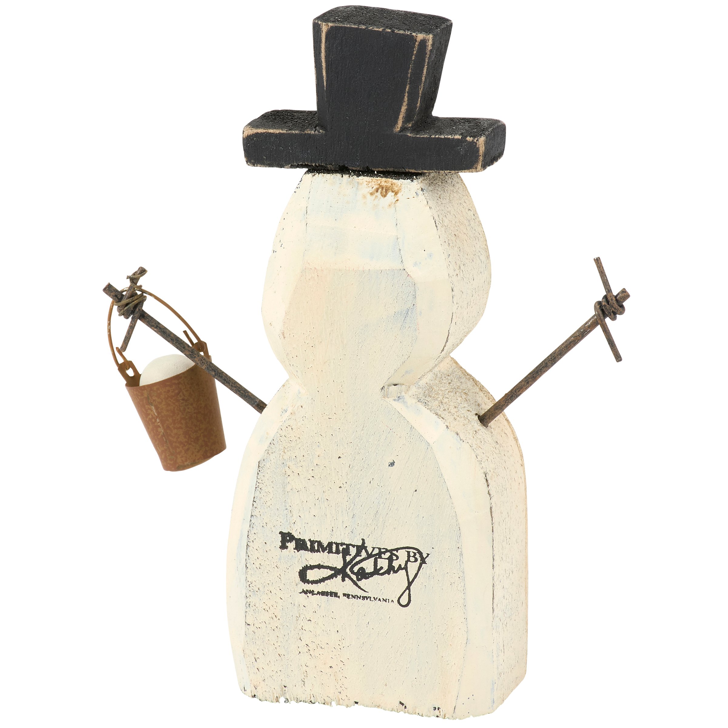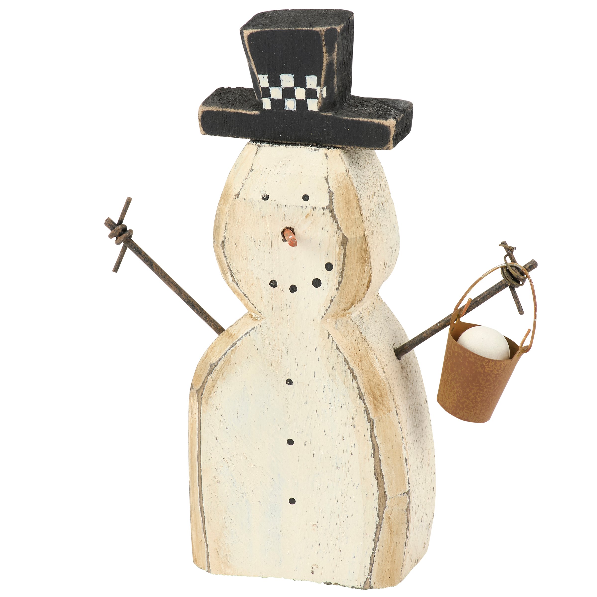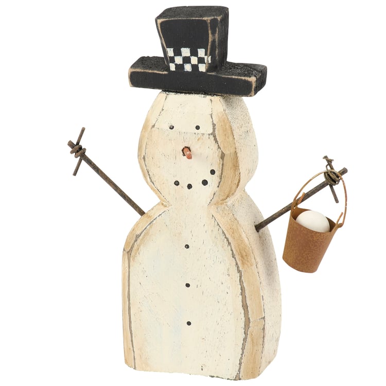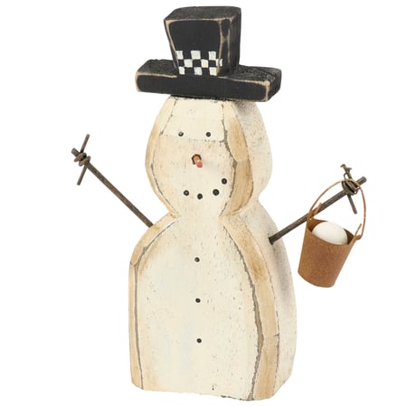 A wooden sitter from our Christmas Collection displaying a charming snowman design recreated from an original hand carved and painted piece with distressed details. This rustic snowman sitter features handmade details including twisted wire for the arms and a miniature bucket of snow hanging from its hand. Our Bucket Snowman chunky sitter is designed to free-stand on a flat surface for display. A rustic Christmas home accent that can be easily displayed in any home or work space.