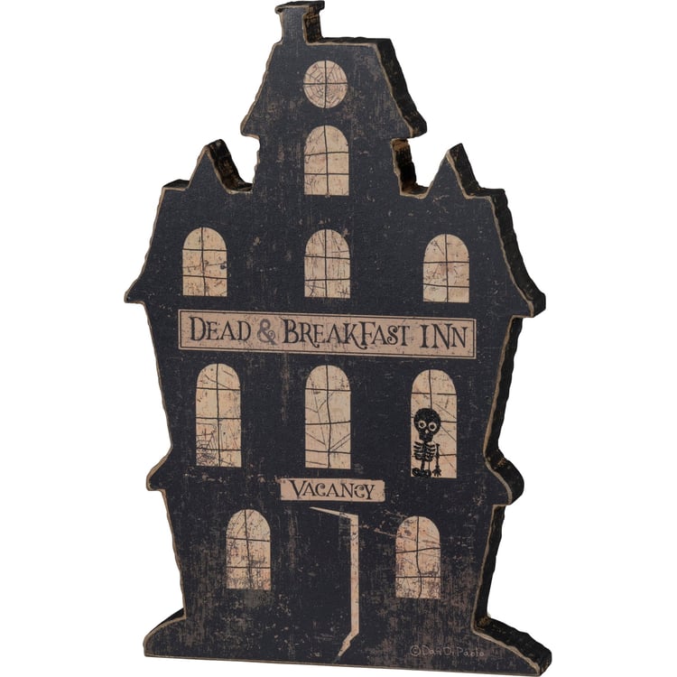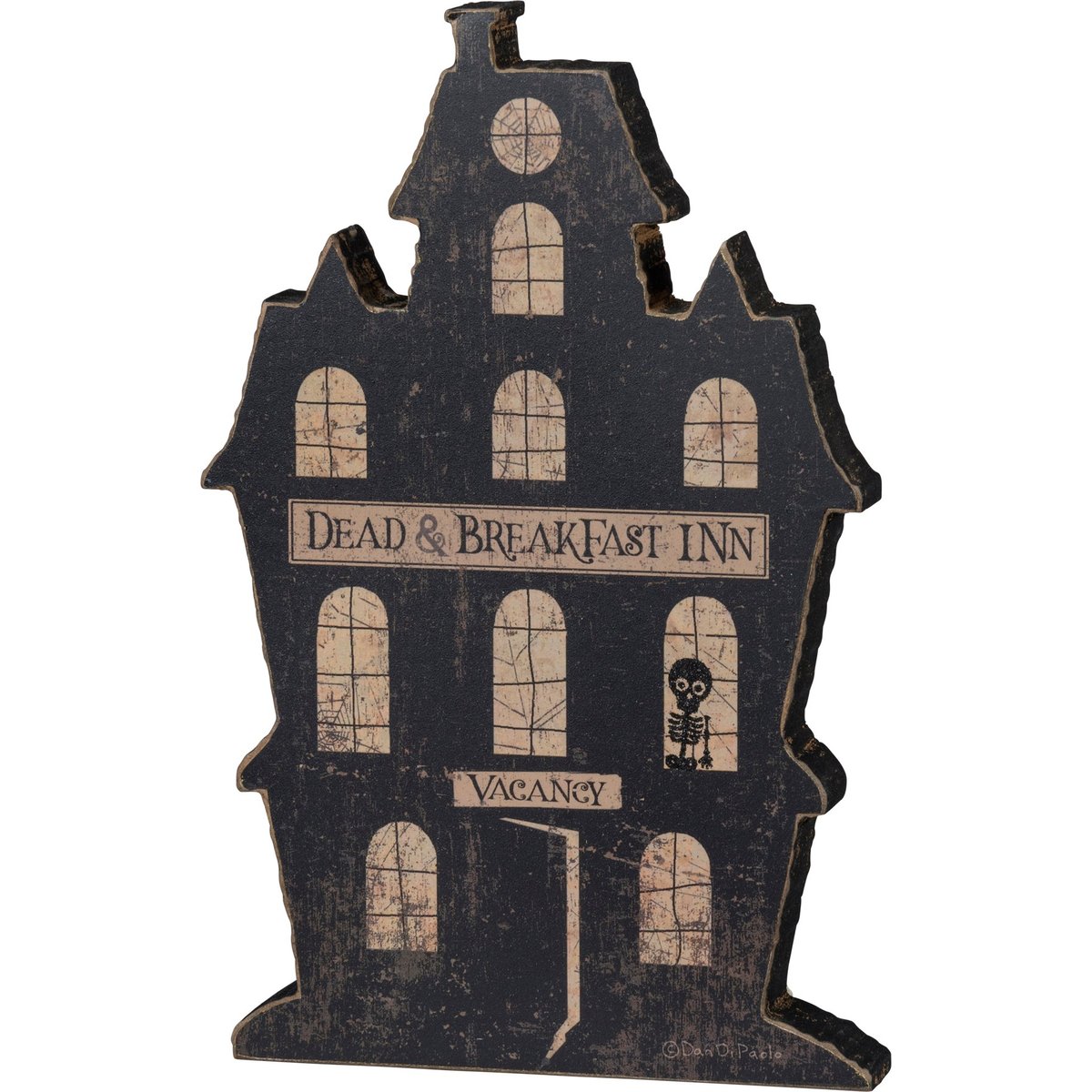 Get in the holiday spirit with this wooden chunky sitter, featuring a distressed "Dead & Breakfast Inn - Vacancy" sentiment and house and skeleton designs in a neutral palette. Complements well with coordinating styles for a cohesive collection.