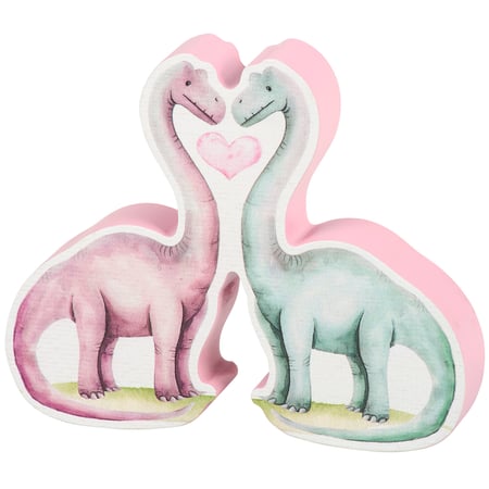 A wooden sitter from our Valentine's Day Collection cut in the shape of the displayed dinosaur themed art. Dinosaur art features a pastel pink and blue brontosaurus with a love heart between them. This Dino Valentine sitter features a coordinating pastel pink color on the sides and back. Our Dino Love chunky sitter is designed to free-stand on flat surface for display. A dinosaur-themed home accent that can be easily displayed in any home or work space.
