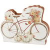 A wooden sitter from our Fall & Harvest Collection cut in the shape of the displayed design of a vintage bicycle surrounded by fall florals and pumpkins. Design is replicated from original hand painted art in a delicate watercolor style. Seasonal sitter features coordinating natural wood on sides and back. Our Fall Bike chunky sitter is designed to free-stand alone on flat surface. A charming seasonal home accent that can be easily displayed in any home or work space.